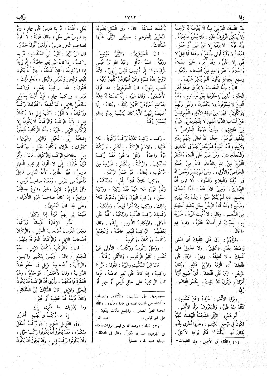 بغير اللسان العربي مما لا يعرف له ترجمة ولا يمكن الوقوف عليه فلا يجوز استعماله وأَما قوله لا رُقْىةَ إلا من عَيْنٍ أَو حُمَةٍ فمعناه لا رُقْية أولى وأَنفعُ وهذا كما قيل لا فَتىً إلا عليٌّ وقد أَمَر عليه الصلاة والسلام غير واحد من أَصحابه بالرُّقْيةِ وسَمِعَ بجماعة يَرْقُونَ فلم يُنْكِرْ عليهم قال وأَما الحديث الآخر في صفة أَهل الجنة الذي يدخلونها بغير حساب وهم الذين لا يَسْتَرقُونَ ولا يَكْتَوُون وعلى ربهم يتوكلون فهذا من صفة الأَولياء المعرضين عن أَسباب الدنيا الذين لا يلتفتون إلى شيء من علائقها وتلك درجةُ الخَواصِّ لا يَبْلُغها غيرُهم جعلنا الله تعالى منهم بمنه وكرمه فأَما العوامُّ فَمُرَخَّصٌ لهم في التداوي والمُعالجات ومن صبر على البلاء وانتظر الفرجَ من الله بالدعاء كان من جملة الخواص والأَولياء ومن لم يصبر رخص له في الرقية والعلاج والدواء أَلا ترى أَن الصدّيق رضي الله عنه لما تصدق بجميع ماله لم ينكر عليه علماً منه بيقينه وصبره ؟ ولما أَتاه الرجل بمثل بيضة الحمامة من الذهب وقال لا أَملك غيره ضربه به بحيث لو أَصابه عَقَره وقال فيه ما قال وقولُهم ارْقَ على ظَلْعِكَ أَي امْشِ واصْعد بقدر ما تطيق ولا تَحْمِلْ على نفسك ما لا تطيقه وقيل ارْقَ على ظَلْعِكَ أَي الْزَمْه وارْبَعْ عليه ويقال للرجل ارْقَ على ظَلْعِكَ أَي أَصِْلحْ أوَّلاً أمرَكَ فيقول قد رَقِيتُ بكسر القاف رُقِيّاً ومَرْقَيَا الأَنْفِ حَرْفاه عن ثعلب كأَنه منه ظَنٌّ والمعروف مَرَقَّا الأَنْفِ أَبو عمرو الرُّقَّى الشحْمة البيضاء النَّقِيَّة تكون في مَرْجِعِ الكَتِف وعليها أُخْرى مثلُها يقال لها المَأْتاةُ
