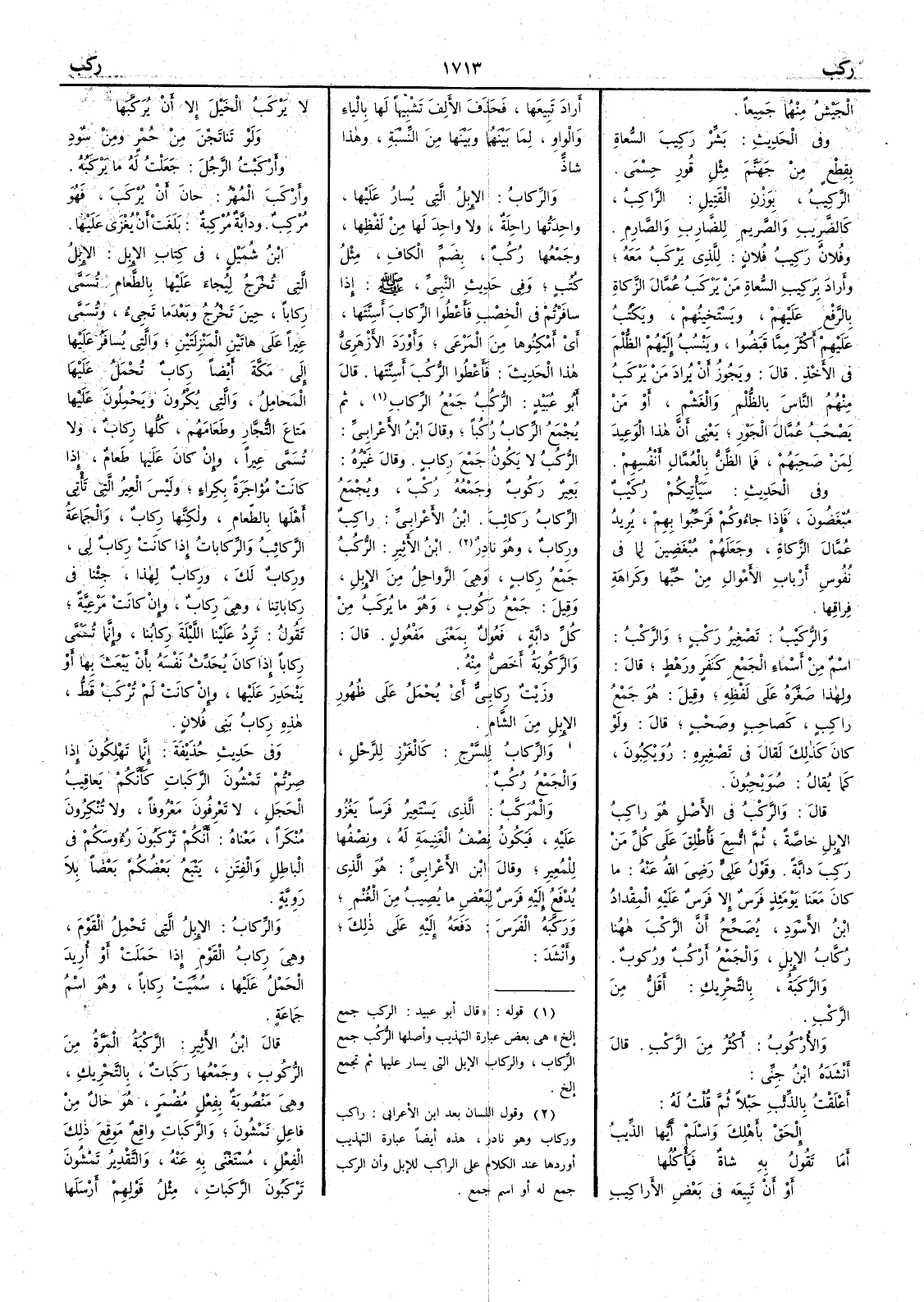 ( 2 وقول اللسان بعد ابن الأعرابي راكب وركاب وهو نادر هذه أيضاً عبارة التهذيب أوردها عند الكلام على الراكب للإبل وان الركب جمع له أو اسم جمع ) ابن الأَثير الرُّكُبُ جمعُ رِكابٍ وهي الرَّواحِلُ من الإِبِلِ وقيل جمعُ رَكُوبٍ وهو ما يُركَبُ من كلِّ دابَّةٍ فَعُولٌ بمعنى مَفْعولٍ قال والرَّكُوبة أَخَصُّ منه وزَيْتٌ رِكابيٌّ أَي يُحمل على ظُهورِ الإِبِل من الشَّامِ والرِّكابُ للسَّرْجِ كالغَرْزِ للرَّحْلِ والجمع رُكُبٌ والمُرَكَّبُ الذي يَسْتَعِيرُ فَرَساً يَغْزُو عليه فيكون نِصْفُ الغَنِيمَةِ له ونِصْفُها للمُعِيرِ وقال ابن الأَعرابي هو الذي يُدْفَعُ إِليه فَرَسٌ لبعضِ ما يُصِيبُ من الغُنْمِ ورَكَّبَهُ الفَرَسَ دفعه إِليه على ذلك وأَنشد