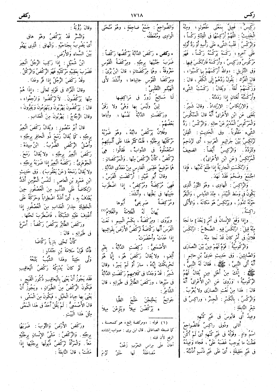 رَكِيس فعيل بمعنى مفعول ومنه الحديث اللهم أَركِسْهما في الفتنة رَكْساً والرَّكْسُ قلبُ الشيء على رأْسه أَو ردُّ أَوله على آخره رَكَسَه يَرْكُسُه رَكْساً فهو مَرْكوس ورَكِيسٌ وأَرْكَسَه فارْتَكَس فيهما وفي التنزيل واللَّه أَرْكَسهم بما كسَبوا قال الفراء يقول رَدَّهم إِلى الكفر قال ورَكَسهم لغة ويقال رَكَسْتُ الشيء وأَرْكَسْتُه لغتان إِذا رَدَدْتَه والاْرتِكاسُ الارتداد وقال شمر بلغني عن ابن الأَعرابي أَنه قال المَنْكُوس والمَرْكُوس المُدْبر عن حاله والرَّكْسُ ردُّ الشيء مقلوباً وفي الحديث الفِتَنُ تَرْتَكِسُ بين جراثيم العرب أَي تَزْدَحِمُ وتتردد والرَّكِيسُ أَيضاً الضعيف المُرْتَكِسُ عن ابن الأَعرابي وارْتَكَسَتِ الجارية إِذا طلع ثَدْيُها فإِذا اجتمع وضَخُمَ فقد نَهَدَ والرَّاكِسُ الهادي وهو الثور الذي يكون في وَسَطِ البَيْدَرِ عند الدِّياسِ والبقر حوله تدور ويَرْتَكِسُ هو مكانه والأُنثى راكسة وإِذا وقع الإِنسان في أَمر ما نجا منه قيل ارْتَكَسَ فيه الصحاح ارْتَكَسَ فلانٌ في أَمر كان قد نجا منه والرَّكُوسِيَّةُ قوم لهم دين بين النصارى والصابئين وفي حديث عديّ بن حاتم أَنه أَتى النبي صلى اللَّه عليه وسلم فقال له النبي صلى اللَّه عليه وسلم إِنك من أَهل دين يقال لهم الرَّكُوسِيَّة وروي عن ابن الأَعرابي أَنه قال هذا من نعت النصارى ولا يعرّب والرِّكْسُ بالكسر الجِسْرُ وراكِسٌ في شعر النابغة وعِيدُ أَبي قابُوسَ في غيرِ كُنْهه أَتاني ودوني راكِسٌ فالضَّواجِعُ اسم واد وقوله في غير كنهه أَي لم أَكن فعلت ما يوجب غضبه عليَّ فجاء وعيده في غير حقيقة أَي على غير ذنب أَذنبته والضواجع جمع ضاجعة وهو مُنْحَنَى الوادي ومُنْعَطَفُه