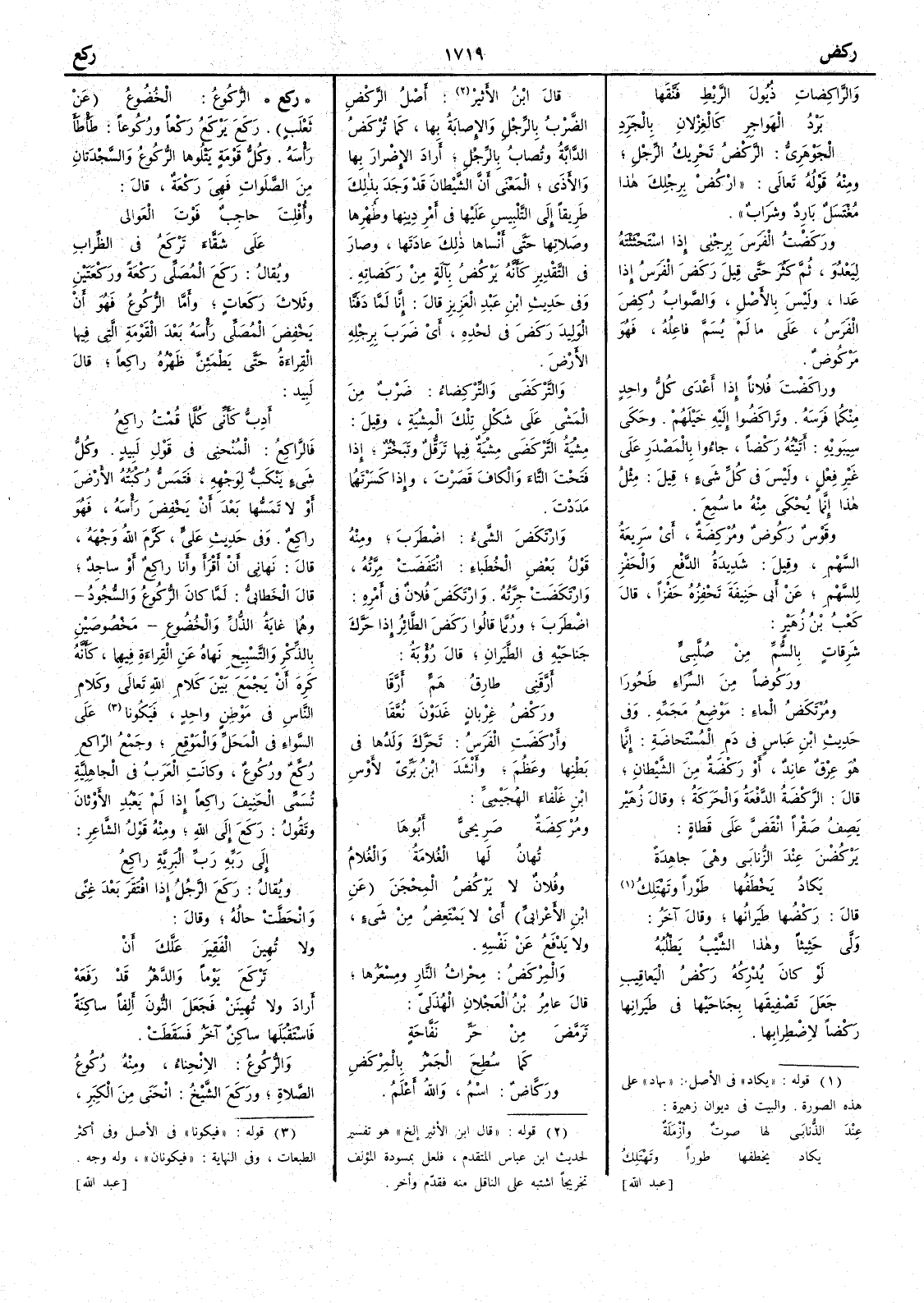 ( ركع ) الرُّكوع الخُضوع عن ثعلب رَكع يَرْكَع رَكْعاً ورُكُوعاً طَأْطأَ رأْسَه وكلُّ قَوْمة يتلوها الركوع والسجْدتان من الصلوات فهِي رَكْعة قال وأُفْلِتَ حاجِبٌ فَوْتَ العَوالي على شَقّاء تَرْكَعُ في الظِّرابِ ويقال رَكع المُصلّي ركعة وركعتين وثلاث رَكعات وأَما الرُّكوع فهو أَن يَخْفِض المصلي رأْسه بعد القَوْمة التي فيها القِراءة حتى يطمئن ظهره راكعاً قال لبيد أَدِبُّ كأَنِّي كُلَّما قُمْتُ راكِع فالرّاكِعُ المنحني في قول لبيد وكلُّ شيء يَنْكَبُّ لوجهه فَتَمسُّ ركبتُه الأَرضَ أَو لا تمسها بعد أَن يخفض رأْسه فهو راكع وفي حديث علي كرم الله وجهه قال نَهاني أَن أَقرأَ وأَنا راكع أَو ساجد قال الخطابي لما كان الركوع والسجود وهما غاية الذُّلِّ والخُضوع مخصوصين بالذكر والتسبيح نهاه عن القراءة فيهما كأَنه كَرِه أَن يجمع بين كلام الله تعالى وكلام الناس في مَوْطِن واحد فيكونا على السَّواء في المَحَلِّ والمَوْقِع وجمع الرّاكع رُكَّع ورُكُوع وكانت العرب في الجاهلية تسمي الحَنِيف راكعاً إِذا لم يَعْبُد الأَوثان وتقول رَكَع إِلى الله ومنه قول الشاعر إِلى رَبِّه رَبِّ البَرِيّةِ راكِع ويقال ركَع الرجل إِذا افْتَقَرَ بعد غِنًى وانْحَطَّت حالُه وقال ولا تُهِينَ الفَقِيرَ عَلَّكَ أَن تركَعَ يَوْماً والدهْرُ قد رَفَعَهْ أَراد ولا تُهِينَن فجعل النون أَلفاً ساكنة فاستقبلها ساكن آخر فسقطت والرُّكوع الانحناء ومنه رُكوع الصلاة وركَع الشيخُ انحنى من الكِبَر