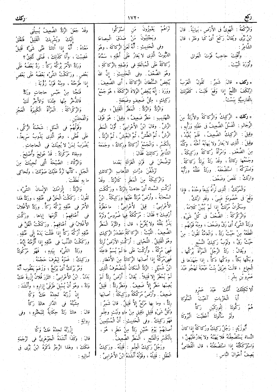 ( ركف ) قال شمر تقول العرب ارْتَكَفَ الثلْجُ إذا وقع فثبت كقولك بالفارسية بِبَسْتْ ( ركك ) الرَّكِيكُ والرُّكاكةُ والأَرَكّ من الرجال الفَسْل الضعيف في عقله ورأْيه وقيل الرَّكِيكُ الضعيف فلم يقيد وقيل الذي لا يَغار ولا يَهابُه أهلُه وكله من الضعف وامرأَة رُكاكةً وركِيكة وجمعها ركاك وقد رَكّ يَرِكّ رَكاكةً واسْتَرَكَّه استضعفه ورَكَّ عقلُه ورأيُه وارْتَكَّ نقص وضعف والمُرْتَكّ الذي تَراه بليغاً وحده فإذا وقع في خصومة عَيِيَ وقد ارْتَكّ وسكران مُرْتَكّ إذا لم يبين كلامه والرَّكْرَكةُ الضعف في كل شيء ورَكّ الشيءُ أَي رقّ وضعف ومنه قولهم اقطعْه من حيث رَكّ والعامة تقول من حيث رَقّ وثوب رَكِيكُ النسج ويقال رَكّ الرجل المرأَة يرُكّها وبَكّها بَكّاً ودَكّها دَكّاً إذا جهدها في الجماع قالت خِرْنقِ بنت عَبْعَبَة تهجو عبد عمرو بن بشر ألا ثكِلَتْكَ أُمُّكَ عَبْدَ عَمْروٍ أَبا الخزياتِ آخَيْتَ المُلوكا هُمُ رَكُّوكَ للورِكَيْنِ رَكّاً ولو سَأَلوك أَعطيتَ البُرُوكا أَبو زيد رجل ركيك ورُكاكة إذا كان النساء يستضعفنهُ فلا يَهَبْنَه ولا يَغار عليهن واسْتَرْكَكْتُه إذا استضعفته قال القطامي يصف أَحوال الناس تَرَاهم يَغْمِزُون من اسْتَرَكّوا ويَجْتَنبون مَنْ صَدَقّ المِصاعا وفي الحديث أَنه لعن الرُّكاكةَ وهو الدَّيّوث الذي لا يغَار على أَهله سماه رُكاكةً على المبالغة في وصفه بالرَّكاكة وهو الضعف وفي الحديث إن الله يبغض السلطان الرُّكاكةَ أَي الضعيف وورد إنه يبغض الولاةَ الرَّكَكَة هو جمع رَكِيكٍ مثل ضَعِيف وضَعَفة والرِّكُّ والرَّكُّ المطر القليل وفي التهذيب مطر ضعيف وقيل هو فوق الرَّشِّ وقال ابن الأعرابي أَول المطر الرَّشّ ثم الطَّشّ ثم البَغْش ثم الرَّك بالكسر والجمع أَرْكاك ورِكاك وجمعه الشاعر رَكائك فقال توَضِّحْنَ في قَرْنِ الغَزالةِ بعدما تَرَشَّفْن ذَرَّاتِ اللذِّهاب الرَّكائِكِ والرَّكِيكةُ من المطر كالرَّكّ وقد أَرَكَّت السماء أَي جاءت بالركّ ورَكَّكَت السحابة وأَرض مُرَكٌّ عليها ورَكيكة ابن الأعرابي قيل لأعرابي ما مَطَرَة أرضِك ؟ فقال مركَّكَةٌ فيها ضروس وثَرْد يَذُرُّ بَقْلَه ولا يُقَرِّحُ قال والثَّرْدُ المطر الضعيف الليث الرَّكاكةُ مصدر الرَّكيكِ وهو الثقليل اللحياني أَرَكّت الأَرض تُرِكّ فهي مِرِكَّة وأُرِكَّتْ على ما لم يسم فاعله فهي مُرَكَّة إذا أَصابها الرِّكاكُ من الأمطار ابن شميل الرِّكّ المكان المضْعُوف الذي لم يمطر إلا قليلاً يقال أَرض رِكّ لم يصبها مطر إلاضعيف ومطر رِكّ قليل ضعيف وأَرض مُرَكَّكة ورَكِيكة أَصابها رِكّ وما بها مرتع إلا قليل قال شمر وكل شيء قليل دقيق من ماء ونبت وعلم فهو رَكيك وفي الحديث أَن المسلمين أَصابهم يوم حُنين رِكّ من مطر هو بالكسر والفتح المطر الضعيف ورجل رَكيك العلم قليله ورَكيك العقل قليله وقوله أنشده ابن الأَعرابي وقد جَعَل الرَّكُّ الضعيفُ يُسِيلني إِليك ويُشْريكَ القليلُ فتَغْلَقُ ومعناه أَنه إذا أَتاك عني شيء قليل غضبت وأَنا كذلك فمتى نتفق ؟ ورَكَّ الأَمرَ يَرُكُّه رَكّاً رد بعضه على بعض ورَكَكْتُ الشيء بعضَه على بعضٍ إذا طرحته ومنه قول رؤبة فنَجِّنا من حَبْس حاجاتٍ ورَكّْ فالذُّخْرُ منها عندنا والأَجْرُ لَكْ والرَّكْراكةُ المرأَة الكبيرة العجز والفخذين وقولهم في المثل شحمةُ الرُّكَّى على فُعْلى وهو الذي يذوب سريعاً يضرب لمن لا يُعِينُك في الحاجات وسقاء مَرْكوك قد عُولِج وأُصْلِح والرَّكَّاءُ الصيحة التي تُجيبك من الجبل كأَنها تردّ عليك صوتك وتحاكي ما به نطقتَ والرَّكّ إلزامُك الإنسانَ الشيء تقول رَكَكْتُ الحق في عنقه ورَكَّ هذا الأَمرَ في عنقه يَرُكُّه رَكّاً ورَكَّ الأغلالَ في أَعناقهم أَلزمها إياها ورَكَّت الأَغلالُ في أعناقهم ورَكَكْت الغُلَّ في عنقه أَرُكُّه رَكّاً إذا غللت يده إلى عنقه ورَكَكْتُ الذَّنْب في عنقه إذا أَلزمته إياها ورَكّ الشيءَ بيده فهو مَرْكوك ورَكِيكٌ 