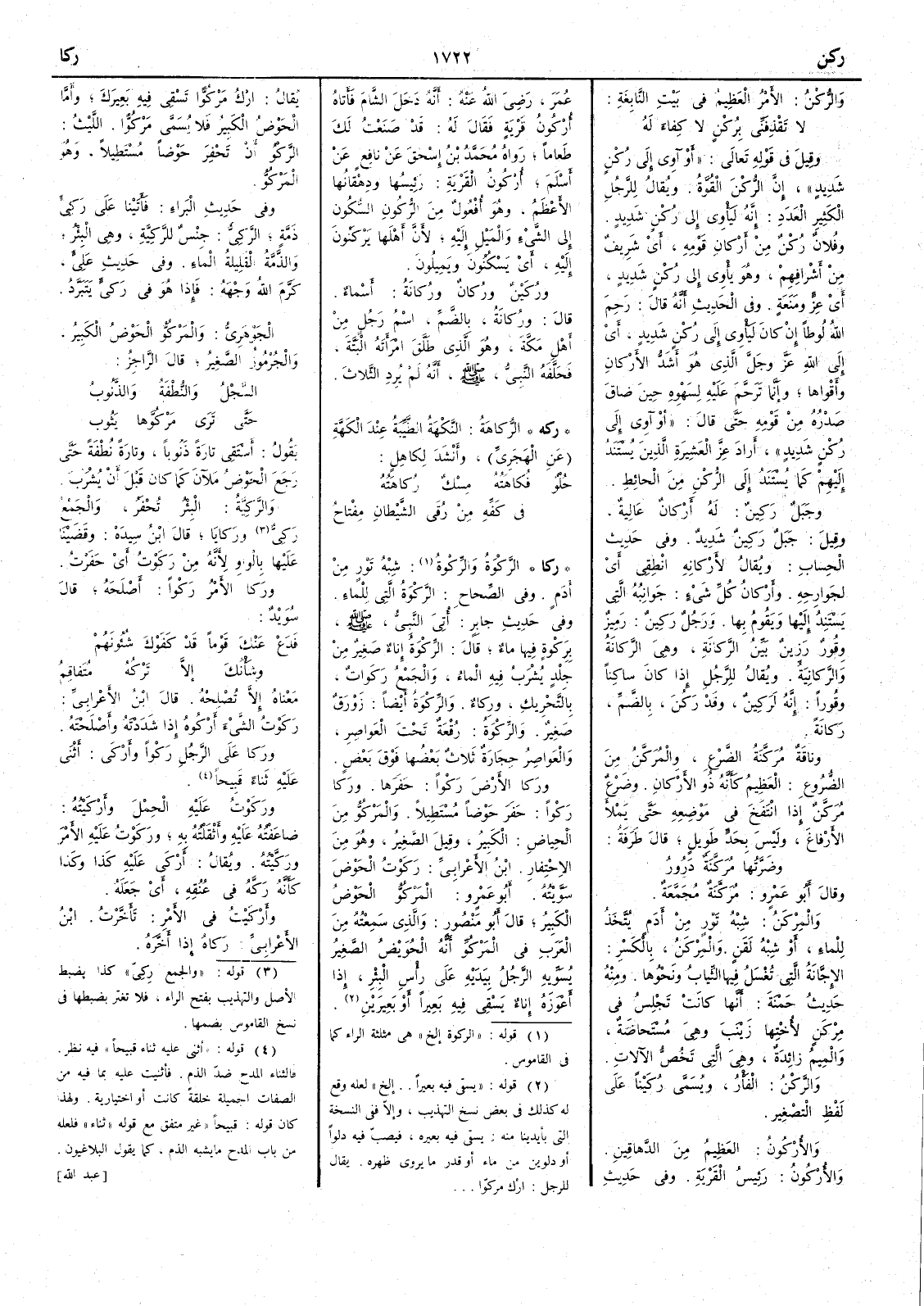 والرُّكْنُ الأَمر العظيم في بيت النابغة لا تَقْذِفَنِّي برُكْنٍ لا كِفاءَ له وقيل في قوله تعالى أَو آوِي إلى رُكْن شديد إن الرُّكْن القُوَّة ويقال للرجل الكثير العدد إنه ليأْوي إلى رُكْن شديد وفلان رُكْنٌ من أَركان قومه أَي شريف من أَشرافهم وهو يأْوي إلى رُكْن شديد أَي عز ومَنَعة وفي الحديث أَنه قال رَحِمَ الله لُوطاً إن كان لَيأْوي إلى رُكْن شديد أَي إلى الله عز وجل الذي هو أشد الأَركان وأَقواها وإنما ترحم عليه لسهوه حين ضاق صدره من قومه حتى قال أَو آوي إلى ركن شديد أَراد عز العشيرة الذين يستند إليهم كما يستند إلى الركن من الحائط وجبل ركِينٌ له أَركان عالية وقيل جَبَل رَكِينٌ شديد وفي حديث الحساب ويقال لأَرْكانه انْطقي أَي لجوارحه وأَركانُ كل شيء جَوانبه التي يستند إليها ويقوم بها ورجل رَكِين رَميز وَقُور رَزِينٌ بَيّنُ الرَّكانة وهي الرَّكانة والرَّكانِيَةُ ويقال للرجل إذا كان ساكناً وقوراً إنه لرَكِينٌ وقد رَكُنَ بالضم رَكانة وناقة مُرَكَّنَةُ الضَّرْع والمُرَكَّنُ من الضروع العظيم كأَنه ذو الأَركان وضرع مُرَكَّنٌ إذا انتفخ في موضعه حتى يَمْلأَ الأَرفاغ وليس بحَدّ طويلٍ قال طرفة وضَرَّتُها مُرَكَّنَةٌ دَرورُ وقال أَبو عمرو مُرَكَّنَة مُجَمَّعَة والمِرْكَن شبه تَوْرٍ من أَدَمٍ يتخذ للماء أَو شبه لَقَن والمِرْكَنُ بالكسر الإجَّانة التي تغسل فيها الثياب ونحوها ومنه حديث حَمْنَةَ أَنها كانت تجلس في مِرْكَن لأُختها زينب وهي مستحاضة والميم زائدة وهي التي تخض الآلات والرَّكْنُ الفَأْرُ ويُسَمَّى رُكَيْناً على لفظ التصغير والأُرْكُون العظيم من الدَّهاقين والأُرْكون رئيس القرية وفي حديث عمر رضي الله عنه أَنه دخل الشام فأَتاه أُرْكُونُ قَرْيةٍ فقال له قد صنعتُ لك طعاماً رواه محمد بن إسحق عن نافع عن أَسلم أُرْكُون القرية رئيسها ودِهْقانها الأَعظم وهو أُفْعُول من الرُّكُون السكون إلى الشيء والميل إليه لأَن أَهلها يَرْكَنُون إليه أَي يسكنون ويميلون ورُكَيْنٌ ورُكَانٌ ورُكانَةُ أَسماء قال ورُكانَة بالضم اسم رجل من أهل مكة وهو الذي طَلَّق امرأَته البتة فحلفه النبي صلى الله عليه وسلم أَنه لم يرد الثلاثَ