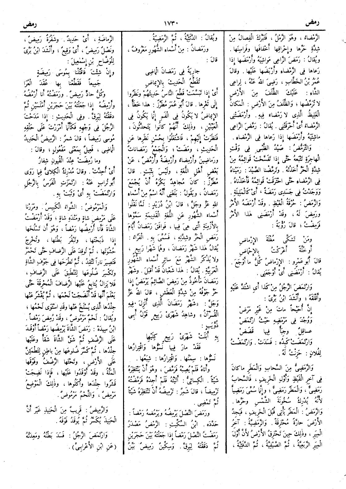 الرَّمْضاءُ وهو الرمل فتبرك الفصال من شدة حرها وإِحراقها أَخفافَها وفَراسِنَها ويقال رَمَضَ الراعي مواشِيَه وأَرمَضَها إِذا رَعاها في الرَّمْضاءِ وأَرْبَضَها عليها وقال عمر بن الخطاب رضي اللّه عنه لراعي الشاءِ عليكَ الظَّلَفَ من الأَرضِ لا تُرَمِّضْها والظَّلَفُ من الأَرض المكان الغليظ الذي لا رَمْضاءَ فيه وأَرْمَضَتْني الرَّمْضاءُ أَي أَحرقتني يقال رَمَّضَ الراعي ماشيته وأَرمَضَها إِذا رعاها في الرَّمْضاء والتَّرَمُّضُ صَيْدُ الظبي في وقت الهاجرة تتبعه حتى إِذا تَفَسَّخَت قوائمُه من شدة الحر أَخذته وترَمَّضْنا الصيْدَ رَمَيْناه في الرمضاء حتى احترقت قوائمُه فأَخذناه ووجَدْتُ في جسَدِي رَمَضةً أَي كالمَلِيلةِ والرَّمَضُ حُرْقةُ الغَيْظِ وقد أَرْمَضَه الأَمرُ ورَمِضَ له وقد أَرْمَضَني هذا الأَمرُ فَرَمِضْتُ قال رؤبة ومَنْ تَشَكَّى مُغْلةَ الإِرْماضِ أَو خُلَّةً أَعْرَكْتُ بالإِحْماضِ قال أَبو عمرو الإِرْماضُ كلُّ ما أَوْجَع يقال أَرْمَضَني أَي أَوْجَعَني وارْتَمَضَ الرجل من كذا أَي اشتدّ عليه وأَقْلَقَه وأَنشد ابن بري إِنَّ أُحيحاً ماتَ من غيرِ مَرَضْ ووُجْدَ في مَرْمَضِه حيث ارْتمض عساقِلٌ وجِبَأٌ فيها قَضَضْ وارْتَمَضَتْ كَبِدُه فسَدَتْ وارْتَمضْتُ لفلانٍ حَزِنْتُ له والرَّمَضِيُّ من السحاب والمطر ما كان في آخر القَيْظِ وأَوّلِ الخَرِيف فالسحابُ رَمَضِيٌّ والمطر رَمَضِيٌّ وإِنما سمي رَمَضِيّاً لأِنه يدرك سُخونة الشمس وحرّها والرَّمَضُ المطر يأْتي قُبُلَ الخريف فيجد الأَرض حارّة محترقة والرَّمَضِيَّةُ آخر المِيَرِّ وذلك حين تحترِقُ الأَرض لأَنَّ أَوّلَ المِيَرّ الرَّبَعِيَّةُ ثم الصَّيْفِيّةُ ثم الدَّفَئِيّةُ ويقال الدَّثَئِيّةُ ثم الرَّمَضِيّةُ ورمضانُ من أَسماء الشهور معروف قال جاريةٌ في رمضانَ الماضي تُقَطِّعُ الحديثَ بالإِيماضِ أَي إِذا تبَسَّمَتْ قطَّعَ الناسُ حديثهم ونظروا إِلى ثَغْرِها قال أَبو عمر مُطَرِّزٌ هذا خطأٌ الإِيماضُ لا يكون في الفم إِنما يكون في العينين وذلك أَنهم كانوا يتحدّثون فنظرت إِليهم فاشتغلوا بحسن نظرها عن الحديث ومضت والجمع رَمَضاناتٌ ورَماضِينُ وأَرْمِضاءُ وأَرْمِضةٌ وأَرْمُضٌ عن بعض أَهل اللغة وليس بثبَت قال مطرز كان مجاهد يكره أَن يُجْمَعَ رمضانُ ويقول بلغني أَنه اسم من أَسماء اللّه عزّ وجلّ قال ابن دريد لما نقلوا أَسماء الشهور عن اللغة القديمة سموها بالأَزمنة التي هي فيها فوافَقَ رمضانُ أَيامَ رَمَضِ الحرّ وشدّته فسمّي به الفَرّاء يقال هذا شهر رمضان وهما شهرا ربيع ولا يذكر الشهر مع سائر أَسماء الشهور العربية يقال هذا شعبانُ قد أَقبل وشهر رمضانَ مأْخوذ من رَمِضَ الصائم يَرْمَضُ إِذا حَرّ جوْفُه من شدّة العطش قال اللّه عزّ وجلّ شهر رمضان الذي أُنزل فيه القرآن وشاهدُ شهْرَيْ ربيع قول أَبي ذؤيب به أَبَلَتْ شَهْرَيْ رَبِيعٍ كِلَيْهِما فَقَد مارَ فيها نَسْؤُها واقْتِرارُها نَسْؤُها سِمَنُها واقْتِرارُها شِبَعُها وأَتاه فلم يُصِبْه فَرَمَّضَ وهو أَن ينتظِره شيئاً الكسائي أَتيته فلم أَجِدْه فرَمَّضْتُه تَرْمِيضاً قال شمر تَرْمِيضُه أَن تنتظره شيئاً ثم تَمْضي ورَمَضَ النَّصْلَ يَرْمِضُه ويَرْمُضُه رَمْضاً حدّده ابن السكيت الرَّمْضُ مصدر رَمَضْتُ النصْلَ رَمْضاً إِذا جعلته بين حجرين ثم دقَقْتَه ليَرِقَّ وسِكِّينٌ رَمِيضٌ بيّنُ الرَّماضةِ أَي حديدٌ وشفْرةٌ رَمِيضٌ ونَصْلٌ رَمِيضٌ أَي وَقِيعٌ وأَنشد ابن بري للوضّاح بن إِسمعيل وإِنْ شِئْتَ فاقْتُلْنا بِمُوسَى رَمِيضةٍ جَمِيعاً فَقَطِّعْنا بِها عُقَدَ العُرا وكل حادٍّ رَمِيضٌ ورَمَضْتُه أَنا أَرْمُضُه وأَرْمِضُه إِذا جعلته بين حجرين أَمْلَسَيْنِ ثم دقَقْته ليَرِقّ وفي الحديث إِذا مَدَحْتَ الرجل في وجهه فكأَنما أَمْرَرْتَ على حلقه مُوسَى رَمِيضاً قال شمر الرَّمِيضُ الحديد الماضي فَعِيل بمعنى مفعول وقال وما رُمِضَتْ 