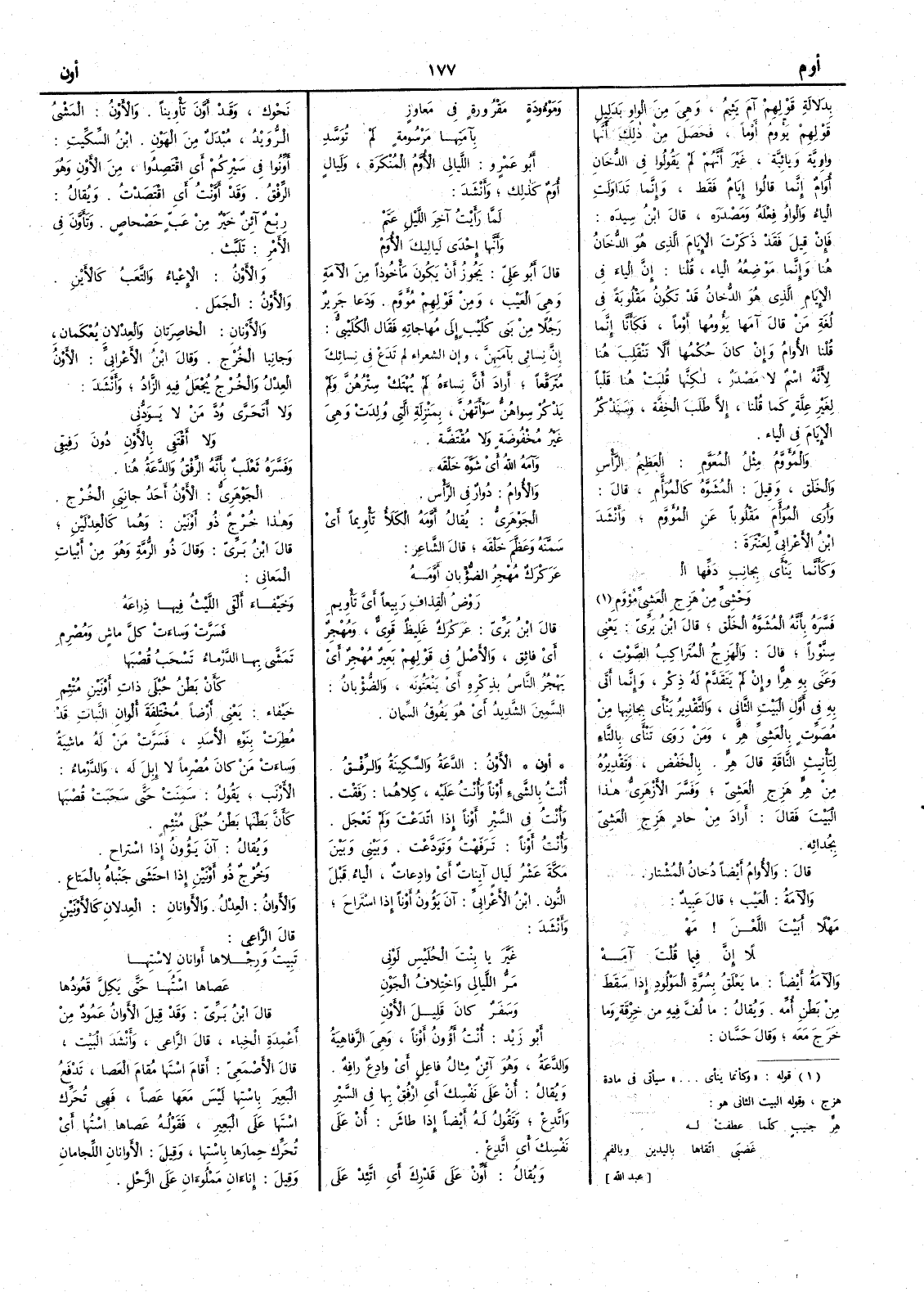 ( أون ) الأَوْنُ الدَّعَةُ والسكينةُ والرِّفْقُ أُنْتُ بالشيء أَوْناً وأُنْتُ عليه كلاهما رَفَقْت وأُنْتُ في السير أَوْناً إذا اتّدَعْت ولم تَعْجَل وأُنْتُ أَوْناً تَرَفّهْت وتوَدَّعْت وبيني وبين مكة عشرُ ليالٍ آيناتٌ أَي وادعاتٌ الياءُ قبل النون ابن الأَعرابي آنَ يَؤُونُ أَوْناً إذا اسْتَراحَ وأَنشد غَيَّر يا بنتَ الحُلَيْسِ لَوْني مَرُّ اللَّيالي واخْتِلافُ الجَوْنِ وسَفَرٌ كانَ قليلَ الأَوْنِ أَبو زيد أُنْتُ أَؤُونُ أَوْناً وهي الرَّفاهية والدَّعَةُ وهو آئنٌ مثال فاعِلٍ أَي وادعٌ رافِهٌ ويقال أُنْ على نفسك أَي ارْفُقْ بها في السير واتَّدِعْ وتقول له أَيضاً إذا طاشَ أُنْ على نفسِك أَي اتَّدِعْ ويقال أَوِّنْ على قَدْرِك أَي اتَّئِدْ على نحوِك وقد أَوَّنَ تأْويناً والأَوْنُ المَشْيُ الرُّوَيْدُ مبدل من الهَوْنِ ابن السكيت أَوِّنُوا في سَيْرِكم أَي اقْتَصِدوا من الأَوْنِ وهو الرِّفْقُ وقد أَوَّنْتُ أَي اقْتَصَدْتُ ويقال رِبْعٌ آئنٌ خيرٌ من عَبٍّ حَصْحاصٍ وتأَوَّنَ في الأَمر تَلَبَّث والأَوْنُ الإعياءُ والتَّعَبُ كالأَيْنِ والأَوْنُ الجمَل والأَوْنانِ الخاصِرتان والعِدْلان يُعْكَمانِ وجانِبا الخُرج وقال ابن الأَعرابي الأَوْنُ العِدْل والخُرْجُ يُجْعل فيه الزادُ وأَنشد ولا أَتَحَرَّى وُدَّ مَنْ لا يَوَدُّني ولا أَقْتَفي بالأَوْنِ دُونَ رَفِيقي وفسره ثعلب بأَنه الرِّفْقُ والدَّعَةُ هنا الجوهري الأَوْنُ أَحدُ جانِبَي الخُرج وهذا خُرْجٌ ذو أَوْنَين وهما كالعِدْلَيْنِ قال ابن بري وقال ذو الرمة وهو من أَبيات المعاني وخَيْفاء أَلْقَى الليثُ فيها ذِراعَه فَسَرَّتْ وساءتْ كلَّ ماشٍ ومُصْرِمِ تَمَشَّى بها الدَّرْماءُ تَسْحَبُ قُصْبَها كأَنْ بطنُ حُبْلى ذاتِ أَوْنَينِ مُتْئِمِ خَيْفاء يعني أَرضاً مختلفة أَلوان النباتِ قد مُطِرت بِنَوْءِ الأَسدِ فسَرَّت مَنْ له ماشِيةٌ وساءَت مَنْ كان مُصْرِماً لا إبِلَ له والدَّرْماءُ الأَرْنَب يقول سَمِنَت حتى سَحَبَت قُصْبَها كأَنّ بَطْنَها بطنُ حُبْلى مُتْئِمٍ ويقال آنَ يَؤُونُ إذا استراح وخُرْجٌ ذو أَوْنَينِ إذا احْتَشى جَنْباه بالمَتاعِ والأَوانُ العِدْلُ والأَوانانِ العِدْلانِ كالأَوْنَينِ قال الراعي تَبِيتُ ورِجْلاها أَوانانِ لاسْتِها عَصاها اسْتُها حتى يكلَّ قَعودُها قال ابن بري وقد قيل الأَوانُ عَمُودٌ من أََعْمِدة الخِباء قال الراعي وأَنشد البيت قال الأَصمعي أقامَ اسْتَها مُقامَ العَصا تدفعُ البعيرَ باسْتِها ليس معها عصاً فهي تُحرِّك اسْتَها على البعيرِ فقولُه عصاها اسْتُها أَي تُحرِّك حِمارَها باسْتِها وقيل الأَوانانِ اللِّجامانِ وقيل إناءَانِ مَمْلُوءَانِ على الرَّحْل