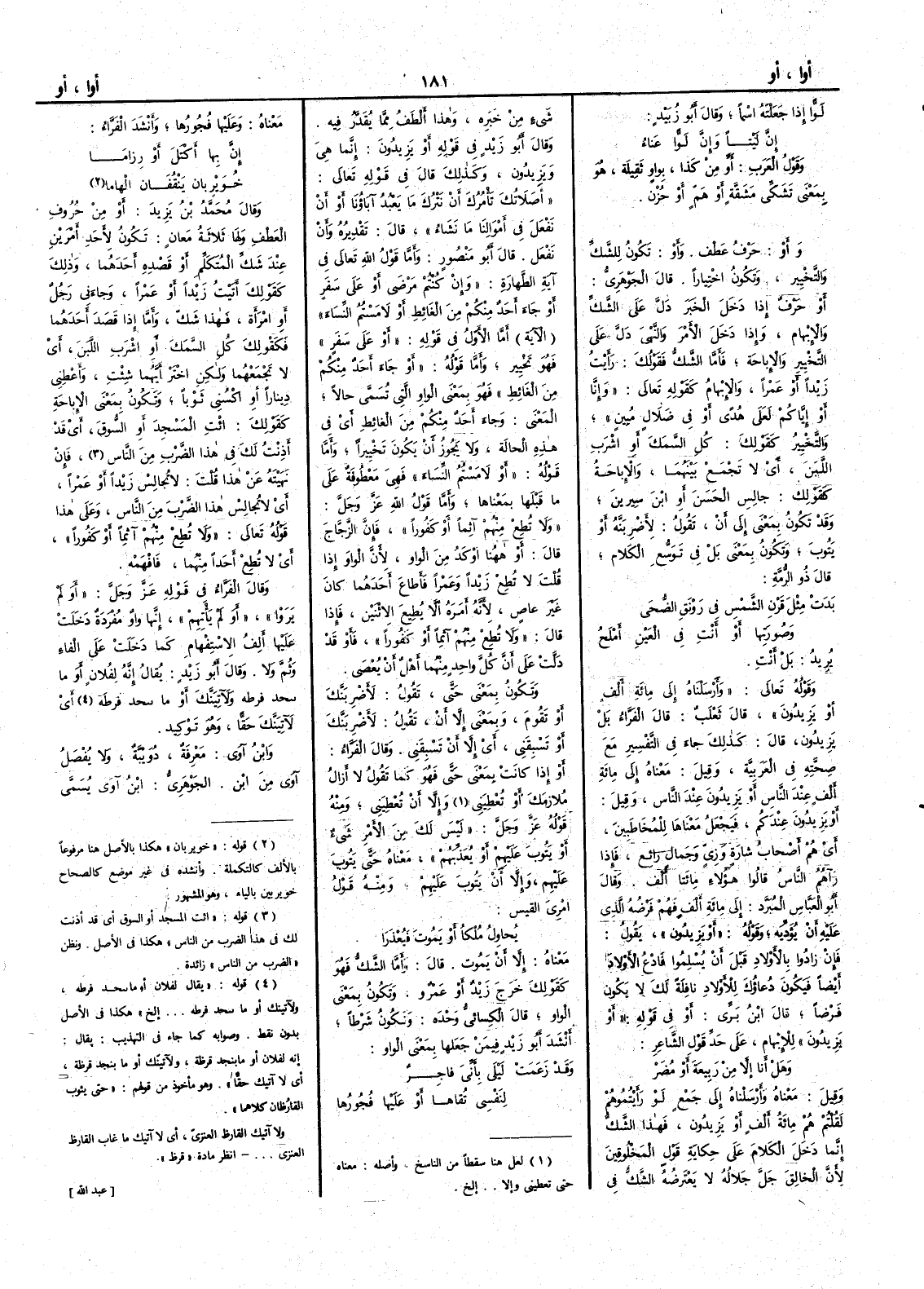 ( * قوله « ائت المسجد أو السوق أي قد أذنت لك في هذا الضرب من الناس » هكذا في الأصل ) فإِن نهيته عن هذا قلت لا تجالس زيداً أَو عمراً أَي لا تجالس هذا الضرب من الناس وعلى هذا قوله تعالى ولا تطع منهم آثماً أَو كفوراً أَي لا تطع أَحداً منهما فافهمه وقال الفراء في قوله عز وجل أَوَلم يروا أَوَلم يأْتهم إِنها واو مفردة دخلت عليها أَلف الاستفهام كما دخلت على الفاء وثم ولا وقال أَبو زيد يقال إِنه لفلان أَو ما تنحد فرطه ولآتِينك أَو ما تنحد فرطه