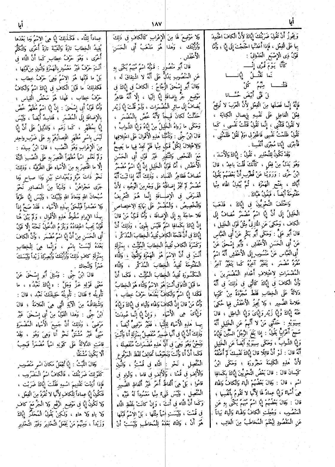 ويجوز أَن تقول ضَرَبْتُكَ إِيَّاكَ لأَن الكاف اعْتُمِدَ بها على الفِعل فإذا أَعَدْتَها احْتَجْتَ إلى إِيَّا وأَما قولُ ذي الإِصْبَعِ العَدْواني كأَنَّا يومَ قُرَّى إِنْ نَما نَقْتُلُ إِيَّانا قَتَلْنا منهُم كُلَّ فَتًى أَبْيَضَ حُسَّانا فإِنه إنما فَصلَها من الفعل لأَن العرب لا تُوقع فِعْلَ الفاعل على نفسه بإيصال الكناية لا تقول قَتَلْتُني إنما تقول قَتَلْتُ نفسِي كما تقول ظَلَمْتُ نَفْسِي فاغفر لي ولم تقل ظَلَمْتُني فأَجْرى إِيَّانا مُجْرَى أَنْفُسِنا وقد تكون للتحذير تقول إِيَّاك والأَسدَ وهو بدل من فعل كأَنك قُلْتَ باعِدْ قال ابن حَرِّى وروينا عن قطرب أَن بعضهم يقول أَيَّاك بفتح الهمزة ثم يبدل الهاء منها مفتوحة أَيضاً فيقول هَيَّاكَ واختلف النحويون في إِيَّاكَ فذهب الخليل إلى أَنَّ إِيَّا اسم مضمر مضاف إلى الكاف وحكي عن المازني مثل قول الخليل قال أَبو عليّ وحكى أَبو بكر عن أَبي العباس عن أَبي الحسن الأَخفش وأَبو إسحق عن أَبي العباس عن منسوب إلى الأَخفش أَنه اسم مفرد مُضْمر يتغير آخره كما يتغير آخر المُضْمَرات لاختلاف أَعداد المُضْمَرِينَ وأَنَّ الكاف في إِيَّاكَ كالتي في ذَلِكَ في أَنه دلالةٌ على الخطاب فقط مَجَرَّدَةٌ من كَوْنِها عَلامةَ الضمير ولا يُجيزُ الأَخفش فيما حكي عنه إِيَّاكَ وإِيّا زَيْدٍ وإِيَّايَ وإِيَّا الباطِل قال سيبويه حدّثني من لا أَتَّهِمُ عن الخليل أَنه سمع أَعرابيّاً يقول إذا بلَغ الرجل السِّتِّينَ فإِيَّاه وإِيَّا الشَّوابِّ وحكى سيبويه أَيضاً عن الخليل أَنه قال لو أَن قائلاً قال إِيَّاك نَفْسِك لم أُعنفه لأَن هذه الكلمة مجرورة وحكى ابن كيسان قال قال بعض النحويين إِيَّاكَ بكمالها اسم قال وقال بعضهم الياء والكاف والهاء هي أَسماء وإِيَّا عِمادٌ لها لأَنها لا تَقُوم بأَنفسها قال وقال بعضهم إِيَّا ايم مُبْهَم يُكْنَى به عن المنصوب وجُعِلَت الكاف والهاء والياء بياناً عن المقصود لِيُعْلَم المُخاطَبُ من الغائب ولا موضع لها من الإِعراب كالكاف في ذلك وأَرَأَيْتَك وهذا هو مذهب أَبي الحسن الأَخفش قال أَبو منصور قوله اسم مُبهم يُكْنى به عن المنصوب يدل على أَنه لا اشتاق له وقال أَبو إسحق الزَّجاجُ الكافُ في إِيَّاكَ في موضع جرّ بإضافة إِيَّا إليها إلا أَنه ظاهر يُضاف إلى سائر المُضْمَرات ولو قلت إِيَّا زَيدٍ حدَّثت لكان قبيحاً لأَنه خُصَّ بالمُضْمَر وحكى ما رواه الخليل من إِيَّاهُ وإِيَّا الشَّوابِّ قال ابن جني وتأَملنا هذه الأَقوال على اختلافها والاعْتِلالَ لكل قول منها فلم نجِد فيها ما يصح مع الفحص والتنقير غَيرَ قَوْلِ أَبي الحسن الأَخفش أَما قول الخليل إِنَّ إيّا اسم مضمر مضاف فظاهر الفساد وذلك أَنه إِذا ثبت أَنه مضمر لم تجز إِضافته على وجه من الوجوه لأَن الغَرَض في الإِضافة إِنما هو التعريف والتخصيص والمضمر على نهاية الاختصاص فلا حاجة به إلى الإِضافة وأَمَّا قول من قال إنَّ إِيَّاك بكمالها اسم فليس بقويّ وذلك أَنَّ إيّاك في أَن فتحة الكاف تفيد الخطاب المذكر وكسرة الكاف تفيد الخطاب المؤنث بمنزلة أَنت في أَنَّ الاسم هو الهمزة والنون والتاء المفتوحة تفيد الخطاب المذكر والتاء المكسورة تفيد الخطاب المؤنث فكما أَن ما قبل التاء في أَنت هو الاسم والتاء هو الخطاب فكذا إيّا اسم والكاف بعدها حرف خطاب وأَمّا مَن قال إن الكاف والهاء والياء في إِيَّاكَ وإِيّاه وإِيَّايَ هي الأَسماء وإِنَّ إِيَّا إنما عُمِدَت بها هذه الأَسماء لقلتها فغير مَرْضِيّ أَيضاً وذلك أَنَّ إِيَّا في أَنها ضمير منفصل بمنزلة أَنا وأَنت ونحن وهو وهي في أَن هذه مضمرات منفصلة فكما أَنَّ أَنا وأَنت ونحوهما تخالف لفظ المرفوع المتصل نحو التاء في قمت والنون والأَلف في قمنا والأَلف في قاما والواو في قامُوا بل هي أَلفاظ أُخر غير أَلفاظ الضمير المتصل وليس شيء منها معموداً له غَيْرُه وكما أَنَّ التاء في أَنتَ وإن كانت بلفظ التاء في قمتَ وليست اسماً مثلها بل