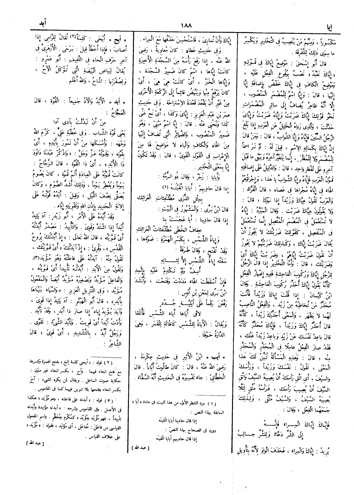 ( * قوله « وكذلك ضربتهم إلى قوله قال وأما إلخ » كذا بالأصل ) لا يجوز أَن تقول ضَرَبْت إياك وزَيْداً أَي وضَرَبْتُك قال وأَما التحذير إذا قال الرجل للرجل إِيَّاكَ ورُكُوبَ الفاحِشةِ ففِيه إضْمارُ الفعل كأَنه يقول إِيَّاكَ أُحَذِّرُ رُكُوبَ الفاحِشةِ وقال ابن كَيْسانَ إذا قلت إياك وزيداً فأَنت مُحَذِّرٌ مَن تُخاطِبهُ مِن زَيد والفعل الناصب لهما لا يظهر والمعنى أُحَذِّرُكَ زَيْداً كأَنه قال أُحَذِّرُ إِيَّاكَ وزَيْداً فإيَّاكَ مُحَذَّر كأَنه قال باعِدْ نَفْسَك عن زيد وباعِدْ زَيْداً عنك فقد صار الفعل عاملاً في المُحَذَّرِ والمُحَذَّرِ منه قال وهذه المسأَلة تبين لك هذا المعنى تقول نفسَك وزَيداً ورأْسَكَ والسَّيْفَ أَي اتَّقِ رَأْسَك أَن يُصِيبه السَّيْفُ واتَّقِ السَّيْفَ أَن يُصِيبَ رَأْسَك فرأْسُه مُتَّقٍ لئلا يُصِيبَه السيفُ والسَّيْف مُتَّقًى ولذلك جمعهما الفِعْل وقال فإِيَّاكَ إِيَّاكَ المِراءَ فإِنَّه إلى الشَّرِّ دَعَّاءٌ وللشَّرِّ جالِبُ يريد إِيَّاكَ والمِراء فحذف الواو لأَنه بتأْويل إِيَّاكَ وأَنْ تُمارِيَ فاستحسن حذفها مع المِراء وفي حديث عَطاء كان مُعاويةُ رضي الله عنه إذا رَفَع رأْسَه من السَّجْدةِ الأَخِيرةِ كانَتْ إِيَّاها اسم كان ضمير السجدة وإِيَّاها الخبر أَي كانت هِيَ هِيَ أَي كان يَرْفَع منها ويَنْهَضُ قائماً إلى الركعة الأُخرى من غير أَن يَقْعُد قَعْدةَ الاسْتِراحة وفي حديث عمر بن عبد العزيز إيايَ وكذا أَي نَحِّ عنِّي كذا ونَحِّني عنه قال إِيّا اسم مبني وهو ضمير المنصوب والضمائر التي تُضاف إليها من الهاء والكاف والياء لا مَواضِعَ لها من الإعراب في القول القويّ قال وقد تكون إيَّا بمعنى التحذير وأَيايا زَجْرٌ وقال ذو الرمة إذا قال حادِيِهِمْ أَيايا اتَّقَيْتُه بِمِثْل الذُّرَا مُطْلَنْفِئاتِ العَرائِكِ قال ابن بري والمشهور في البيت إذا قال حاديِنا أَيا عَجَسَتْ بِنا خِفَافُ الخُطى مُطْلَنْفِئاتُ العَرائكِ وإياةُ الشمسِ بكسر الهمزة ضَوْءُها وقد تفتح وقال طَرَفةُ سَقَتْه إِياةُ الشمْسِ إِلا لِثاتِه أُسِفَّ ولم تَكْدِمْ عَلَيْهِ بإِثْمِدِ فإن أَسقطت الهاء مَدَدْت وفتحت وأَنشد ابن بري لمَعْنِ بن أَوْسٍ رَفَّعْنَ رَقْماً علَى أَيْلِيَّةٍ جُدُدٍ لاقَى أَيَاها أَياءَ الشَّمْسِ فَأْتَلَقا ويقال الأَياةُ لِلشَّمْس كالهالةِ للقمر وهي الدارة حولها