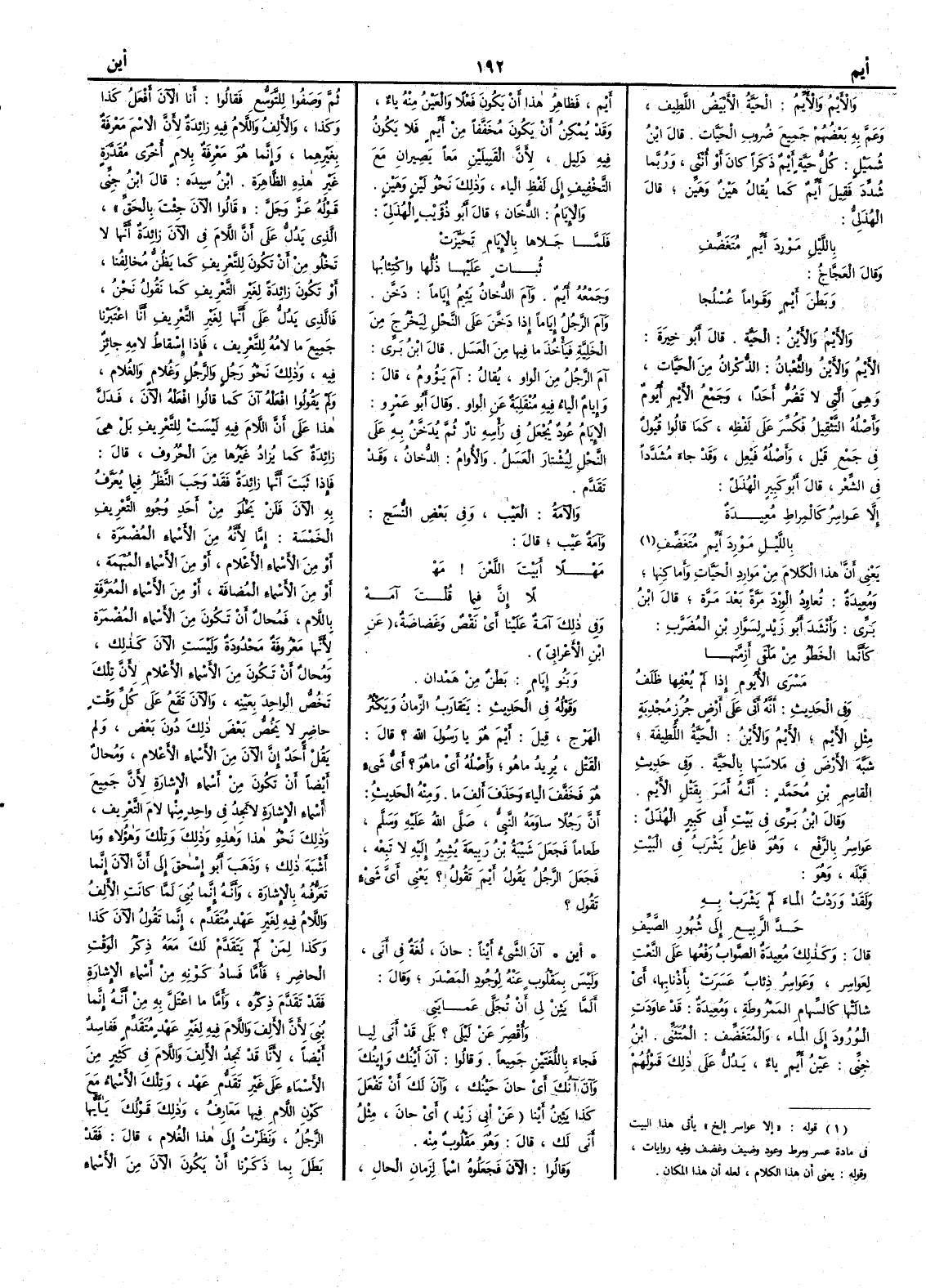 يعني أن هذا الكلام من مَوارِد الحيَّات وأَماكِنها ومُعِيدة تُعاوِد الوِرْد مرّة بعد مرة قال ابن بري وأَنشد أَبو زيد لسوار بن المضرب كأَنَّما الخَطْو من مَلْقَى أَزِمَّتِها مَسْرَى الأُيُومِ إذا لم يُعْفِها ظَلَفُ وفي الحديث أنه أَتَى على أَرض جُزُرٍ مُجْدِبةٍ مثل الأَيْم الأَيْمُ والأَيْنُ الحيَّة اللَّطِيفة شبَّه الأَرض في مَلاسَتِها بالحيَّة وفي حديث القاسم بن محمد أَنه أَمَرَ بِقَتْلِ الأَيْمِ وقال ابن بري في بيت أبي كبير الهذلي عَواسِرُ بالرفع وهو فاعل يَشْرب في البيت قبله وهو ولقد وَرَدْتُ الماء لم يَشْرَبْ به حَدَّ الرّبيعِ إلى شُهورِ الصَّيِّفِ قال وكذلك مُعِيدة الصوابُ رَفْعُها على النَّعْت لِعَواسِر وعَواسِرُ ذِئابٌ عَسَرت بأَذْنابِها أَي شالَتْها كالسِّهام المَمْروُطَةِ ومُعِيدة قد عاوَدت الوُرودَ إلى الماء والمُتَغَضِّف المُتَثَنِّي ابن جني عَيْنُ أَيِّمٍ ياءٌ يدلُّ على ذلك قولهم أَيْم فظاهر هذا أن يكون فَعْلاً والعينُ منه ياءٌ وقد يمكن أن يكون مخففاً من أَيِّم فلا يكون فيه دليل لأن القَبِيلين معاً يَصيرانِ مع التخفيف إلى لفظ الياء وذلك نحو لَيْنٍ وهَيْنٍ والإيَامُ الدُّخَان قال أَبو ذؤيب الهذلي فَلمَّا جَلاها بالإيَامِ تَحَيَّزَتْ ثُباتٍ عليها ذُلُّها واكْتِئابُها وجمعُه أُيُمٌ وآم الدُّخانُ يَئيم إيَاماً دخَّن وآم الرجُلُ إيَاماً إذا دَخَّن على النَّحْل ليخرج من الخَلِيَّة فيأْخُذ ما فيها من العَسَل قال ابن بري آمَ الرجُل من الواو يقال آمَ يَؤُومُ قال وإيامٌ الياء فيه منقلِبة عن الواو وقال أَبو عمرو الإيَامُ عُودٌ يجعَل في رأْسه نارٌ ثم يُدَخَّنُ به على النَّحْل ليُشْتارَ العَسَلُ والأُوامُ الدُّخانُ وقد تقدم والآمةُ العيب وفي بعض النسخ وآمةٌ عَيْب قال مَهْلاً أَبَيْتَ اللَّعْنَ مَهْ لاً إن فيما قلتَ آمَهْ وفي ذلك آمةٌ علينا أي نَقْص وغَضاضَةٌ عن ابن الأعربي وبَنُو إيَامٍ بَطْن من هَمْدان وقوله في الحديث يتَقارب الزَّمان ويَكْثُر الهَرْج قيل أَيْمَ هو يا رسول الله ؟ قال القَتْل يريد ما هو وأَصله أَيّ ما هو أَي أَيُّ شيءٍ هو فخفف الباء وحذف أَلف ما ومنه الحديث أَن رجلاً ساوَمَهُ النبيُّ صلى الله عليه وسلم طعاماً فجعل شَيْبَة بن ربيعة يَشير إليه لا تَبِعْه فجعل الرجل يقولُ أَيْمَ تَقول ؟ يعني أَيّ شيء تقول ؟