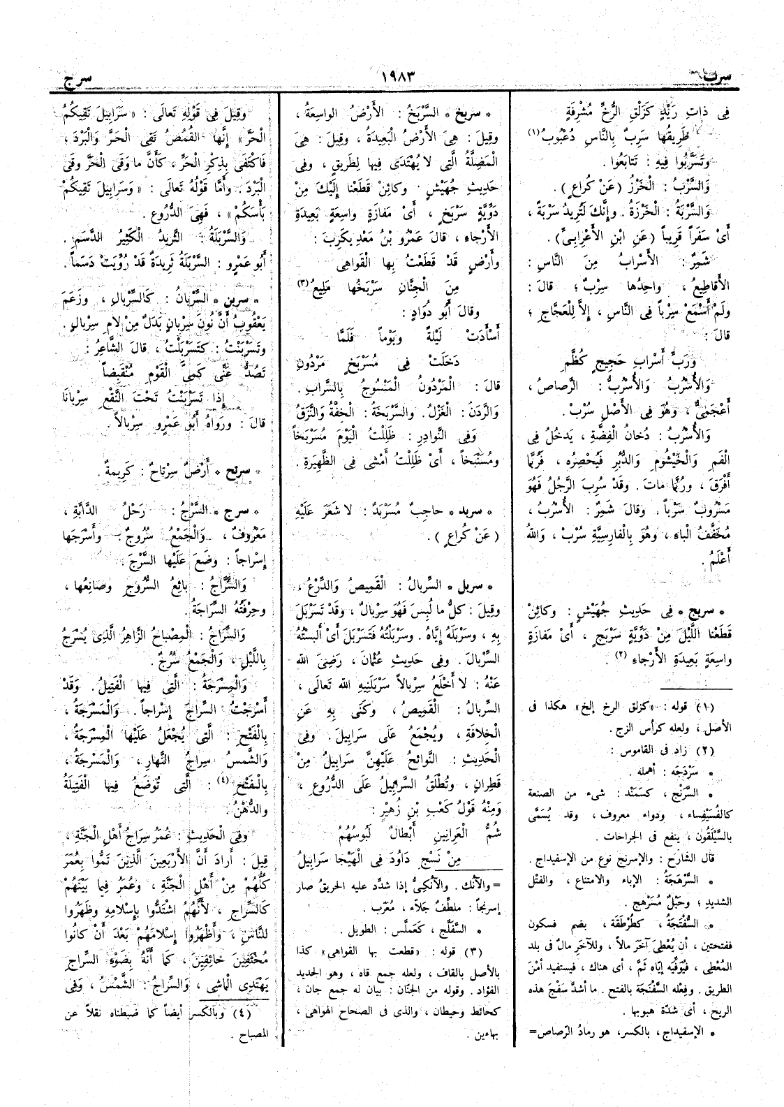 ( سرتح ) أَرض سِرتاحٌ كريمة ( سرج ) السَّرْجُ رحل الدابة معروف والجمع سُروج وأَسْرَجَها إِسراجاً وضع عليها السرج والسَّرّاجُ بائع السُّروجِ وصانعها وحرفته السَّرَاجَةُ والسِّراجُ المصباح الزاهر الذي يُسْرَجُ بالليل والجمع سُرُجٌ والمِسْرَجَةُ التي فيها الفتيل وقد أَسْرَجْتُ السِّرَاجَ إِسْراجاً والمَسْرَجَةُ بالفتح التي يجعل عليهيا المِسْرَجَةُ والشمس سِراجُ النهار والمَسْرَجَةُ بالفتح