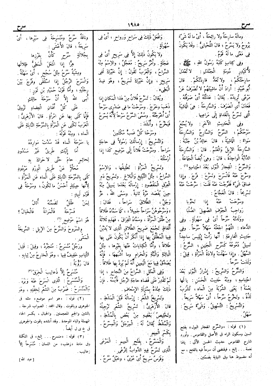 وما له سارحةٌ ولا رائحة أَي ما له شيءٌ يَرُوحُ ولا يَسْرَحُ قال اللحياني وقد يكون في معنى ما له قومٌ وفي كتاب كتبه رسولُ الله صلى الله عليه وسلم لأُكَيْدِر دُومةِ الجَنْدَلِ لا تُعْدَلُ سارِحَتُم ولا تُعَدُّ فارِدَتُكم قال أَبو عبيد أَراد أَن ماشيتهم لا تُصْرَفُ عن مَرْعًى تريده يقال عَدَلْتُه أَي صرفته فَعَدَلَ أَي انصرف والسارحة هي الماشية التي تَسْرَحُ بالغداة إِلى مراعيها وفي الحديث الآخر ولا يُمْنَعُ سَرْحُكم السَّرْحُ والسارحُ والسارحة سواء الماشية قال خالد بن جَنْبَةَ السارحة الإِبل والغنم قال والسارحة الدابة الواحدة قال وهي أَيضاً الجماعة والسَّرْحُ انفجار البول بعد احتباسه وسَرَّحَ عنه فانْسَرَحَ وتَسَرَّحَ فَرَّجَ وإِذا ضاق شيءٌ فَفَرَّجْتَ عنه قلت سَرَّحْتُ عنه تسريحاً قال العجاج وسَرَّحَتْ عنه إِذا تَحَوَّبا رَواجِبُ الجَوْفِ الصَّهِيلَ الصُّلَّبا ووَلَدَتْه سُرُحاً أَي في سُهولة وفي الدعاء اللهم اجعَلْه سهلاً سُرُحاً وفي حديث الفارعة أَنها رأَت إِبليس ساجداً تسيل دموعه كسُرُحِ الجَنِينِ السُّرُحُ السهل وإِذا سَهُلت ولادة المرأَة قيل وَلَدَتْ سُرُحاً والسُّرُحُ والسَّرِيحُ إِدْرارُ البول بعد احتباسه ومنه حديث الحسن يا لها نِعْمَةً يعني الشَّرْبة من الماء تُشْرَبُ لذةً وتخرج سُرُحاً أَي سهلاً سريعاً والتسريحُ التسهيل وشيءٌ سريح سهل وافْعَل ذلك في سَراحٍ وَرواحٍ أَي في سهولة ولا يكون ذلك إِلاَّ في سَريح أَي في عَجَلة وأَمرٌ سَرِيحٌ مُعَجَّلٌ والاسم منه السَّراحُ والعرب تقول إِن خَيْرَك لفي سَرِيح وإِن خَيْرَك لَسَريحٌ وهو ضد البطيء ويقال تَسَرَّحَ فلانٌ من هذا الكان إِذا ذهب وخرج وسَرَحْتُ ما في صدري سَرْحاً أَي أَخرجته وسمي السَّرْحُ سَرْحاً لأَنه يُسَْحُ فيخرُجُ وأَنشد وسَرَحْنا كلَّ ضَبٍّ مُكْتَمِنْ والتسريحُ إِرسالك رسولاً في حاجة سَراحاً وسَرَّحْتُ فلاناً إِلى موضع كذا إِذا أَرْسلته وتَسْرِيحُ المرأَة تطليقُها والاسم السِّراحُ مثل التبليغ والبلاغ وتَسْرِيحُ دَمِ العِرْقِ المفصود إِرساله بعدما يسيل منه حين يُفْصَد مرة ثانية وسمى الله عز وجل الطلاق سَراحاً فقال وسَرِّحُوهنّ سَراحاً جميلاً كما سماه طلاقاً من طَلَّقَ المرأَة وسماه الفِرَاقَ فهذه ثلاثة أَلفاظ تجمع صريح الطلاق الذي لا يُدَيَّنُ فيها المُطَلِّقُ بها إِذا أَنكر أَن يكون عنى بها طلاقاً وأَما الكنايات عنها بغيرها مثل البائنة والبتَّةِ والحرام وما أَشبهها فإِنه يُصَدَّق فيها مع اليمين أَنه لم يرد بها طلاقاً وفي المثل السَّراحُ من النَّجاح إِذا لم تَقْدِرْ على قضاء حاجة الرجل فأَيِّسْه فإِن ذلك عنده بمنزلة الإِسعاف وتَسْرِيحُ الشَّعر إِرساله قبل المَشْطِ قال الأَزهري تَسْرِيحُ الشعر ترجيله وتخليص بعضه من بعض بالمشط والمشط يقال له المِرجل والمِسرح بكسر الميم والمَسْرَحُ بفتح الميم المرعى الذي تَسْرَحُ فيه الدواب للرّعي وفرسٌ سَريح أَي عُرْيٌ وخيل سُرُحٌ وناقةٌ سُرُحٌ ومُنْسَرِحة في سيرها أَي سريعة قال الأَعشى بجُلالةٍ سُرُحٍ كأَنَّ بغَرْزِها هِرّاً إِذا انتَعَل المَطِيُّ ظِلالَها ومِشْيَةٌ سُرُحُ مثل سُجُح أَي سهلة وانْسَرَحَ الرجلُ إِذا استلقى وفَرَّجَ بين رجليه وأَما قول حُمَيْد بن ثور أَبى اللهُ إِلاَّ أَنَّ سَرْحَةَ مالكٍ على كلِّ أَفْنانِ العِضاهِ تَرُوقُ فإِنما كنى بها عن امرأَة قال الأَزهري العرب تكني عن المرأَة بالسَّرْحةِ النابتة على الماء ومنه قوله يا سَرْحةَ الماءِ قد سُدَّتْ موارِدُه أَما إِليكِ طريقٌ غيرُ مسْدُودِ لحائمٍ حامَ حتى لا حَراكَ به مُحَّلإٍ عن طريقِ الوِرْدِ مَرْدودِ كنى بالسَّرْحةِ النابتة على الماء عن المرأَة لأَنها حينئذٍ أَحسن ما تكن وسَرْحةٌ في قول لبيد لمن طَلَلٌ تَضَّمَنهُ أُثالُ فَسَرْحةُ فالمَرانَةُ فالخَيالُ ؟ هو اسم موضع