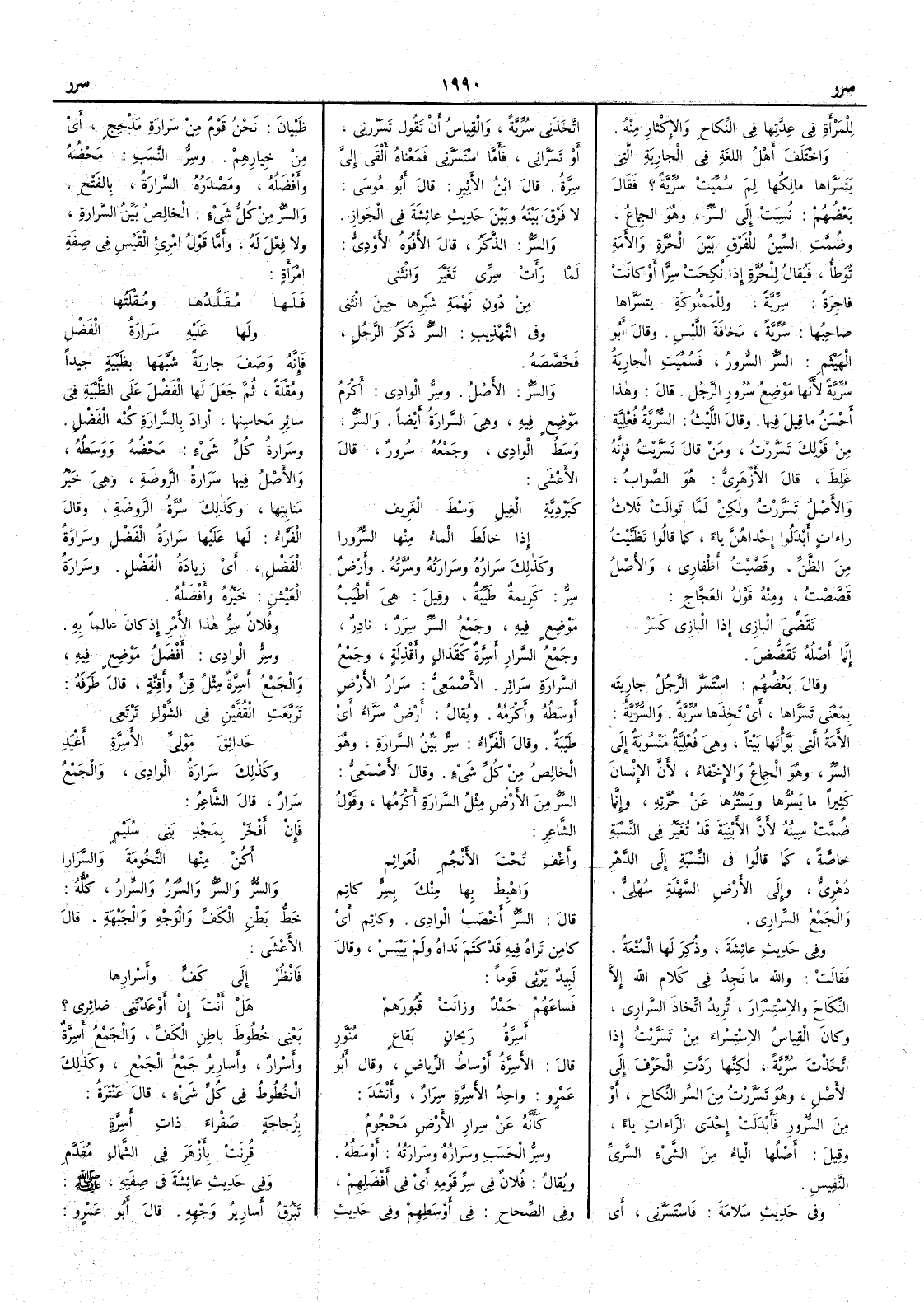 المرأَة في عدتها في النكاح والإِكثارِ منه واختلف أَهل اللغة في الجارية التي يَتَسَرَّاها مالكها لم سميت سُرِّيَّةً فقال بعضهم نسيت إِلى السر وهو الجماع وضمت السين للفرق بين الحرة والأَمة توطأُ فيقال للحُرَّةِ إِذا نُكِحَت سِرّاً أَو كانت فاجرة سِرِّيَّةً وللمملوكة يتسراها صاحبها سُرِّيَّةً مخافة اللبس وقال أَبو الهيثم السِّرُّ السُّرورُ فسميت الجارية سُرِّيَّةً لأَنها موضع سُرورِ الرجل قال وهذا أَحسن ما قيل فيها وقال الليث السُّرِّيَّةُ فُعْلِيَّة من قولك تَسَرَّرْت ومن قال تَسَرَّيْت فإِنه غلط قال الأَزهري هو الصواب والأَصل تَسَرَّرْتُ ولكن لما توالت ثلاثٌ راءات أَبدلوا إِحداهن ياء كما قالوا تَظَنَّيْتُ من الظنّ وقَصَّيْتُ أَظفاري والأَصل قَصَّصْتُ ومنه قول العجاج تَقَضِّيَ البازِي إِذا البازِي كَسَرْ إِنما أَصله تَقَضُّض وقال بعضهم استسرَّ الرجلُ جارِيَتَه بمعنى تسرَّاها أَي تَخِذها سُرية والسرية الأَمة التي بَوَّأَتَها بيتاً وهي فُعْلِيَّة منسوبة إِلى السر وهو الجماع والإِخفاءُ لأَن الإِنسان كثيراً ما يَسُرُّها ويَسْتُرُها عن حرته وإِنما ضمت سينه لأَن الأَبنية قد تُغَيَّرُ في النسبة خاصة كما قالوا في النسبة إِلى الدَّهْرِ دُهْرِيُّ وإِلى الأَرض السَّهْلَةُ سُهْلِيٌّ والجمع السَّرارِي وفي حديث عائشة وذُكِرَ لها المتعةُ فقالت والله ما نجد في كلام الله إِلاَّ النكاح والاسْتِسْرَارَ تريد اتخاذ السراري وكان القياس الاستسراء من تَسَرَّيْت إِذا اتَّخَذْت سرية لكنها ردت الحرف إِلى الأَصل وهو تَسَرَّرْتُ من السر النكاح أَو من السرور فأَبدلت إِحدى الراءات ياء وقيل أَصلها الياء من الشيء السَّريِّ النفيس وفي حديث سلامة فاسْتَسَرَّني أَي اتخذني سرية والقياس أَن تقول تَسَرَّرَني أَو تسرّاني فأَما استسرني فمعناه أَلقي إِليَّ سِرّه قال ابن الأَثير قال أَبو موسى لا فرق بينه وبين حديث عائشة في الجواز والسرُّ الذَّكَرُ قال الأَفوه الأَودي لَمَّا رَأَتْ سِرَّي تَغَيَّرَ وانْثَنَى مِنْ دونِ نَهْمَةِ شَبْرِها حِينَ انْثَنَى وفي التهذيب السر ذكر الرجل فخصصه والسَّرُّ الأَصلُ وسِرُّ الوادي أَكرم موضع فيه وهي السَّرارةُ أَيضاً والسِّرُّ وسَطُ الوادي وجمعه سُرور قال الأَعشى كَبَرْدِيَّةِ الغِيلِ وِسْطَ الغَرِيف إِذا خالَطَ الماءُ منها السُّرورا وكذلك سَرارُه وسَرارَتُه وسُرّتُه وأَرض سِرُّ كريمةٌ طيبة وقيل هي أَطيب موضع فيه وجمع السِّرَّ سِرَرٌ نادر وجمع السَّرارِ أَسِرَّةٌ كَقَذالٍ وأَقْذِلَة وجمع السَّرارِة سَراثرُ الأَصمعي سَرارُ الأَرض أَوسَطُه وأَكرمُه ويقال أَرض سَرَّاءُ أَي طيبة وقال الفراء سِرٌّ بَيِّنُ السِّرارةِ وهو الخالص من كل شيء وقال الأَصمعي السَّرُّ من الأَرض مثل السَّرارةَ أَكرمها وقول الشاعر وأَغْفِ تحتَ الأَنْجُمِ العَواتم واهْبِطْ بها مِنْكَ بِسِرٍّ كاتم قال السر أَخْصَبُ الوادي وكاتم أَي كامن تراه فيه قد كتم ولم ييبس وقال لبيد يرثي قوماً فَساعَهُمُ حَمْدٌ وزانَتْ قُبورَهمْ أَسِرَّةُ رَيحانٍ بِقاعٍ مُنَوَّر قال الأَسرَّةُ أَوْساطُ الرِّياضِ وقال أَبو عمرو واحد الأَسِرَّةِ سِرَارٌ وأَنشد كأَنه عن سِرارِ الأَرضِ مَحْجُومُ وسِرُّ الحَسَبِ وسَرارُه وسَرارَتُه أَوسطُه ويقال فلان في سِرِّ قومه أَي في أَفضلهم وفي الصحاح في أَوسطهم وفي حديث ظبيان نحن قوم من سَرارةِ مَذْحِجٍ أَي من خيارهم وسِرُّ النسَبِ مَحْضُه وأَفضلُه ومصدره السَّرارَةُ بالفتح والسِّرُّ من كل شيء الخالِصُ بَيِّنُ السَّرارةِ ولا فعل له وأَما قول امرئ القيس في صفة امرأَة فَلَها مُقَلَّدُها ومُقْلَتُها ولَها عليهِ سَرارةُ الفضلِ فإِنه وصف جاريةً شبهها بظبيةٍ جيداً ومُقْلَةً ثم جعل لها الفضل على الظبية في سائر مَحاسِنها أَراد بالسَّرارةِ كُنْه الفضل وسَرارةُ كلِّ شيء محضُه ووسَطُه والأَصل فيهعا سَرَارةُ الروضة وهي خير منابتها وكذلك سُر