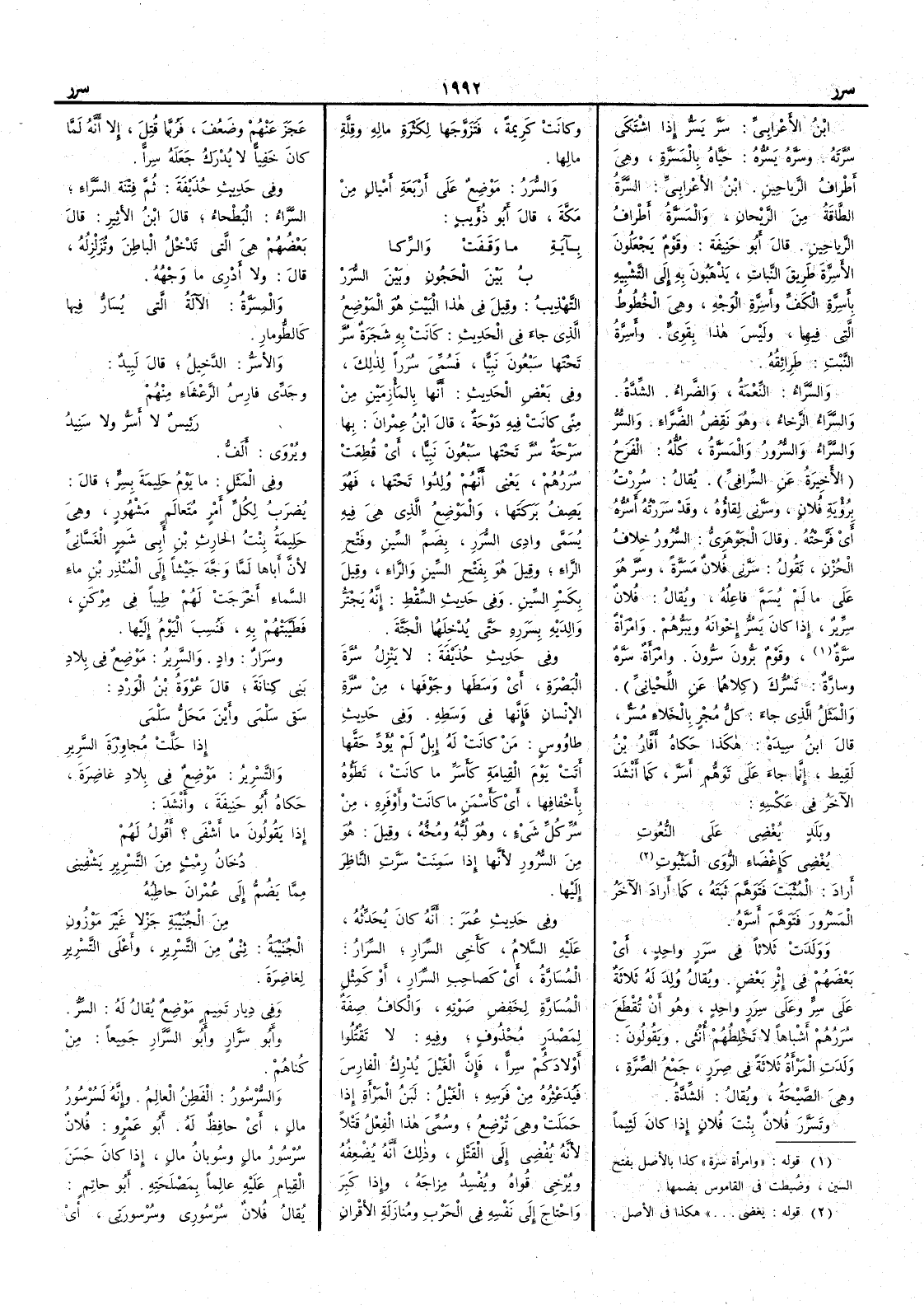 أَراد المُثْبَتَ فتوهم ثَبَتَهُ كما أَراد الآخر المَسْرُورَ فتوهم أَسَرَّه وَوَلَدَتْ ثلاثاً في سَرَرٍ واحد أَي بعضهم في إِثر بعض ويقال ولد له ثلاثة على سِرٍّ وعلى سِرَرٍ واحد وهو أَن تقطع سُرَرُهم أَشباهاً لا تَخْلِطُهُم أُنثى ويقولون ولدت المرأَة ثلاثة في صِرَرٍ جمع الصِّرَّةِ وهي الصيحة ويقال الشدة وتَسَرَّرَ فلانٌ بنتَ فلان إِذا كان لئيماً وكانت كريمة فتزوّجها لكثرة ماله وقلة مالها والسُّرَرُ موضع على أَربعة أَميال من مكة قال أَبو ذؤيب بِآيةِ ما وقَفَتْ والرِّكابَ وبَيْنَ الحَجُونِ وبَيْنَ السُّرَرْ التهذيب وقيل في هذا البيت هو الموضع الذي جاء في الحديث كانت به شجرة سُرَّ تحتها سبعون نبيّاً فسمي سُرَراً لذلك وفي بعض الحديث أَنها بالمأْزِمَيْنِ مِن مِنًى كانت فيه دَوْحَةٌ قال ابن عُمران بها سَرْحَة سُرَّ تحتها سبعون نبيّاً أَي قطعت سُرَرُهُمْ يعني أَنهم ولدوا تحتها فهو يصف بركتها والموضع الذي هي فيه يسمى وادي السرر بضم السين وفتح الراء وقيل هو بفتح السين والراء وقيل بكسر السين وفي حديث السِّقْطِ إِنه يَجْتَرُّ والديه بِسَرَرِهِ حتى يدخلهما الجنة وفي حديث حذيفة لا ينزل سُرَّة البصرة أَي وسطها وجوفها من سُرَّةِ الإِنسان فإِنها في وسطه وفي حديث طاووس من كانت له إِبل لم يؤدِّ حَقَّها أَتت يوم القيامة كَأَسَرِّ ما كانت تَطؤه بأَخفافها أَي كَأَسْمَنِ ما كانت وأَوفره من سُرِّ كلِّ شيء وهو لُبُّه ومُخُّه وقيل هو من السُّرُور لأَنها إِذا سمنت سَرَّت الناظر إِليها وفي حديث عمر أَنه كان يحدّثه عليه السلامُ كَأَخِي السِّرَارِ السِّرَارُ المُسَارَّةُ أَي كصاحب السِّرَارِ أَو كمثل المُسَارَّةِ لخفض صوته والكاف صفة لمصدر محذوف وفيه لا تقتلوا أَولادكم سِرّاً فإِن الغَيْلَ يدرك الفارسَ فَيُدَعْثِرُه من فرسه الغَيْلُ لبن المرأَة إِذا حملت وهي تُرْضِعُ وسمي هذا الفعل قتلاً لأَنه يفضي إِلى القتل وذلك أَنه بضعفه ويرخي قواه ويفسد مزاجه وإِذا كبر واحتاج إِلى نفسه في الحرب ومنازلة الأَقران عجز عنهم وضعف فربما قُتل إِلاَّ أَنه لما كان خفيّاً لا يدرك جعله سرّاً وفي حديث حذيفة ثم فتنة السَّرَّاءِ السَّرِّاءُ البَطْحاءُ قال ابن الأَثير قال بعضهم هي التي تدخل الباطن وتزلزله قال ولا أَدري ما وجهه والمِسَرَّةُ الآلة التي يُسَارُّ فيها كالطُّومار والأَسَرُّ الدَّخِيلُ قال لبيد وجَدِّي فارسُ الرَّعْشَاءِ مِنْهُمْ رَئِيسٌ لا أَسَرُّ ولا سَنِيدُ ويروى أَلَفُّ وفي المثل ما يَوْمُ حَلِيمَةَ بِسِرٍّ قال يضرب لكل أَمر متعالم مشهور وهي حليمة بنت الحرث بن أَبي شمر الغساني لأَن أَباها لما وجه جيشاً إِلى المنذر بن ماء السماء أَخرجت لهم طيباً في مِرْكَنٍ فطيبتهم به فنسب اليوم إِليها وسَرَارٌ وادٍ والسَّرِيرُ موضع في بلاد بني كنانة قال عروة بن الورد سَقَى سَلْمى وأَيْنَ مَحَلُّ سَلْمى ؟ إِذا حَلَّتْ مُجاوِرَةَ السَّرِيرِ والتَّسْرِيرُ موضع في بلاد غاضرة حكاه أَبو حنيفة وأَنشد إِذا يقولون ما أَشْفَى ؟ أَقُولُ لَهُمْ دُخَانُ رِمْثٍ من التَّسْرِيرِ يَشْفِينِي مما يَضُمُّ إِلى عُمْرانَ حاطِبُهُ من الجُنَيْبَةِ جَزْلاً غَيْرَ مَوْزُونِ الجنيبة ثِنْيٌ من التسرير وأَعلى التسرير لغاضرة وفي ديار تميم موضع يقال له السِّرُّ وأَبو سَرَّارٍ وأَبو السَّرّارِ جميعاً من كُناهم والسُّرْسُورُ القَطِنُ العالم وإِنه لَسُرْسُورُ مالٍ أَي حافظ له أَبو عمرو فلان سُرْسُورُ مالٍ وسُوبانُ مالٍ إِذا كان حسن القيام عليه عالماً بمصلحته أَبو حاتم يقال فلان سُرْسُورِي وسُرْسُورَتِي أَي