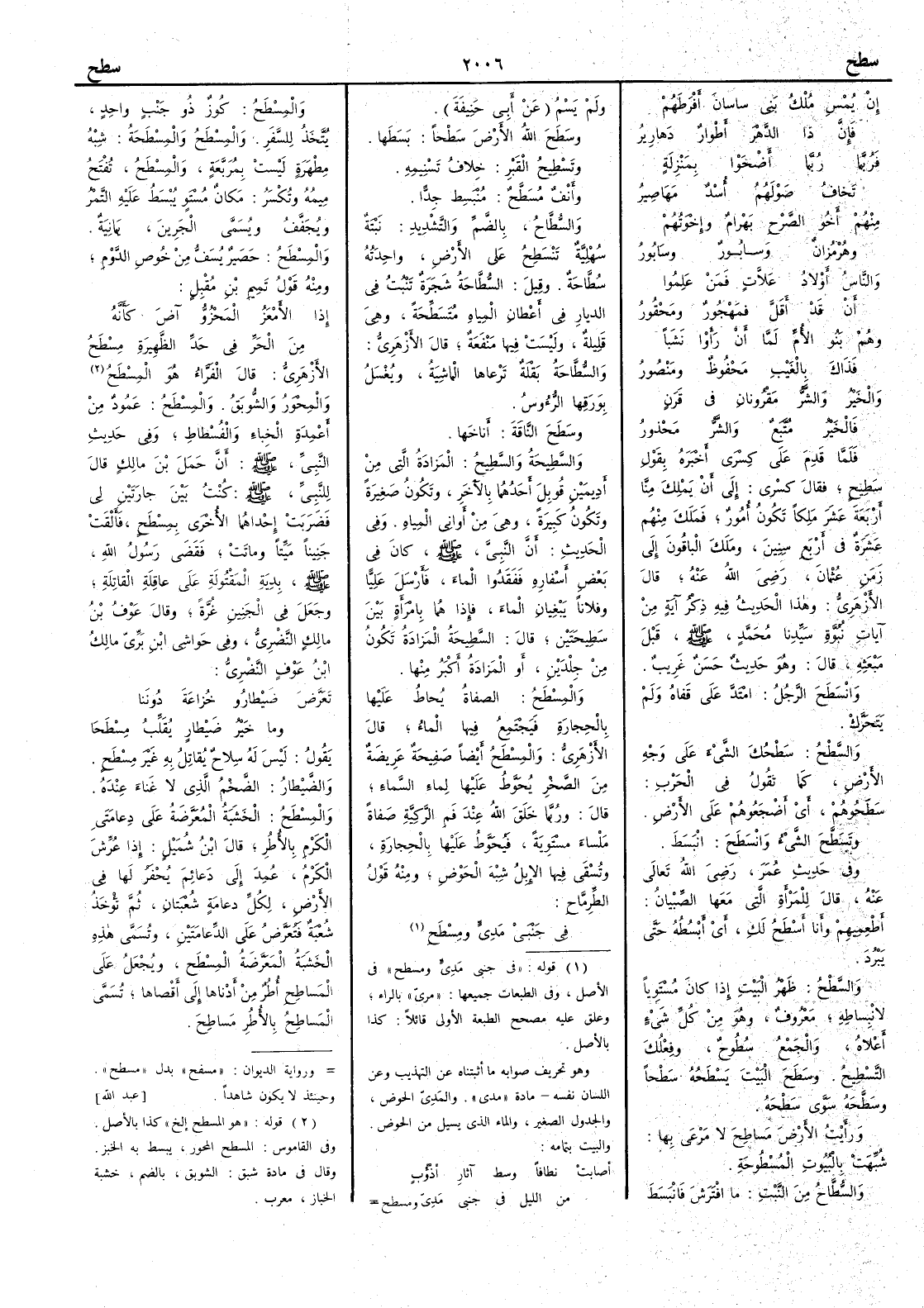 إِن يُمْسِ مُلْكُ بني ساسانَ أَفْرَطَهُمْ فإِنَّ ذا الدَّهْرَ أَطْوارٌ دَهارِيرُ فَرُبَّما رُبَّما أَضْحَوا بمنزلةٍ تَخافُ صَولَهُمُ أُسْدٌ مَهَاصِيرُ منهم أَخُو الصَّرْحِ بَهْرام وإِخْوَتُهُمْ وهُرْمُزانٌ وسابورٌ وسَابُورُ والناسُ أَوْلادُ عَلاَّتٍ فمن عَلِمُوا أَن قد أَقَلَّ فمَهْجُورٌ ومَحْقُورُ وهم بنو الأُمِّ لمَّا أَنْ رَأَوْا نَشَباً فذاكَ بالغَيْبِ محفوظٌ ومنصورُ والخيرُ والشَّرُّ مَقْرُونانِ في قَرَنٍ فالخَيرُ مُتَّبَعٌ والشَّرُّ مَحْذورُ فلما قدم على كسرى أَخبره بقول سطيح فقال كسرى إِلى أَن يملك منا أَربعة عشر ملكاً تكون أُمور فملك منهم عشرة في أَربع سنين وملك الباقون إِلى زمن عثمان رضي ا ؟ لله عنه قال الأَزهري وهذا الحديث فيه ذكر آية من آيات نبوّة سيدنا محمد صلى الله عليه وسلم قبل مبعثه قال وهو حديث حسن غريب وانْسَطَحَ الرجلُ امتدَّ على قفاه ولم يتحرك والسَّطْحُ سَطْحُك الشيءَ على وجه الأَرض كما تقول في الحرب سَطَحُوهم أَي أَضْجَعُوهم على الأَرض وتَسَطَّحَ الشيءُ وانْسَطَحَ انبسط وفي حديث عمر رضي الله تعالى عنه قال للمرأَة التي معها الصبيان أَطْعِمِيهم وأَنا أَسْطَحُ لك أَي أَبْسُطه حتى يَبْرُدَ والسَّطْحُ ظهر البيت إِذا كان مستوياً لانبساطه معروف وهو من كل شيء أَعلاه والجمع سُطوح وفعلُك التَّسطيحُ وسَطَحَ البيتَ يَسْطَحُه سَطْحاً وسَطَّحه سوَّى سَطْحه ورأَيت الأَرضَ مَساطِحَ لا مَرْعَى بها شبهت بالبيوت المسطوحة والسُّطَّاحُ من النبت ما افْتَرَشَ فانبسط ولم يَسْمُ عن أَبي حنيفة وسَطَحَ اللهُ الأَرضَ سَطْحاً بسطها وتَسطِيحُ القبر خلاف تَسْنِيمِه وأَنفٌ مُسَطَّحٌ منبسِط جدًّا والسُّطَّاحُ بالضم والتشديد نَبتَةٌ سُهْلِيَّة تَنسَطِح على الأَرض واحدته سُطَّاحة وقيل السُّطَّاحة شجرة تنبت في الديار في أَعطان المياه مُتَسَطِّحَة وهي قليلة وليست فيها منفعة قال الأَزهري والسُّطَّاحة بقلة ترعاها الماشية ويُغْسَلُ بوَرَقِها الرؤوس وسَطَحَ الناقة أَناخها والسَّطيحة المَزادة التي من أَدِيمَيْن قُوبل أَحدُهما بالآخر وتكون صغيرة وتكون كبيرة وهي من أَواني المياه وفي الحديث أَن النبي صلى الله عليه وسلم كان في بعض أَسفاره فَفَقَدوا الماءَ فأَرْسَل عليّاً وفلاناً يَبْغِيان الماء فإِذا هما بامرأَة بين سَطِيحَتَيْن قال السَّطِيحة المَزادة تكون من جلدين أَو المَزادة أَكبر منها والمِسْطَحُ الصَّفاة يحاط عليها بالحجارة فيجتمع فيها الماء قال الأَزهري والمِسْطَحُ أَيضاً صَفِيحة عريضة من الصَّخْر يُحَوَّط عليها لماء السماء قال وربما خلق الله عند فَمِ الرَّكِيَّة صَفاةً مَلْساء مستوية فَيُحَوَّطُ عليها بالحجارة وتُسْقَى فيها الإِبلُ شِبْهَ الحَوْض ومنه قول الطِّرِمَّاح في جنبي مريٍّ ومِسْطَحِ