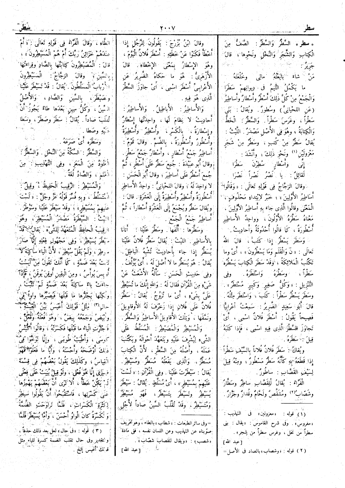 ( سطر ) السَّطْرُ والسَّطَرُ الصَّفُّ من الكتاب والشجر والنخل ونحوها قال جرير مَنْ شاءَ بايَعْتُه مالي وخُلْعَتَه ما يَكْمُلُ التِّيمُ في ديوانِهمْ سَطَرا والجمعُ من كل ذلك أَسْطُرٌ وأَسْطارٌ وأَساطِيرُ عن اللحياني وسُطورٌ ويقال بَنى سَطْراً وغَرَسَ سَطْراً والسَّطْرُ الخَطُّ والكتابة وهو في الأَصل مصدر الليث يقال سَطْرٌ من كُتُبٍ وسَطْرٌ من شجر معزولين ونحو ذلك وأَنشد إِني وأَسْطارٍ سُطِرْنَ سَطْرا لقائلٌ يا نَصْرُ نَصْراً نَصْرَا وقال الزجاج في قوله تعالى وقالوا أَساطير الأَوّلين خَبَرٌ لابتداء محذوف المعنى وقالوا الذي جاء به أَساطير الأَولين معناه سَطَّرَهُ الأَوَّلون وواحدُ الأَساطير أُسْطُورَةٌ كما قالوا أُحْدُوثَةٌ وأَحاديث وسَطَرَ بَسْطُرُ إِذا كتب قال الله تعالى ن والقلم وما يَسْطُرُونَ أَي وما تكتب الملائكة وقد سَطَرَ الكتابَ يَسْطُرُه سَطْراً وسَطَّرَه واسْتَطَرَه وفي التنزيل وكل صغير وكبير مُسْتَطَرٌ وسَطَرَ يَسْطُرُ سَطْراً كتب واسْتَطَرَ مِثْلُهُ قال أَبو سعيد الضرير سمعت أَعرابيّاً فصيحاً يقول أَسْطَرَ فلانٌ اسمي أَي تجاوز السَّطْرَ الذي فيه اسمي فإِذا كتبه قيل سَطَرَهُ ويقال سَطَرَ فلانٌ فلاناً بالسيف سَطْراً إِذا قطعه به كَأَنَّهُ سَطْرٌ مَسْطُورٌ ومنه قيل لسيف القَصَّابِ ساطُورٌ الفراء يقال للقصاب ساطِرٌ وسَطَّارٌ وشَطَّابٌ ومُشَقِّصٌ ولَحَّامٌ وقُدَارٌ وجَزَّارٌ وقال ابن بُزُرج يقولون للرجل إِذا أَخطأَ فَكَنَوْا عن خَطَئِهِ أَسْطَرَ فلانٌ اليومَ وهو الإِسْطارُ بمعنى الإِخْطاءِ قال الأَزهري هو ما حكاه الضرير عن الأَعرابي أَسْطَرَ اسمي أَي جاوز السَّطْرَ الذي هو فيه والأَساطِيرُ الأَباطِيلُ والأَساطِيرُ أَحاديثُ لا نظام لها واحدتها إِسْطارٌ وإِسْطارَةٌ بالكسر وأُسْطِيرٌ وأُسْطِيرَةٌ وأُسْطُورٌ وأُسْطُورَةٌ بالضم وقال قوم أَساطِيرُ جمعُ أَسْطارٍ وأَسْطارٌ جمعُ سَطْرٍ وقال أَبو عبيدة جُمِعَ سَطْرٌ على أَسْطُرٍ ثم جُمِعَ أَسْطُرٌ على أَساطير وقال أَبو أُسطورة وأُسطير وأُسطيرة إِلى العشرة قال ويقال سَطْرٌ ويجمع إِلى العشرة أَسْطاراً ثم أَساطيرُ جمعُ الجمعِ وسَطَّرَها أَلَّفَها وسَطَّرَ علينا أََتانا بالأَساطِيرِ الليث يقال سَطَّرَ فلانٌ علينا يُسَطْرُ إِذا جاء بأَحاديث تشبه الباطل يقال هو يُسَطِّرُ ما لا أَصل له أَي يؤلف وفي حديث الحسن سأَله الأَشعث عن شيء من القرآن فقال له والله إِنك ما تُسَيْطِرُ عَلَيَّ بشيء أَي ما تُرَوِّجُ يقال سَطَّرَ فلانٌ على فلان إِذا زخرف له الأَقاويلَ ونَمَِّّْقَها وتلك الأَقاويلُ الأَساطِيرُ والسُّطُرُ والمُسَيْطِرُ والمُصَيْطِرُ المُسَلَّطُ على الشيء لِيُشْرِف عليه ويَتَعَهَّدَ أَحوالَه ويكتبَ عَمَلَهُ وأَصله من السَّطْر لأَن الكتاب مُسَطَّرٌ والذي يفعله مُسَطِّرٌ ومُسَيْطِرٌ يقال سَيْطَرْتَ علينا وفي القرآن لست عليهم بِمُسْيِطرٍ أَي مُسَلَّطٍ يقال سَيْطَرَِ يُسَيِطِرُ وتَسَيطَرَ يتَسَيْطَرُ فهو مُسَيْطِرٌ ومَتَسَيْطِرٌ وقد تقلب السين صاداً لأَجل الطاء وقال الفراء في قوله تعالى أَم عندهم خزائن ربك أَم هم المُسَيْطِرُونَ قال المصيطرون كتابتها بالصاد وقراءتها بالسين وقال الزجاج المسيطرون الأَرباب المسلطون يقال قد تسيطر علينا وتصيطر بالسين والصاد والأَصل السين وكل سين بعدها طاء يجوز أَن تقلب صاداً يقال سطر وصطر وسطا عليه وصطا وسَطَرَه أَي صرعه والسَّطْرُ السِّكَّةُ من النخل والسَّطْرُ العَتُودُ من المَعَزِ وفي التهذيب من الغنم والصاد لغة والمُسَيْطِرُ الرقيب الحفيظ وقيل المتسلط وبه فسر قوله عز وجل لستَ عليهم بمسيطر وقد سَيْطْرَ علينا وسَوْطَرَ الليث السَّيْطَرَةُ مصدر المسيطر وهو الرقيب الحافظ المتعهد للشيء يقال قد سَيْطَرَ يُسَيْطِرُ وفي مجهول فعله إِنما صار سُوطِر ولم يقل سُيْطِرَ لأَن الياء ساكنة لا تثبت بعد ضمة كما أَنك تقول من آيَسْتُ أُويِ