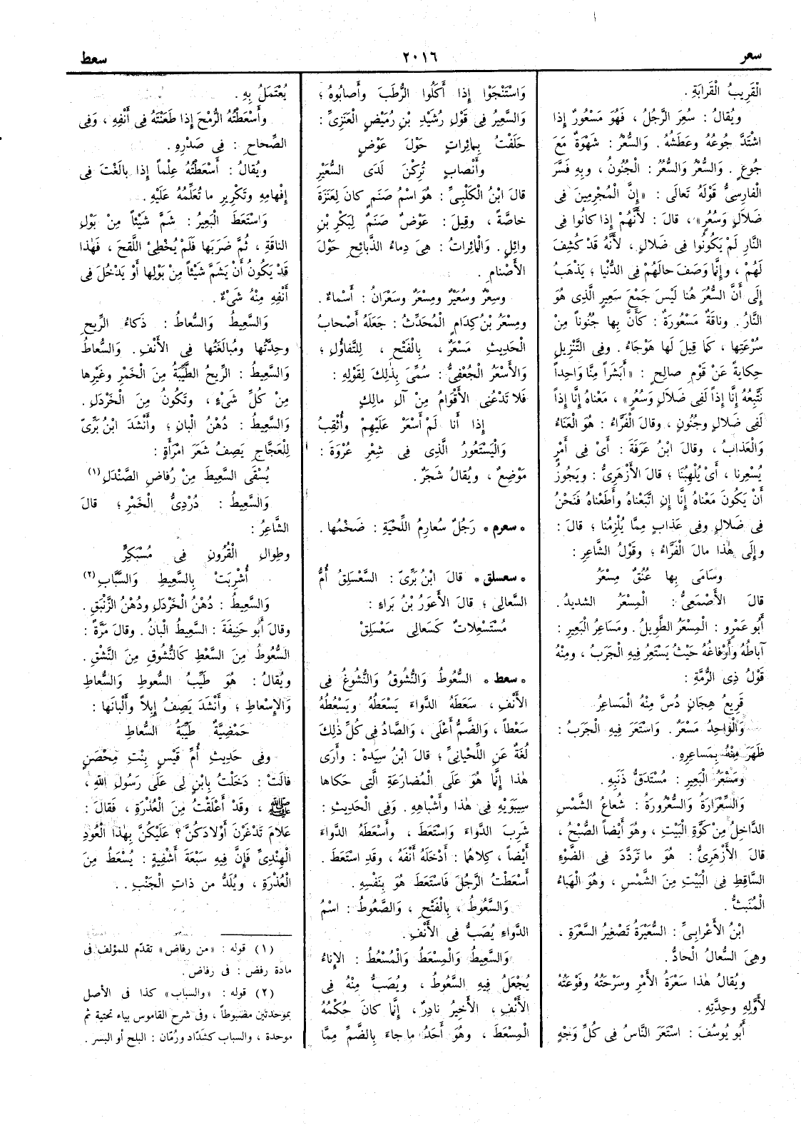 القريب القرابة ويقال سُعِرَ الرجلُ فهو مسعور إِذا اشْتَدَّ جوعه وعطشه والسعْرُ شهوة مع جوع والسُّعْرُ والسُّعُرُ الجنون وبه فسر الفارسي قوله تعالى إِن المجرمين في ضلال وسُعُرٍ قال لأَنهم إِذا كانوا في النار لم يكونوا في ضلال لأَنه قد كشف لهم وإِنما وصف حالهم في الدنيا يذهب إِلى أَن السُّعُرَ هنا ليس جمع سعير الذي هو النار وناقة مسعورة كأَن بها جنوناً من سرعتها كما قيل لها هَوْجَاءُ وفي التنزيل حكايةً عن قوم صالح أَبَشَراً منَّا واحداً نَتَّبِعُهُ إِنَّا إِذاً لفي ضلال وسُعُرٍ معناه إِنا إِذاً لفي ضلال وجنون وقال الفراء هو العَنَاءُ والعذاب وقال ابن عرفة أَي في أَمر يُسْعِرُنا أَي يُلْهِبُنَا قال الأَزهري ويجوز أَن يكون معناه إِنا إِن اتبعناه وأَطعناه فنحن في ضلال وفي عذاب مما يلزمنا قال وإِلى هذا مال الفراء وقول الشاعر وسَامَى بها عُنُقٌ مِسْعَرُ قال الأَصمعي المِسْعَرُ الشديد أَبو عمرو المِسْعَرُ الطويل ومَسَاعِرُ البعير آباطله وأَرفاغه حيث يَسْتَعِرُ فيه الجَرَبُ ومنه قول ذي الرمة قَرِيعُ هِجَانٍ دُسَّ منه المَساعِرُ والواحدُ مَسْعَرٌ واسْتَعَرَ فيه الجَرَبُ ظهر منه بمساعره ومَسْعَرُ البعير مُسْتَدَقُّ ذَنَبِه والسِّعْرَارَةُ والسّعْرُورَةُ شعاع الشمس الداخلُ من كَوَّةِ البيت وهو أَيضاً الصُّبْحُ قال الأَزهري هو ما تردّد في الضوء الساقط في البيت من الشمس وهو الهباء المنبث ابن الأَعرابي السُّعَيْرَةُ تصغير السِّعْرَةِ وهي السعالُ الحادُّ ويقال هذا سَعْرَةُ الأَمر وسَرْحَتُه وفَوْعَتُه لأَوَّلِهِ وحِدَّتِهِ أَبو يوسف اسْتَعَرَ الناسُ في كل وجه واسْتَنْجَوا إِذا أَكلوا الرُّطب وأَصابوه والسَّعِيرُ في قول رُشَيْدِ ابن رُمَيْضٍ العَنَزِيِّ حلفتُ بمائراتٍ حَوْلَ عَوْضٍ وأَنصابٍ تُرِكْنَ لَدَى السَّعِيرِ قال ابن الكلبي هو اسم صنم كان لعنزة خاصة وقيل عَوض صنم لبكر بن وائل والمائرات هي دماء الذبائح حول الأَصنام وسِعْرٌ وسُعَيْرٌ ومِسْعَرٌ وسَعْرَانُ أَسماء ومِسْعَرُ بن كِدَامٍ المحدّث جعله أَصحاب الحديث مَسعر بالفتح للتفاؤل والأَسْعَرُ الجُعْفِيُّ سمي بذلك لقوله فلا تَدْعُني الأَقْوَامُ من آلِ مالِكٍ إِذا أَنا أَسْعَرْ عليهم وأُثْقِب واليَسْتَعُورُ الذي في شِعْرِ عُرْوَةَ موضع ويقال شَجَرٌ ( سعرم ) رجل سُعارِمُ اللحية ضخمها ( سعسلق ) قال ابن بري السَّعْسَلِق أُمُّ السَّعالي قال الأَعور بن براء مُسْتَسْعِلات كسَعالي سَعْسَلِقْ