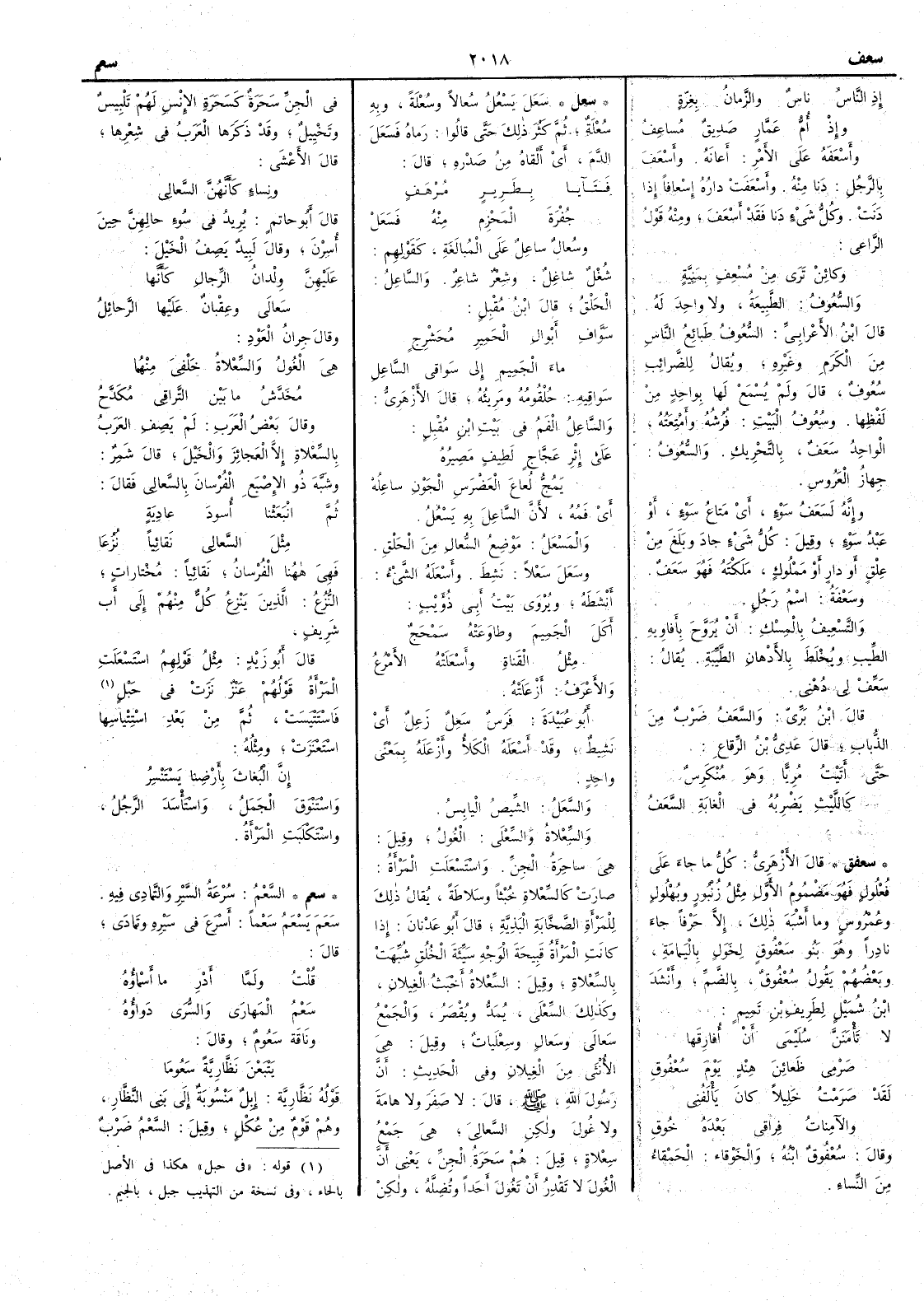 ( سعفق ) قال الأَزهري كل ما جاء على فُعْلول فهو مضموم الأَول مثل زُنْبور وبُهْلول وعُمْروس وما أشبه ذلك إلاّ حرفاً جاءَ نادراً وهو بنو سَعْفوق لِخَوَل باليمامة وبعضهم يقول سُعْفوق بالضم وأنشد ابن شميل لطريف بن تميم لا تَأْمَنَنَّ سُلَيْمَى أن أُفارِقها صَرْمي ظَعائِنَ هِنْدٍ يوم سُعْفوق لقد صَرَمْتُ خليلاً كان يأْلَفُني والآمِناتُ فِراقي بعدَه خُوق وقال سُعْفوق ابنه والخَوْقاء الحَمْقاء من النساء ( سعل ) سَعَلَ يَسْعُلُ سُعالاً وسُعْلةً وبه سُعْلة ثم كَثُر ذلك حتى قالوا رماه فَسَعَلَ الدَّمَ أَي أَلقاه من صدره قال فَتَآيا بطَرِيرٍ مُرْهَفٍ جُفْرةَ المَحْزِم منه فَسَعَل وسُعالٌ ساعِل على المبالغة كقولهم شُغْلٌ شاغِلٌ وشِعْرٌ شاعِرٌ والساعِلُ الحَلْق قال ابن مقبل سَوَّافِ أَبْوالِ الحَمِير مُحَشْرِجٍ ماء الجَمِيم إِلى سَوافي السَّاعِل سَوافِيهِ حُلْقومُه ومَرِيئُه قال الأَزهري والسَّاعِل الفَمُ في بيت ابن مقبل عَلى إِثْرِ عَجَّاجٍ لَطِيفٍ مَصِيُره يَمُجُّ لُعاعَ العَضْرَسِ الجَوْنِ ساعِلُه أَي فَمُه لأَن الساعِلَ به يَسْعُل والمَسْعَلُ موضع السُّعال من الحَلْق وسَعَلَ سَعْلاً نَشِطَ وأْسْعَله الشيءُ أَنْشَطَه ويروى بيت أَبي ذؤيب أَكَلَ الجَمِيمَ وطاوَعَتْه سَمْحَجٌ مثلُ القَناةِ وأَسْعَلَتْه الأَمْرُعُ والأَعرف أَزْعَلَتْه أَبو عبيدة فَرَسٌ سَعِلٌ زَعِلٌ أَي نَشِيطٌ وقد أْسْعَله الكَلأُ وأَزْعَلَه بمعنى واحد والسَّعَلُ الشِّيصُ اليابس والسِّعْلاةُ والسِّعْلا الغُولُ وقيل هي ساحرة الجِنِّ واسْتَسْعَلَتِ المرأَةُ صارت كالسِّعْلاة خُبْثاً وسَلاطَةً يقال ذلك للمرأَة الصَّخَّابة البَذِيَّة قال أَبو عدنان إِذا كانت المرأَة قبيحة الوجه سيِّئة الخُلُق شُبِّهت بالسِّعْلاة وقيل السِّعْلاة أَخبث الغِيلان وكذلك السِّعْلا يمد ويقصر والجمع سَعالى وسَعالٍ وسِعْلَياتٌ وقيل هي الأُنثى من الغِيلان وفي الحديث أَن رسول الله صلى الله عليه وسلم قال لا صَفَرَ ولا هامَةَ ولا غُولَ ولكن السَّعالى هي جمع سِعْلاةٍ قيل هم سَحَرَةُ الجِنِّ يعني أَن الغُولَ لا تقدر أَن تَغُول أَحداً وتُضِلَّه ولكن في الجن سَحَرة كسَحَرة الإِنس لهم تلبيس وتخييل وقد ذكرها العرب في شعرها قال الأَعشى ونِساءٍ كأَنَّهُنَّ السَّعالي قال أَبو حاتم يريد في سوء حالهن حين أُسِرْنَ وقال لبيد يصف الخَيل عَلَيْهِنَّ وِلْدانُ الرِّجالِ كأَنَّها سَعالى وعِقْبانٌ عليها الرَّحائِلُ وقال جِرانُ العَوْدِ هِيَ الغُولُ والسِّعْلاةُ خَلْفيَ مِنْهما مُخَدَّشُ ما بَيْن التَّراقي مُكَدَّحُ وقال بعض العرب لم يَصِف العربُ بالسِّعْلاة إِلا العَجائزَ والخيلَ قال شَمِر وشبَّه ذو الإِصْبَعِ الفُرْسان بالسَّعالي فقال ثُمَّ انْبَعَثْنا أُسودَ عاديةٍ مثل السَّعالي نَقائياً نُزُعاً فهي ههنا الفُرْسانُ نَقائِياً مُخْتارات النُّزُعُ الذين يَنْزِعُ كلٌّ منهم إِلى أَب شريف قال أَبو زيد مثل قولهم اسْتَسْعَلَتِ المرأَةُ قولُهم عَنْزٌ نَزَتْ في حَبْلٍ