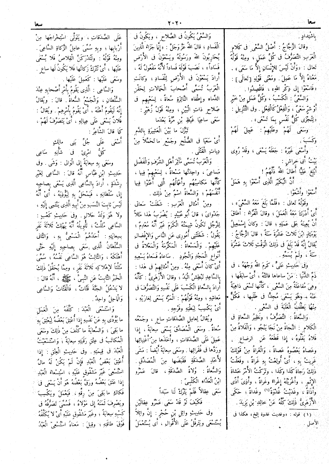( * قوله « وغديت غدوة إلخ » هكذا في الأصل ) وغَداةً حكى الأَزهري ذلك كلَّه عن خالد بن يزيد والسَّعْيُ يكون في الصلاحِ ويكون في الفساد قال الله عز وجل إنما جزاءُ الذين يُحارِبون اللهَ ورسولَه ويَسْعَوْنَ في الأَرض فَساداً نصبَ قوله فساداً لأَنه مفعولٌ له أَراد يَسْعَوْن في الأَرضِ للفساد وكانت العرب تُسَمِّي أَصحابَ الحَمالاتِ لِحَقْنِ الدِّماءِ وإطْفاءِ النَّائِرةِ سُعاةً لسَعْيِهِم في صَلاحِ ذاتِ البَيْنِ ومنه قول زهير سَعَى ساعِيَا غَيظِ بنِ مُرَّةَ بعدما تَبَزَّلَ ما بَيْنَ العَشيرَةِ بالدَّمِ أَي سَعَيَا في الصلحِ وجمعِ ما تَحَمَّلا من دِياتِ القَتْلى والعرب تُسَمِّي مآثر أَهلِ الشَّرَف والفضل مَساعِيَ واحدتُها مَسْعاةٌ لسَعْيِهِم فيها كأَنها مَكاسِبُهُم وأَعمالُهم التي أَعْنَوْا فيها أَنفسَهم والسَّعاةُ اسمٌ من ذلك ومن أَمثال العرب شَغَلَتْ سَعاتي جَدْوايَ قال أَبو عُبَيْد يُضْرَب هذا مثلاً للرجل تكونُ شِيمَتُه الكَرَم غير أَنه مُعْدِمٌ يقول شَغَلَتْني أُمُوري عن الناسِ والإفْضالِ عليهم والمَسْعاةُ المَكْرُمَة والمَعْلاةُ في أَنْواعِ المَجْدِ والجُودِ سَاعاهُ فسَعاهُ يَسْعِيهِ أي كان أَسْعَى منه ومن أَمثالهم في هذا بالساعِدِ تَبْطِشُ اليَدُ وقال الأَزهري كأَنه أَرادَ بالسَّعاةِ الكَسْبَ على نفسهِ والتَّصَرُّفَ في معاشهِ ومنه قولُهم المَرْءُ يَسْعى لِغارَيْه أَي يَكْسِبُ لبَطْنِهِ وفَرْجِهِ ويقال لِعامِل الصَّدَقاتِ ساعٍ وجَمْعُه سُعاةٌ وسَعى المُصَدِّقُ يَسْعَى سِعايةً إذا عَمِلَ على الصَّدقاتِ وأَخذها من أَغْنِيائِها وردّها في فُقَرائِها وسَعَى سِعايةً أَيضاً مَشى لأَخْذِ الصدقة فقَبَضَها من المُصَدِّق والسُّعاةُ وُلاةُ الصدقة قال عمرو بن العَدَّاء الكَلْبي سَعَى عِقالاً فلَمْ يَتْرُكْ لنا سَبَداً فكَيْفَ لَوْ قد سَعَى عَمْروٌ عِقالَينِ ؟ وفي حديث وائل بن حُجْر إنَّ وائِلاً يُسْتَسْعَى ويَتَرَفَّلُ على الأَقْوالِ أَي يُسْتَعْمَلُ على الصدقات ويَتَولَّى اسْتِخْراجَها من أَرْبابها وبه سُمِّيَ عامِلُ الزكاةِ الساعِيَ ومنه قولهُ ولَتُدْرَكَنَّ القِلاصُ فلا يُسْعَى عليها أَي تُتْرَكُ زكاتُها فلا يكون لها ساعٍ وسَعَى عليها كعَمِل عليها والساعي الذي يقومُ بأَمرِ أَصحابهِ عند السُّلْطانِ والجمعُ السُّعاةُ قال ويقال إنه ليَقوم أَهلَه أَي يقومُ بأَمرِهِم ويقال فلان يَسْعَى على عِياله أَي يَتَصَرَّف لهم كما قال الشاعرْ أَسْعَى عَلى جُلِّ بَنِي مالِكٍ كُلُّ امْرِئٍ في شَأْنهِ سَاعِي وسَعَى به سِعايَةً إلى الوَالي وَشَى وفي حديث ابن عباس أَنَّه قال السَّاعِي لغَيْرِ رِشْدَةٍ أَراد بالسَّاعِي الذي يَسْعَى بصاحبه إلى سُلطانهِ فيَمْحَلُ به ليُؤْذِيَه أَي أَنَّه ليسَ ثابتَ النَّسَبِ من أَبيه الذي يَنْتَمِي إليه ولا هُوَ وَلَدُ حَلالٍ وفي حديث كعب السَّاعِي مُثَلِّثٌ تأْويلُه أَنه يُهْلِك ثلاثةَ نَفَرٍ بسِعايتهِ أَحَدُهم المَسْعِيُّ به والثاني السُّلْطانُ الذي سَعَى بصاحبهِ إليه حتى أَهْلَكَه والثالث هو السَّاعِي نفسهُ سُمِّيَ مُثَلِّثاً لإهْلاكهِ ثلاثَةَ نَفَرٍ ومما يُحَقّق ذلك الخبرُ الثابت عن النبي صلى الله عليه وسلم أَنه قال لا يَدْخُلُ الجَنَّةَ قَتَّاتٌ فالقَتَّاتُ والساعِي والماحِلُ واحدٌ واسْتَسْعَى العبْدَ كَلَّفَه من العَمَل ما يُؤَدِّي به عن نَفْسهِ إذا أُعْتِقَ بَعضهُ لِيعْتِقَ به ما بَقِيَ والسِّعايَةُ ما كُلِّفَ من ذلِك وسَعَى المُكاتَبُ في عِتْقِ رَقَبَتهِ سِعايَةً واسْتَسْعَيْت العَبْدَ في قِيمَته وفي حديث العِتْقِ إذا أُعْتِقَ بعضُ العَبْدِ فإن لم يَكُنْ له مالٌ اسْتُسْعِيَ غيرَ مَشْقُوقٍ عليه اسْتِسْعاءُ العَبْدِ إذا عَتَقَ بَعْضهُ ورَقَّ بعضهُ هو أَنْ يَسْعَى في فَكاكِ ما بَقي من رِقِّه فيَعْمَلَ ويكسِبَ ويَصْرِفَ ثَمَنه إلى مولاه فسُمِّي تصرُّفه في كَسْبه سِعايِةً وغيرَ مَش