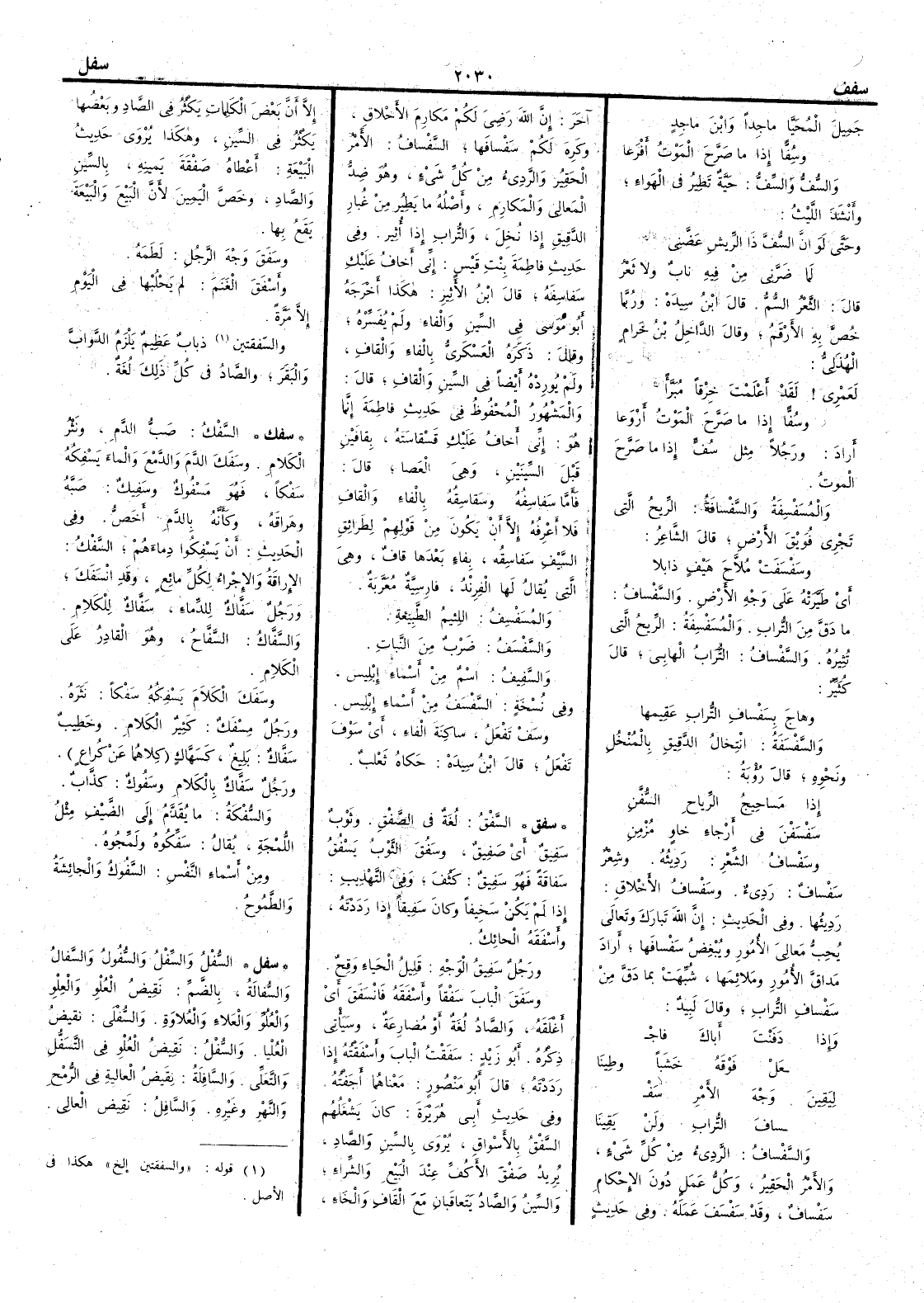جَمِيلَ المُحَيّا ماجداً وابن ماجِدٍ وسُِفّاً إذا ما صَرَّحَ المَوْتُ أَفْرعا والسُّفُّ والسِّفُّ حَيَّةٌ تطير في الهواء وأَنشد الليث وحتى لَو انَّ السُِّفَّ ذا الرِّيشِ عَضَّني لمَا ضَرَّني منْ فيه نابٌ ولا ثَعْرُ قال الثَّعْرُ السم قال ابن سيده وربما خُصَّ به الأَرْقَمُ وقال الدَّاخِلُ بن حرامٍ الهُذَلي لَعَمْرِي لقد أَعْلَمْت خِرْقاً مُبرَّأً وسُفّاً إذا ما صَرَّحَ المَوْتُ أَرْوَعا أَراد ورجلاً مثل سفٍّ إذا ما صرَّح الموتُ والمُسَفْسِفةُ والسَّفْسافةُ الرِّيح التي تجري فُوَيْقَ الأَرض قال الشاعر وسَفْسَفَتْ مُلاَّحَ هَيْفٍ ذابِلا أَي طَيّرَتْه على وجه الأَرض والسَّفْسافُ ما دَقَّ من التراب والمُسَفْسِفَةُ الرِّيحُ التي تُثِيرُه والسَّفْسافُ التراب الهابي قال كثيِّر وهاج بِسَفْسافِ التراب عَقِيمها والسَّفْسَفَةُ انْتِخالُ الدَّقِيق بالمُنخُل ونحوه قال رؤبة إذا مَساحِيجُ الرِّياحِ السُّفَّنِ سَفْسَفْنَ في أَرْجاء خاوٍ مُزْمِنِ وسَفْسافُ الشِّعْر رَدِيئُه وشِعْر سَفْسافٌ رَدِيء وسَفْسافُ الأَخْلاقِ رَديئُها وفي الحديث إِن اللّه تبارك وتعالى يُحِبُّ مَعاليَ الأُمورِ ويُبْغِضُ سَفْسافَها أَرادَ مداقَّ الأُمورِ ومَلائمَها شبهت بما دَقَّ من سَفْساف التراب وقال لبيد وإذا دَفَنْتَ أَباكَ فاجْ عَلْ فَوْقَه خَشَباً وطِينَا لِيَقِينَ وَجْه الأَمْرٍ سَفْ سافَ التُّرابِ ولنْ يَقِينا والسَّفْسافُ الرَّدِيء من كل شيءٍ والأَمرُ الحقِير وكلُ عَمَل دُونَ الإحْكام سَفْساف وقد سَفْسَف عَمَله زفي حديث آخر إنَّ اللّه رَضِيَ لكم مَكارِمَ الأَخْلاقِ وكره لكم سَفْسافَها السفساف الأَمرُ الحَقِير والرَّديء من كل شيء وهو ضدّ المعالي والمَكارِم وأَصله ما يطير من غبار الدَّقيق إذا نُخِلَ والترابِ إذا أُثير وفي حديث فاطمةَ بنت قَيس إني أَخافُ عليكِ سَفاسِفَه قال ابن الأَثير هكذا أَخرجه أَبو موسى في السين والفاء ولم يفسره وقال ذكره العسكري بالفاء والقاف ولم يورده أَيضاً في السين والقاف قال والمشهور المحفوظ في حديث فاطمة إنما هو إني أَخاف عليك قَسْقاسَتَه بقافين قبل السينين وهي العصا قال فأَما سَفاسِفُه وسَقاسِقُه بالفاء والقاف فلا أَعرفه إلا أَن يكون من قولهم لطرائق السيف سَفاسِقُه بفاء بعدها قاف وهي التي يقال لها الفِرِنْدُ فارسية معرَّبة والمُسَفْسِفُ اللئيمُ الطبيعةِ والسَّفْسَفُ ضرب من النبات والسَّفِيفُ اسم من أَسماء إبليس وفي نسخة السَّفْسَفُ من أَسماء إبليس وسَفْ تَفْعَلُ ساكنة الفاء أَي سوف تَفْعَلُ قال ابن سيده حكاه ثعلب ( سفق ) السَّفْق لغة في الصَّفْق وثوب سَفِيق أي صَفيق وسَفُقَ الثوبُ يَسْفُق سَفاقةً فهو سَفِيق كَثُف وفي التهذيب إذا لم يكن سَخِيفاً وكان سَفِيقاً إذا رَدَدْته وأسْفَقَه الحائكُ ورجل سَفِيقُ الوجه قليلُ الحياء وَقِحٌ وسَفَقَ البابَ سَفْقاً وأسْفَقَه فانْسَفَق أي أغْلَقه والصاد لغة أو مضارِعة وسيأتي ذكره أبو زيد سَفَقْتُ البابَ وأسْفَقْته إذا رددته قال أبو منصور معناهما أجَفْته وفي حديث أبي هريرة كان يَشْغَلُهم السَّفْقُ بالأَسْواق يروى بالسين والصاد يريد صَفْقَ الأَكُفّ عند البيع والشراء والسينُ والصادُ يتعاقبان مع القاف والخاء إلا أن بعض الكلمات يكثر في الصاد وبعضها يكثر في السين وهكذا يُرْوَى حديث البَيْعة أعْطاه صَفْقةَ يمينِه بالسين والصاد وخصَّ اليَمينَ لأنّ البَيْعَ والبَيْعةَ يقع بها وسَفَقَ وَجْهَ الرجل لَطَمَه وأسْفَقَ الغنمَ لم يَحْلُبْها في اليوم إلا مرة والسفقتين