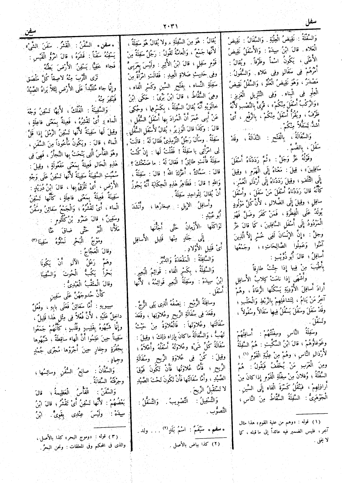 والسِّفْلة نقيضُ العِلْية والسَّفَالُ نقيض العَلاء قال ابن سيده والأَسْفَل نَقِيض الأَعْلى يكون اسماً وظرفاً ويقال أَمرهم في سَفَال وفي عَلاء والسُّفُولُ مصدر وهو نقيض العُلُوِّ والسِّفْل نقيض العِلْوِ في البناء وفي التنزيل العزيز والرَّكْبُ أَسْفَلَ منكم قرئ بالنصب لأَنه ظرف ويقرأ أَسْفَلُ منكم بالرفع أَي أَشدُّ تَسَفُّلاً منكم والسَّفَالة بالفتح النَّذَالة قد سَفُلَ بالضم وقوله عز وجل ثم رَدَدْناه أَسْفَلَ سافِلِين قيل معناه إِلى الهَرَم وقيل إِلى التَّلَف وقيل رَدَدْناه إِلى أَرْذل العُمُر كأَنه قال رددناه أَسْفَلَ مَنْ سَفَل وأَسْفَلَ سافِلٍ وقيل إِلى الضلال لأَن كل مولود يولد على الفِطْرة فمن كفر وَضَلَّ فهو المردود إِلى أَسفل السافلين كما قال عز وجل إِن الإِنسان لفي خُسْر إِلا الذين آمنوا وعملوا الصالحات وجمعها أَسافِلُ قال أَبو ذؤيب بأَطْيَبَ مِن فيها إِذا جِئْتُ طارِقاً وأَشْهَى إِذا نامت كِلابُ الأَسافِل أَراد أَسافل الأَودية يسكنها الرُّعَاة وهم آخر من ينام لِتَشاغُلِهم بالرَّبْط والحَلْب وقد سَفَلَ وسَفُلَ يَسْفُل فيهما سَفَالاً وسُفُولاً وتَسَفَّلَ وسَفِلة الناس وسِفْلَتُهم أَسافِلهُم وغَوْغاؤهم قال ابن السكيت هم السَّفِلة لأَرذال الناس وهم من عِلْيَة القوم ومن العرب من يُخَفِّف فيقول هم السِّفْلة وفلان من سِفْلة القوم إِذا كان من أَراذِلهم فَيَنْقُل كسرة الفاء إِلى السين الجوهري السَّفِلة السُّقَاط من الناس يقال هو من السَّفِلة ولا يقال هو سَفِلة لأَنها جمع والعامة تقول رجل سَفِلة من قوم سَفِلٍ قال ابن الأَثير وليس بعربي وفي حديث صلاة العيد فقالت امرأَة من سَفِلة النِّساء بفتح السين وكسر الفاء وهي السُّقَاط قال ابن بري حكى ابن خالويه أَنه يقال السِّفِلة بكسرهما وحكي عن أَبي عمر أَن المراد بها أَسْفَل السُّفْل قال وكذا قال الوزير يقال لأَسفل السُّفُل سَفِلة وسأَل رجل التِّرْمِذي فقال له قالت لي امرأَتي يا سَفِلة فقلت لها إِن كُنْتُ سَفِلة فأَنت طالق فقال له ما صَنْعَتُك ؟ قال سَمَّاكٌ أَعَزَّك اللهُ قال سَفِلةٌ والله قال فظاهر هذه الحكاية أَنه يجوز أَن يقال للواحد سَفِلة وأَسافِلُ الإِبل صغارُها وأَنشد أَبو عبيد تَوَاكَلَها الأَزْمانُ حتى أَجَأْنَها إِلى جَلَدٍ منها قليلِ الأَسافِل أَي قليل الأَولاد والسافِلَة المَقْعَدة والدُّبُرُ والسَّفِلة بكسر الفاء قوائم البعير ابن سيده وسَفِلةُ البعير قوائمُه لأَنها أَسفل وسافلةُ الرُّمح نصفه الذي يلي الزُّجَّ وقَعَد في سُفَالة الريح وعُلاوتها وقَعَدَ سُفَالَتَها وعُلاوَتها فالعُلاوةُ من حيث تَهُبُّ والسُّفالة ما كان بإِزاء ذلك وقيل سُفَالة كل شيء وعُلاوتُه أَسْفَلُه وأَعْلاه وقيل كُنْ في عُلاوةِ الرِّيح وسُفَالة الريح فأَما عُلاوتُها فأَن تكون فوق الصيد وأَما سُفَالتها فأَن تكون تحت الصيد لا تستقبل الريح والتَّسْفِيل التصويب والتَّسَفُّل التَّصوُّب ( سفم ) سَيْفَمٌ اسم بلد