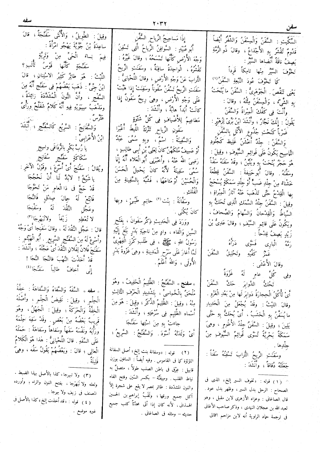 ( * قوله « وسفانة بنت إلخ » أصل السفانة اللؤلؤة كما في القاموس ) حاتم طَيِّءٍ وبها كان يُكنى وورد في الحديث ذكر سَفَوانَ بفتح السين والفاء وادٍ من ناحية بدر بلغ إليه رسول الله صلى الله عليه وسلم في طلب كُرْزٍ الفِهْرِي لما أَغار على سَرْحِ المدينة وهي غزوة بدر الأُولى والله أَعلم ( سفنج ) السَّفَنَّجُ الظليم الخفيف وهو ملحق بالخماسي بتشديد الحرف الثالث منه وقيل الظليم الذكر وقيل هو من أَسماء الظليم في سرعته وأَنشد جاءَتْ به مِن اسْتِها سَفَنَّجَا أَي ولدته أَسود والسَّفَنَّجُ السريع وقيل الطويل والأُنثى سَفَنَّجَةٌ قال ساعدة بن جؤية يهجو امرأَة فِيمَ نِساءُ الحَيِّ مِن وَتَرِيَّةٍ سَفَنَّجَةٍ كأَنها قَوْسُ تَأْلَبِ ؟ الليث هو طائر كثيرُ الاسْتِنانِ قال ابن جني ذهب بعضهم في سَفَنَّج أَنه من السَّفْج وأَن النون المشدَّدة زائدة ومذهب سيبويه فيه أَنه كلام شَفَلَّح ورأْي عَتَرَّس والسُّفَانِجُ السريع كالسَفَنَّج أَنشد ابن الأَعرابي يا رُبَّ بَكْرٍ بالرُّدَافَى واسِجِ سُكَاكَةٍ سَفَنَّجٍ سُفَانِجِ ويقال سَفْنَجَ أَي أَسْرَعَ وقول الآخر يا شَيْخُ لا بُدَّ لنا أَنْ نَحْجُجَا قد حَجَّ في ذا العامِ مَن تَحَوَّجا فابْتَعْ له جِمالَ صِدْقٍ فالنَّجا وعَجِّلِ النَّقْدَ له وسَفْنِجا لا تُعْطِهِ زَيْفاً ولا تُبَهْرِجَا