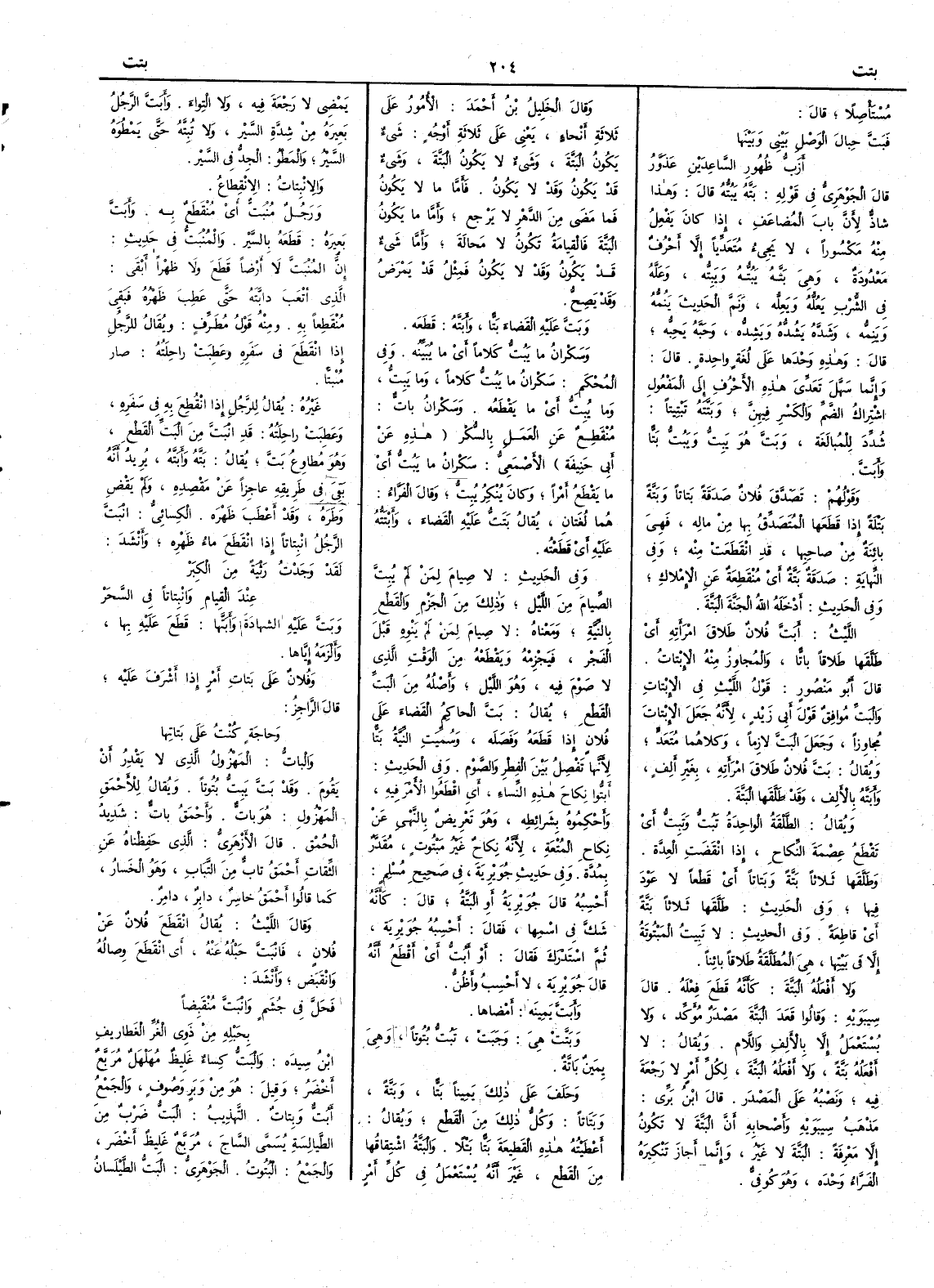 مُسْتَأْصِلاً قال فَبَتَّ حِبالَ الوصْلِ بيني وبَيْنَها أَزَبُّ ظَهُورِ السَّاعِدَيْنِ عَذَوَّرُ قال الجوهري في قوله بَتَّه يَبُتُّه قال وهذا شاذّ لأَنَّ باب المُضاعف إِذا كانَ يَفْعِل منه مكسوراً لا يجيءُ متعدِّياً إِلاَّ أَحرفٌ معدودة وهي بَتَّه يَبُتُّه وَيَبِتُّه وعَلَّه في الشُّرب يَعُلُّه ويَعِلُّه ونَمَّ الحديثَ يَنُمُّه ويَنِمُّه وشَدَّه يَشُدُّه ويَشِدُّه وحَبَّه يَحِبُّه قال وهذه وحدَها على لغةٍ واحدةٍ قال وإِنما سَهَّلَ تَعَدِّيَ هذه الأَحْرُف إِلى المفعول اشتراكُ الضم والكسر فيهنّ وبَتَّتَه تَبْتِيتاً شُدِّدَ للمبالغة وبَتَّ هو يَبِتُّ ويَبُتُّ بَتّاً وأَبَتَّ وقولهم تَصَدَّقَ فلانٌ صَدَقَةً بَتاتاً وبَتَّةً بَتْلَةً إِذا قَطَعَها المُتَصَدِّقُ بها من ماله فهي بائنة من صاحبها وقد انْقَطَعَتْ منه وفي النهاية صدقة بَتَّةٌ أَي مُنْقَطِعَةٌ عن الإِمْلاكِ وفي الحديث أَدْخَلَه اللَّهُ الجَنَّةَ البَتَّةَ الليث أَبَتَّ فُلانٌ طَلاقَ امرأَتِه أَي طَلَّقَها طَلاقاً باتّاً والمُجاوزُ منه الإِبْتاتُ قال أَبو منصور قول الليث في الإِبْتاتِ والبَتِّ موافِقٌ قولَ أَبي زيد لأَنه جَعَل الإِبْتات مُجاوزاً وجعل البَتَّ لازماً وكلاهما مُتعدِّ ويقال بَتَّ فلانٌ طَلاقَ امرأَتِه بغير أَلف وأَبَتَّه بالأَلف وقد طَلَّقها البَتَّةَ ويقال الطَّلْقةُ الواحدة تَبُتُّ وتَبِتُّ أَي تَقطَعُ عِصْمةَ النكاح إِذا انْقَضَتِ العدَّة وطَلَّقَها ثَلاثاً بَتَّةً وبَتاتاً أَي قَطْعاً لا عَوْدَ فيها وفي الحديث طلَّقها ثلاثاً بَتَّةً أَي قاطعةً وفي الحديث لا تَبِيتُ المَبْتُوتَةُ إِلاَّ في بيتها هي المُطَلَّقة طَلاقاً بائِناً ولا أَفْعَلُه البَتَّةَ كأَنه قَطَعَ فِعْلَهُ قال سيبويه وقالوا قَعَدَ البَتَّةَ مصدر مُؤَكِّد ولا يُستعمل إِلا بالأَلف واللام ويقال لا أَفْعَلُه بَتَّةً ولا أَفعلهُ البَتَّةَ لكل أَمرٍ لا رَجْعة فيه ونَصْبُه على المصدر قال ابن بري مذهب سيبويه وأَصحابه أَن البَتَّةَ لا تكون إِلاَّ معرفة البَتَّةَ لا غَيْرُ وإِنما أَجازَ تَنْكِيرَه الفراءُ وَحْدَه وهو كوفيٌّ وقال الخليل بن أَحمد الأُمورُ على ثلاثة أَنحاءٍ يعني على ثلاثة أَوجه شيءٌ يكون البَتَّةَ وشيءٌ لا يكونُ البَتَّةَ وشيءٌ قد يكون وقد لا يكون فأَما ما لا يكون فما مَضَى من الدهر لا يرجع وأَما ما يكون البَتَّة فالقيامةُ تكون لا مَحالة وأَما شيءٌ قد يكون وقد لا يكون فمِثْل قَدْ يَمْرَضُ وقد يَصِحُّ وبَتَّ عليه القضاءَ بَتّاً وأَبَتَّه قطعه وسكرانُ ما يَبُتُّ كلاماً أَي ما يُبَيِّنُه وفي المحكم سَكْرانُ ما يَبُتُّ كلاماً وما يَبِتُّ وما يُبِتُّ أَي ما يقطعه وسكرانُ باتٌّ مُنْقَطِعٌ عن العمل بالسُّكْر هذه عن أَبي حنيفة الأَصمعي سكرانُ ما يَبُتُّ أَي ما يَقْطَعُ أَمْراً وكان ينكر يُبِتُّ وقال الفراءُ هما لغتان يقال بَتَتُّ عليه القضاءَ وأَبْتَتُّه عليه أَي قَطَعْتُه وفي الحديث لا صِيامَ لمن لم يُبِتَّ الصيامَ من الليل وذلك من الجَزْم والقَطْع بالنية ومعناه لا صِيامَ لمن لم يَنْوِه قبل الفجر فيَجْزِمْه ويَقْطَعْه من الوقت الذي لا صَوْم فيه وهو الليل وأَصله من البَتّ القَطْعِ يقال بَتَّ الحاكمُ القضاءَ على فلان إِذا قَطَعه وفَصَلَه وسُمِّيَتِ النيَّةُ بَتّاً لأَنها تَفْصِلُ بين الفِطْرِ والصوم وفي الحديث أَبِتُّوا نكاحَ هذه النساءِ أَي اقْطَعُوا الأَمْر فيه وأَحْكِمُوه بشرائطه وهو تَعْريضٌ بالنهي عن نكاح المُتْعةِ لأَِنه نكاحٌ غير مَبْتُوتٍ مُقَدَّرٌ بمدّة وفي حديث جُوَيريةَ في صحيح مسلم أَحْسِبُه قال جُوَيرية أَو البَتَّةُ قال كأَنه شك في اسمها فقال أَحْسِبُه جُوَيرية ثم استدرك فقال أَو أَبُتُّ أَي أَقْطَعُ أَنه قال جُوَيرية لا أَحْسِبُ وأَظُنُّ وأَبَتَّ يَمينَه أَمْضاها وبَتَّتْ هي وجَبَتْ تَبُتُّ بُتُوتاً وهي يَمين بَاتَّةٌ وحَلَفَ على ذلك يميناً بَ