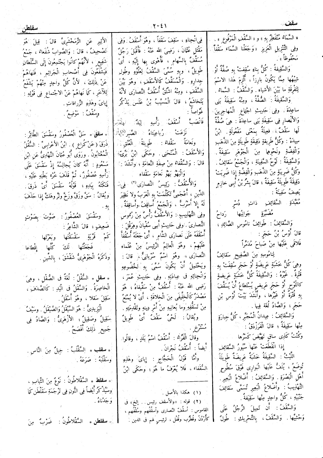 السماء مُنْفَطِرٌ به والسَّقْفِ المرفوعِ وفي التنزيل العزيز وجعلنا السماء سَقْفاً محفوظاً والسَّقِيفةُ كل بناء سُقِفَتْ به صُفَّةٌ أَو شِبْهُها مما يكون بارِزاً أُلْزِمَ هذا الاسمَ لِتَفْرِقةِ ما بين الأَشياء والسَّقْفُ السماء والسّقيفَةُ الصُّفَّةُ ومنه سَقِيفةُ بني ساعِدةَ وفي حديث اجتماع المهاجرين والأَنصار في سَقيفِة بني ساعدةَ هي صُفّة لها سَقْف فَعيلةٌ بمعنى مفعُولة ابن سيده وكل طريقةٍ دقيقةٍ طويلةٍ من الذهب والفِضة ونحوهما من الجوهر سَقِيفَةٌ والسّقِيفةُ لَوْحُ السّفينةِ والجمع سَقائفُ وكلُّ ضريبةٍ من الذهب والفضة إذا ضُرِبَتْ دقيقةً طويلةً سَقِيفةٌ قال بِشر بن أَبي خازم يصفُ سفينةً مُعَبَّدةِ السَّقائِف ذات دُسْرٍ مُضَبّرَةٍ جوانِبُها رداحِ والسّقائِفُ طوائفُ ناموسِ الصائد قال أَوْس بن حَجَر فَلاقَى عليها من صباحَ مُدمِّراً لِنامُوسِه من الصّفِيحِ سَقائِفُ وهي كل خشَبة عَرِيضةٍ أَو حَجر سُقِفَتْ به قُتْرة غيره والسّقيفةُ كلُّ خشبة عريضة كاللوح أَو حجر عريض يُستطاع أَن يُسَقّفَ به قترةٌ أَو غيرها وأَنشد بيت أَوس بن حجر والصادُ لغة فيها والسّقائِفُ عِيدانُ المُجَبِّر كلُّ جِبارةٍ منها سَقِيفة قال الفرزدق وكنت كَذِي ساقٍ تَهَيَّضَ كَسْرُها إذا انْقَطَعَتْ عنها سُيُورُ السَّقائِفِ الليث السَّقِيفةُ خشبة عريضةٌ طويلة توضع يُلَفُّ عليها البَوارِي فوق سُطوحِ أَهل البصرة والسّقائفُ أَضْلاعُ البعير التهذيب وأَضلاعُ البعير تسمى سَقائِفَ جَنْبَيْه كل واحد منها سَقيفةٌ والسَّقَفُ أَن تَمِيلَ الرِّجلُ على وحْشِيّها والسَّقَفُ بالتحريك طول في انحناء سَقِفَ سَقَفاً وهو أَسْقَفُ وفي مَقْتَلِ عثمان رضي اللّه عنه فأَقبل رجل مُسَقَّفٌ بالسِّهامِ فأَهْوَى بها إليه أَي طويل وبه سمِّي السَّقْفُ لِعُلُوِّه وطول جِدارِه والمُسَقّفُ كالأَسْقَفِ وهو بَيِّنُ السَّقَفِ ومنه اشْتُقَّ أُسْقُفُّ النصارى لأَنه يَتَخاشعُ قال المسيب بن علس يذكر غَوّاصاً فانصَب أَسْقف رأْسه لبدٌ نزعَتْ رباعيتاه الصَّبِرْ