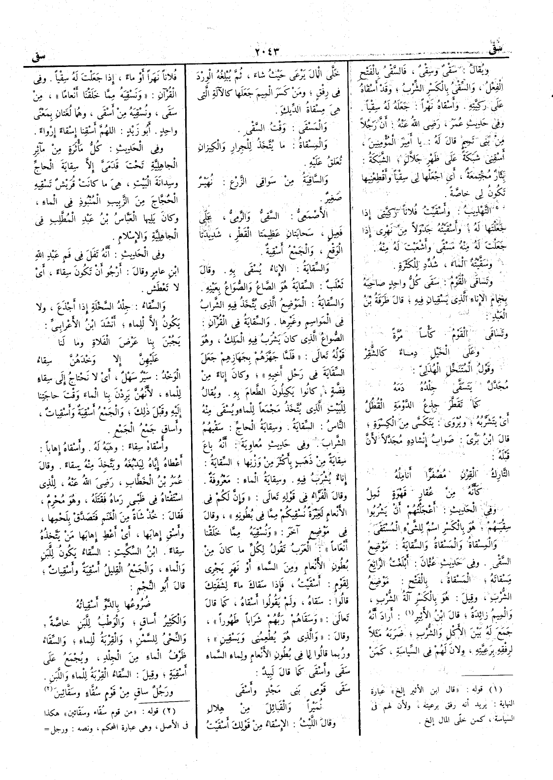 ( * قوله « قال ابن الأثير إلخ » عبارة النهاية يريد إنه رفق برعيته ولان لهم في السياسة كمن خلى المال إلخ ) أَراد أَنه جمع له بين الأَكل والشُّرْبِ ضربه مثلاً لرِفْقِه برَعِيَّتهِ ولان لهم في السياسة كمن خَلَّى المالَ يَرْعى حيث شاء ثم يُبلِغُه الوِرْد في رِفْقٍ ومن كسر الميم جعلها كالآلة التي هي مِسْفاةُ الديك والمَسْقى وقتُ السَّقْيِ والمِسْقاةُ ما يُتَّخذ للجِرار والكيزان تُعَلَّق عليه والساقية من سواقي الزَّرع نُهَيْر صغيرٌ الأَصمعي السَّقِيُّ والرَّمِيُّ على فعيل سَحابَتان عظيمتا القَطْر شَدِيدتا الوقع والجمع أَسْقِيةٌ والسِّقايةُ الإناءُ يُسْقى به وقال ثعلب السِّقايةُ هو الصاع والصُّواع بعينه والسِّقايةُ الموضع الذي يُتَّخذ فيه الشَّراب في المواسم وغيرها والسِّقاية في القرآن الصُّواع الذي كان يَشْرَب فيه الملِك وهو قوله تعالى فلما جَهَّزَهم بجَهازِهم جَعل السِّقاية في رَحْل أَخيه وكان إناءً من فِضَّةٍ كانوا يَكيلون الطعام به ويقال للبيت الذي يُتَّخذ مَجْمَعاً للماء ويُسْقى منه الناسُ السِّقاية وسِقاية الحاجِّ سَقْيُهم الشراب وفي حديث معاوية أَنه باعَ سِقايةً من ذهب بأَكثر من وزْنِها السِّقايةُ إناءٌ يُشرب فيه وسِقاية الماء معروفة وقال الفراء في قوله تعالى وإن لكم في الأَنعامِ لعِبْرةً نُسْقِيكُم مما في بُطونهِ وقال في موضع آخر ونُسْقِيَه مما خلقْنا أَنعاماً العرب تقول لكل ما كان من بطون الأَنعام ومن السماء أَو نهَر يَجْري لقوم أَسْقَيْت فإذا سَقاكَ ماءً لشَفَتِك قالوا سَقاهُ ولم يقولوا أَسْقاهُ كما قال تعالى وسَقاهم ربهم شراباً طَهُوراً وقال والذي هو يُطْعِمُني ويَسْقِينِ وربما قالوا لِما في بطون الأَنْعام ولِماءٍ السماء سَقى وأَسْقى كما قال لبيد سَقى قومي بَني مَجْدٍ وأَسْقى نُمَيْراً والقَبائِلَ من هِلالِ وقال الليث الإسْقاءُ من قولك أَسْقَيْتُ فلاناً نهَراً أَو ماءً إذا جعلت له سِقْىاً وفي القرآن ونَسْقيه مما خَلقْنا أَنْعاماً من سَقى ونُسقيه من أَسْقى وهما لغتان بمعنى واحد أَبو زيد اللهم أَسْقِنا إسْقاءً إرْواءً وفي الحديث كلُّ مأْثَرةٍ من مآثِر الجاهلية تحت قدميَّ إلا سِقايةَ الحاجِّ وسِدانةَ البيت هي ما كانت قريش تَسْقِيه الحُجَّاج من الزَّبيب المُنْبُوذِ في الماء وكانَ يليها العباسُ بن عبد المطلب في الجاهلية والإسلام وفي الحديث أَنه تَفَلَ في فمِ عبد الله بن عامر وقال أَرجو أَن تكون سِقاءً أَي لا تعطَش والسِّقاءُ جلدُ السَّخْلة إذ أَجْذَعَ ولا يكون إلاَّ للماء أَنشد ابن الأَعرابي يَجُبْن بنا عَرْضَ الفَلاةِ وما لنا عليهنَّ إلاَّ وخْدَهُنَّ سِقاءُ الوَخْدُ سَيْرٌ سهلٌ أَي لا نحتاج إلى سِقاءٍ للماء لأَنهنّ يَرِدْنَ بنا الماءَ وقتَ حاجتِنا إليه وقبل ذلك والجمع أََسِْقيةٌ وأَسْقِيات وأَساقٍ جمع الجمع وأَسْقاهُ سِقاءً وهَبَه له وأَسْقاهُ إهاباً أَعطاه إيَّاه ليَدْبُغَه ويتَّخِذ منه سِقاءً وقال عمر بن الخطاب رضي الله عنه للذي اسْتَفْتاه في ظَبْيٍ رماه فقتله وهو مُحْرِم فقال خُذْ شاةً من الغنم فتصدَّقْ بلحمِها وأَسْقِ إهابَها أَي أَعْطِ إهابها مَن يتخذهُ سِقاءً ابن السكيت السِّقاءُ يكون للِّبن والماء والجمع القليل أَسْقِيَةٌ وأَسْقِياتٌ قال أَبو النجم ضُرُوعُها بالدَّوِّ أَسْقِياتُهُ والكثير أَساقٍ والوَطْبُ للبَنِ خاصَّة والنِّحْيُ للسَّمن والقِرْبَةُ للماءِ والسِّقاءُ ظَرْفُ الماءِ من الجلد ويُجمع على أَسْقِيةٍ وقيل السِّقاءُ القِرْبةُ للماء واللَّبَن ورجلٌ ساقٍ من قوم سُقَّاءٍ وسَقَّائِينَ