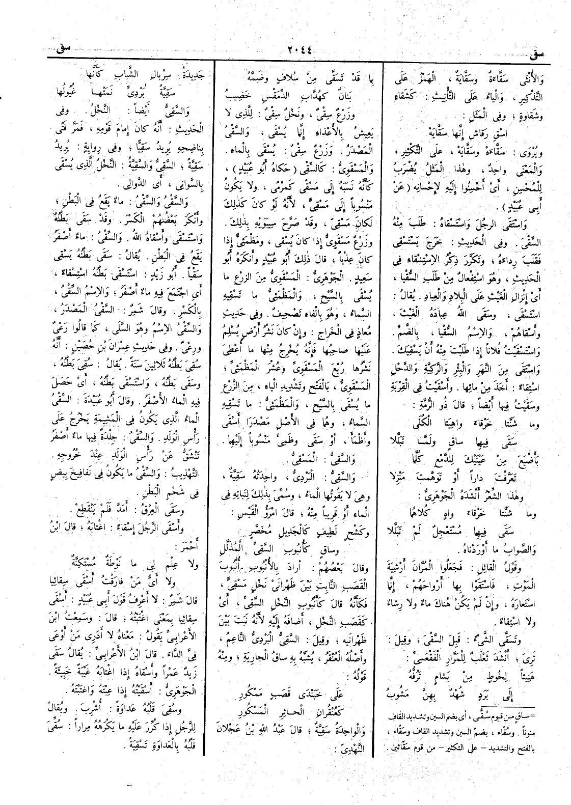 والأُنثى سَقَّاءَة وسَقَّاية الهمْزُ على التذكير والياءُ على التأْنيث كشقاءٍ وشَقاوةٍ وفي المثل اسقِ رَقاشِ إنها سَقَّايهْ ويروى سَقَّاءَهْ وسَقَّايةٌ على التكثير والمعنى واحد وهذا المثل يضرب للمحسن أَي أَحْسِنوا إليه لإحْسانهِ عن أَبي عبيد واسْتَقى الرجلَ واسْتَسْقاه طَلب منه السَّقْيَ وفي الحديث خرج يَسْتَسْقي فقلب رِداءَه وتكرر ذكر الاسْتِسْقاء في الحديث وهو اسْتِفْعال من طَلب السُّقْيا أَي إنْزال الغَيْثِ على البلادِ والعِبادِ يقال اسْتَسْقى وسَقى اللهُ عبادَه الغَيْثَ وأَسْقاهم والاسم السُّقْيا بالضم واسْتَسْقَيْت فلاناً إذا طلبت منه أَن يَسقِيَك واستَقى من النهَر والبئرِ والرَّكِيَّة والدَّحْل استِقاءً أَخذ من مائها وأَسْقَيْت في القِرْبة وسَقَيْتُ فيها أَيضاً قال ذو الرمة وما شَنَّتا خَرْقاءَ واهِيتَا الكُلى سَقى فيهما ساقٍ ولمَّا تَبَلّلا بأَضْيَعَ من عينيك للدّمع كلّما تعرّفْتَ داراً أَو توهَّمتَ منزِلا وهذا الشعر أَنشده الجوهري وما شَنَّتا خَرْقاءَ واهٍ كُلاهُما سَقَى فيهما مستعجِلٌ لم تَبلّلا والصواب ما أوردناه وقول القائل فجعلوا المُرّان أَرْشِيةَ المَوْت فاستَقَوْا بها أَرواحَهُم إنما استعارهَ وإن لم يكن هناك ماءٌ ولا رِشاءٌ ولا استِقاءٌ وتَسَقَّى الشيءُ قَبِلَ السَّقْيَ وقيل ثَرِيَ أَنشد ثعلب للمَرّار الفَقْعَسي هنيئاً لخُوطٍ من بَشامٍ تَرُفُّه إلى بَرَدٍ شُهْدٌ بهنَّ مَشُوبُ بما قد تَسَقَّى من سُلافٍ وضَمَّهُ بَنانٌ كهُدَّابِ الدِّمَقْسِ خَضيبُ وزرعٌ سِقْيٌ ونخلٌ سِقْيٌ للذي لا يعيش بالأَعْذاءِ إنما يُسقى والسَّقيُ المصدر وزرع سِقيٌ يُسْقى بالماء والمَسقَويُّ كالسِّقْى حكاه أَبو عبيد كأَنه نسبهَ إلى مَسقىً كَمرْمىً ولا يكون منسوباً إلى مَسقيٍّ لأَنه لو كان كذلك لكانَ مَسْقيٌّ وقد صرح سيبويه بذلك وزرع مَسْقَويٌّ إذا كان يُسقى ومَظْمَئِيٌّ إذا كان عِذْياً قال ذلك أَبو عبيد وأَنكره أَبو سعيد الجوهري المَسْقَوِيُّ من الزرع ما يُسقى بالسَّيْح والمَظْمَئيُّ ما تَسقِيه السماء وهو بالفاء تصحيف وفي حديث معاذ في الخراج وإن كان نَشْرُ أَرضٍ يُسلِمُ عليها صاحِبُها فإنهُ يخرج منها ما أُعطي نَشْرُها رُبْعَ المَسقَويِّ وعشر المَظْمَئِيِّ المَسْقَوِيُّ بالفتح وتشديد الياء من الزرع ما يُسقى بالسَّيْح والمَظَمئيُّ ما تسقيه السماءُ وهما في الأَصل مصدرا أَسقى وأَظْمأَ أَو سَقى وظمِئَ منسوباً إليهما والسَّقِيُّ المَسْقِيُّ والسَّقيُّ البَرْدِيُّ واحدته سَقِيَّةٌ وهي لا يفوتُها الماءُ وسمِّيَ بذلك لنَباته في الماء أَو قريباً منه قال امرؤ القيس وكَشْح لطِيف كالجَديلِ مُخَصَّر وساق كأُنبُوب السَّقِيِّ المُذَلَّلِ وقال بعضهم أَراد بالأُنبُوبِ أُنبُوبَ القصب النابت بين ظَهرانَيْ نخل مَسْقِيٍّ فكأَنه قال كأَُنبوب النخل السَّقِيِّ أَي كقصب النخل أَضافه إليه لأَنه نبَت بين ظَهْرانَيه وقيل السَّقِيُّ البرْديٌّ الناعمُ وأَصله العُنْقَرُ يشبَّه به ساقُ الجارية ومنه قوله على خَبَندى قصبٍ مَمْكورِ كعُنْقُران الحائِر المسْكُورِ والواحدة سَقِيَّةٌ قال عبد الله بن عَجْلان النَّهدي جديدة سِرْبالِ الشَّبابِ كأَنها سَقِيَّةُ بَردِيٍّ نَمَتْها غُيولُها والسَّقِيُّ أَيضاً النخل وفي الحديث أَنه كان إمام قومه فمرَّ فتىً بناضِحِه يريدُ سَقِيّاً وفي رواية يريد سَقِيَّة السَّقِيُّ والسَّقِيَّةُ النخل الذي يُسقى بالسَّواني أَي الدوالي والسَّقْيُ والسِّقْيُ ماءٌ يقع في البطن وأَنكر بعضهم الكسر وقد سَقى بطنهُ واستَسْقي وأَسْقاه الله والسِّقيُ ماءٌ أَصفر يقع في البطن يقال سَقى بطنهُ يَسْقي سَقْياً أَبو زيد استَسْقى بطنهُ استِسْقاءً أي اجتمع فيه ماءٌ أَصفر والاسم السِّقْيُ بالكسر وقال شمر السَّقْيُ المصدر والسِّقْيُ الاسم وهو السَّلى كما قالوا رَعْيٌ ورِعْيٌ وفي حديث عمران بن حصين أَنه سُقِيَ بطنهُ ثلاثين سنة يقال سُق
