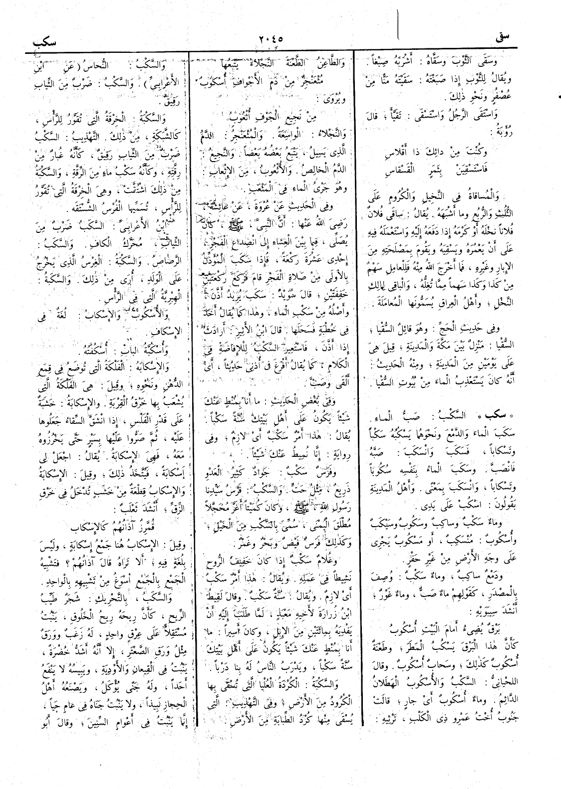 ويروى من نَجِيعِ الجَوْفِ أُثْعُوبُ والنَّجْلاءُ الواسعة والمُثْعَنْجِرُ الدَّمُ الذي يَسِيلُ يَتْبَعُ بعضُه بَعْضاً والنَّجِيعُ الدَّمُ الخالِصُ والأُثْعُوبُ من الإِثْعابِ وهو جَرْي الماءِ في المَثْعَبِ وفي الحديث عن عروة عن عائشة رضي اللّه عنها أَن النبي صلى اللّه عليه وسلم كان يُصَلِّي فيما بين العشاءِ إِلى انْصِدَاعِ الفَجر إِحدى عَشْرَةَ رَكْعَةً فإِذا سَكَبَ المُؤَذِّنُ بالأُولى من صلاةِ الفجْرِ قامَ فرَكَعَ رَكْعَتَيْن خَفِيفَتَيْنِ قال سُوَيْدٌ سَكَبَ يريدُ أَذَّنَ وأَصْلُه من سَكْبِ الماءِ وهذا كما يقال أَخَذَ في خُطْبَة فسَحَلَها قال ابن الأَثير أَرادت إِذا أَذَّن فاسْتُعِيرَ السَّكْبُ للإِفاضَةِ في الكلامِ كما يقال أَفْرَغَ في أُذُني حديثاً أَيْ أَلْقَى وصَبَّ وفي بعض الحديث ما أَنا بِمُنْطٍ عنك شَيئاً يكون على أَهل بَيْتِكَ سُنَّةً سَكْباً يقال هذا أَمْرٌ سَكْبٌ أَي لازِمٌ وفي رواية إِنَّا نُمِيطُ عنكَ شيئاً وفَرَسٌ سَكْبٌ جوادٌ كثير العَدْوِ ذَرِيعٌ مثلُ حَتٍّ والسَّكْبُ فَرَسُ سيدنا رسول اللّه صلى اللّه عليه وسلم وكان كُمَيْتاً أَغَرَّ مُحَجَّلاً مُطْلَقَ اليُمْنَى سمي بالسَّكْبِ من الخَيْلِ وكذلك فَرَسٌ فَيْضٌ وبَحْرٌ وغَمْرٌ وغُلامٌ سَكْبٌ إِذا كان خفيف الرُّوحِ نَشِيطاً في عَمَلِه ويقال هذا أَمْرٌ سَكْبٌ أَي لازمٌ ويقالُ سُنَّةٌ سَكْبٌ وقال لَقِيطُ بنُ زُرارَة لأَخيه مَعْبَدٍ لما طَلَبَ إِليه أَن يَفْدِيَه بمائتين من الإِبل وكان أَسِيراً ما أَنا بِمُنْطٍ عنك شيئاً يكون على أَهل بيتِك سُنَّةً سَكْباً ويَدْرَبُ الناسُ له بِنا دَرْباً والسَّكْبَةُ الكُرْدَة العُلْيا التي تُسْقى بها الكُرودُ من الأَرض وفي التهذيب التي يُسْقَى منها كُرْدُ الطِّبابَةِ من الأَرض والسَّكْبُ النُّحاسُ عن ابن الأَعرابي والسَّكْبُ ضَرْبٌ من الثيابِ رَقِيقٌ والسَّكْبَةُ الخِرْقَةُ التي تُقَوَّر للرأْس كالشَّبَكَة من ذلك التهذيب السَّكْبُ ضربٌ من الثيابِ رَقِيقٌ كأَنه غُبارٌ من رِقَّتِه وكأَنه سَكْبُ ماءٍ مِنَ الرِّقَّة والسَّكْبَة من ذلك اشْتُقَّتْ وهي الخِرْقَةُ التي تُقَوَّر للرأْسِ تُسَمِّيها الفُرْسُ الشُّسْتَقَةَ ابن الأَعرابي السَّكَبُ ضَرْبٌ من الثِّياب محرّك الكاف والسَّكَبُ الرَّصاصُ والسَّكْبة الغِرْسُ الذي يَخْرُجُ على الوَلَد أُرى من ذلك والسَّكَبة الهِبْرِية التي في الرأْس والأُسْكُوب والإِسْكاب لغة في الإِسكاف وأُسكُبَّة الباب أُسْكُفَّته [ ص 471 ] والإِسْكابة الفَلْكَةُ التي تُوضَعُ في قِمَع الدُّهْنِ ونحوه وقيل هي الفَلْكةُ التي يُشْعَبُ بها خَرْقُ القِرْبةِ والإِسْكابةُ خَشَبة على قدرِ الفَلْس إِذا انْشَقَّ السِّقاءُ جعلوها عليه ثم صَرُّوا عليها بسَيْرٍ حتى يَخْرُزوه معه فهي الإِسكابةُ يقال اجعلْ لي إِسكابةً فيُتَّخَذُ ذلك وقيل الإِسكابة والإِسكابُ قِطْعَةٌ من خَشَبٍ تُدْخَلُ في خَرْقِ الزِّقِّ أَنشد ثعلب قُمَّرِزٌ آذانُهُم كالإِسْكاب وقيل الإِسْكابُ هنا جمعُ إِسكابةٍ وليس بلُغةٍ فيه أَلا تراه قال آذانُهُم ؟ فتَشْبِيهُ الجمع بالجمع أَسْوَغُ من تَشْبِيهِه بالواحد والسَّكَبُ بالتحريك شَجَرٌ طَيِّبُ الريح كأَنَّ ريحَه رِيحُ الخَلُوقِ يَنْبُتُ مُسْتَقِلاًّ على عِرْقٍ واحدٍ له زَغَبٌ ووَرَقٌ مثلُ وَرَقِ الصَّعْتَر إِلا أَنه أَشدُّ خُضْرةً يَنْبُتُ في القِيعانِ والأَودِيَة ويَبيسُه لا يَنْفَعُ أَحداً وله جَنًى يُؤْكَلُ ويَصْنَعُه أَهل الحِجازِ نَبيذاً ولا يَنْبُتُ جَنَاهُ في عام حَياً إِنما يَنْبُتُ في أَعوامِ السنينَ وقال أَبو