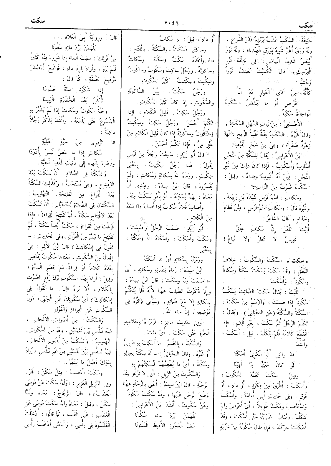 ( سكت ) السَّكْتُ والسُّكُوتُ خلافُ النُّطْقِ وقد سَكَتَ يَسْكُتُ سَكْتاً وسُكاتاً وسُكوتاً وأَسْكَتَ الليث يقال سَكَتَ الصائتُ يَسْكُتُ سُكوتاً إِذا صَمَت والاسم من سَكَت السَّكْتةُ والسُّكْتةُ عن اللحياني ويقال تَكَلَّم الرجلُ ثم سَكَت بغير أَلف فإِذا انقطع كلامُه فلم يَتَكَلَّمْ قيل أَسْكَتَ وأَنشد قد رابَني أَنَّ الكَرِيَّ أَسْكَتا لو كان مَعْنِيًّا بنَا لَهَيَّتا وقيل سَكَتَ تَعَمَّدَ السُّكُوتَ وأَسْكَتَ أَطْرَقَ من فِكْرة أَو داء أَو فَرَق وفي حديث أَبي أُمامة وأَسْكَتَ واسْتَغْضَبَ ومَكَثَ طويلاً أَي أَعْرَضَ ولم يتكلم ويقال ضَرَبْتُه حتى أَسْكَتَ وقد أَسْكَتَتْ حَرَكَتُه فإِن طالَ سُكوتُه من شَرْبة أَو داءٍ قيل به سُكات وساكَتَني فَسَكتُّ والسَّكْتَةُ بالفتح داء وأَخَذَهُ سَكْتٌ وسَكْتةٌ وسُكاتٌ وساكوتة ورجل ساكِتٌ وسَكُوتٌ وساكُوتٌ وسِكِّيتٌ وسِكْتِيتٌ كثير السُّكُوت ورجل سَكْتٌ بَيِّنُ السَّاكُوتةِ والسُّكُوتِ إِذا كان كثير السُّكُوت ورجل سَكِتٌ قليلُ الكلام فإِذا تكلم أَحسنَ ورجل سَكِتٌ وسِكِّيتٌ وساكوتُ وساكوتة إِذا كان قليل الكلام من غير عِيٍّ فإِذا تَكَلَّم أَحْسَنَ قال أَبو زيد سمعت رجلاً من قَيس يقول هذا رجل سِكْتِيتٌ بمعنى سِكِّيتٍ ورماه اللهُ بسُكاتةٍ وسُكاتٍ ولم يُفَسّروه قال ابن سيده وعندي أَن معناه بهَمٍّ يُسْكِتُه أَو بأَمْر يَسْكُت منه وأَصابَ فلاناً سُكاتٌ إِذا أَصابه داء منعه من الكلام أَبو زيد صَمَتَ الرجلُ وأَصْمَتَ وسَكَتَ وأَسْكتَ وأَسْكَتَه اللهُ وسَكَّته بمعنًى ورَمَيْتُه بسُكاته أَي بما أَسْكَتَه ابن سيده رماه بصُماته وسُكاته أَي بما صَمَتَ منه وسَكَتَ قال ابن سيده وإِنما ذكرتُ الصُّماتَ ههنا لأَنه قلما يُتَكَلَّم بسُكاته إِلاّ مع صُماته وسيأْتي ذكره في موضعه إِن شاء الله وفي حديث ماعزٍ فرمَيْناه بِجَلامِيدِ الحَرَّة حتى سَكَت أَي مات والسُّكْتة بالضم ما أُسْكِتَ به صبي أَو غيره وقال اللحياني ما له سِكْتة لِعيالِه وسُكْتة أَي ما يُطْعِمُهم فيُسْكتُهم به والسَّكُوتُ من الإِبل التي لا تَرْغُو عند الرَّحْلَة قال ابن سيده أَعني بالرَّحْلَةِ ههنا وَضْعَ الرَّحْلِ عليها وقد سَكَتَتْ سُكُوتاً وهُنَّ سُكُوتٌ أَنشد ابن الأَعرابي يَلْهَمْنَ بَرْدَ مائِهِ سُكُوتَا سَفَّ العَجُوزِ الأَقِطَ المَلْتُوتَا قال وروايةُ أَبي العَلاء يَلْهَمْنَ بَرْدَ مائِه سُفُوتَا من قولك سَفِتَ الماءَ إِذا شَرِبَ منه كثيراً فلم يَرْوَ وأَراد باردَ مائِه فوضع المصدر موضع الصفة كما قال إِذا شَكَوْنا سَنَةً حَسُوسَا تَأْكُلُ بعدَ الخُضْرَةِ اليَبيسا وحَيَّةٌ سَكُوتٌ وسُكاتٌ إِذا لم يَشعُرْ به الملسوع حتى يَلْسَعَه وأَنشد يذكر رجلاً داهية فما تَزْدَرِي من حَيَّةٍ جَبَلِيَّةٍ سُكاتٍ إِذا ما عَضَّ ليس بأَدْرَدا وذهب بالهاء إِلى تأْنيث لفظ الحية والسَّكْتَة في الصلاة أَن يَسْكُتَ بعد الافْتِتاح وهي تُسْتَحبُّ وكذلك السَّكْتَة بعد الفَراغ من الفاتحة التهذيب السَّكْتَتان في الصلاةِ تُسْتَحَبَّانِ أَن تَسْكُتَ بعد الافتتاح سَكْتةً ثم تَفتَتِح القراءة فإِذا فَرَغْتَ من القراءة سَكَتَّ أَيضاً سَكْتَةً ثم تَفْتَتح ما تيسر من القرآن وفي الحديث ما تقول في إِسْكاتَتِك ؟ قال ابن الأَثير هي إِفْعالة من السُّكوت معناها سُكوتٌ يقتضي بعده كلاماً أَو قراءَةً مع قِصَرِ المدَّة وقيل أَراد بهذا السُّكوتِ تَرْكَ رَفْعِ الصَّوْت بالكلام أَلا تراه قال ما تقول في إِسْكاتَتِك ؟ أَي سُكوتِكَ عن الجَهْر دون السُّكوت عن القراءَة والقول والسَّكْتُ من أَصوات الأَلحان شِبْهُ تَنَفُّسٍ بين نَغْمَتين وهو من السُّكوت التهذيب والسَّكْتُ من أُصول الأَلحان شِبْهُ تَنَفُّسٍ بين نَغْمَتين مِن غير تَنَفُّسٍ يُراد بذلك فصل ما بينهما وسَكَتَ الغَضَبُ مثل سَكَنَ فَتَر وفي التنزيل العزيز ولمَّا سَكَتَ عن موسى الغَضَبُ قال الزجاج معناه ول