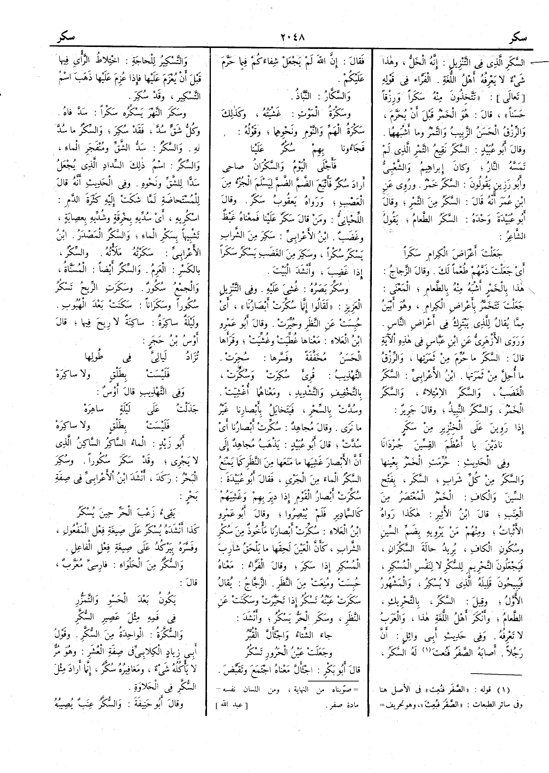 السَّكَرِ الذي في التنزيل إِنه الخَلُّ وهذا شيء لا يعرفه أَهل اللغة الفراء في قوله تتخذون منه سَكَراً ورزقاً حسناً قال هو الخمر قبل أَن يحرم والرزق الحسن الزبيب والتمر وما أَشبهها وقال أَبو عبيد السَّكَرُ نقيع التمر الذي لم تمسه النار وكان إِبراهيم والشعبي وأَبو رزين يقولون السَّكَرُ خَمْرٌ وروي عن ابن عمر أَنه قال السَّكَرُ من التمر وقال أَبو عبيدة وحده السَّكَرُ الطعام يقول الشاعر جَعَلْتَ أَعْرَاضَ الكِرامِ سَكَرا أَي جعلتَ ذَمَّهم طُعْماً لك وقال الزجاج هذا بالخمر أَشبه منه بالطعام المعنى جعلت تتخمر بأَعراض الكرام وهو أَبين مما يقال للذي يَبْتَرِكُ في أَعراض الناس وروى الأَزهري عن ابن عباس في هذه الآية قال السَّكَرُ ما حُرِّمَ من ثَمَرَتها والرزق ما أُحِلَّ من ثمرتها ابن الأَعرابي السَّكَرُ الغَضَبُ والسَّكَرُ الامتلاء والسَّكَرُ الخمر والسَّكَرُ النبيذ وقال جرير إِذا رَوِينَ على الخِنْزِيرِ مِن سَكَرٍ نادَيْنَ يا أَعْظَمَ القِسِّينَ جُرْدَانَا وفي الحديث حرمت الخمرُ بعينها والسَّكَرُ من كل شراب السَّكَر بفتح السين والكاف الخمر المُعْتَصَرُ من العنب قال ابن الأَثير هكذا رواه الأَثبات ومنهم من يرويه بضم السين وسكون الكاف يريد حالة السَّكْرَانِ فيجعلون التحريم للسُّكْرِ لا لنفس المُسْكِرِ فيبيحون قليله الذي لا يسكر والمشهور الأَول وقيل السكر بالتحريك الطعام وأَنكر أَهل اللغة هذا والعرب لا تعرفه وفي حديث أَبي وائل أَن رجلاً أَصابه الصَّقَرُ فَبُعِثَ له السَّكَرُ فقال إِن الله لم يجعل شفاءكم فيما حرم عليكم والسَّكَّار النَّبَّاذُ وسَكْرَةُ الموت غَشْيَتُه وكذلك سَكْرَةُ الهَمِّ والنوم ونحوهما وقوله فجاؤونا بِهِمْ سُكُرٌ علينا فَأَجْلَى اليومُ والسَّكْرَانُ صاحي أَراد سُكْرٌ فأَتبع الضم الضم ليسلم الجزء من العصب ورواه يعقوب سَكَرٌ وقال اللحياني ومن قال سَكَرٌ علينا فمعناه غيظ وغضب ابن الأَعرابي سَكِرَ من الشراب يَسْكَرُ سُكْراً وسَكِرَ من الغضب يَسْكَرُ سَكَراً إِذا غضب وأَنشد البيت وسُكِّرَ بَصَرُه غُشِيَ عليه وفي التنزيل العزيز لقالوا إِنما سُكِّرَتْ أَبصارُنا أَي حُبِسَتْ عن النظر وحُيِّرَتْ وقال أَبو عمرو بن العلاء معناها غُطِّيَتْ وغُشِّيَتْ وقرأَها الحسن مخففة وفسرها سُحِرَتْ التهذيب قرئ سُكِرت وسُكِّرت بالتخفيف والتشديد ومعناهما أُغشيت وسُدّت بالسِّحْرِ فيتخايل بأَبصارنا غير ما نرى وقال مجاهد سُكِّرَتْ أَبصارنا أَي سُدَّت قال أَبو عبيد يذهب مجاهد إِلى أَن الأَبصار غشيها ما منعها من النظر كما يمنع السَّكْرُ الماء من الجري فقال أَبو عبيدة سُكِّرَتْ أَبصار القوم إِذا دِيرَ بِهِم وغَشِيَهُم كالسَّمادِيرِ فلم يُبْصِرُوا وقال أَبو عمرو بن العلاء سُكِّرَتْ أَبصارُنا مأْخوذ من سُكْرِ الشراب كأَن العين لحقها ما يلحق شارب المُسكِرِ إِذا سكِرَ وقال الفراء معناه حبست ومنعت من النظر الزجاج يقال سَكَرَتْ عَيْنُه تَسْكُرُ إِذا تحيرت وسَكنت عن النظر وسكَرَ الحَرُّ يَسْكُرُ وأَنشد جاء الشِّتاءُ واجْثَأَلَّ القُبَّرُ وجَعَلَتْ عينُ الحَرُورِ تَسْكُرُ قال أَبو بكر اجْثَأَلَّ معناه اجتمع وتقبَّض والتَّسْكِيرُ للحاجة اختلاط الرأْي فيها قبل أَن يعزم عليها فإِذا عزم عليها ذهب اسم التكسير وقد سُكِرَ وسَكِرَ النَّهْرَ يَسْكُرُه سَكْراً سَدَّفاه وكُلُّ شَقٍّ سُدَّ فقد سُكِرَ والسِّكْرُ ما سُدَّ بِهِ والسَّكْرُ سَدُّ الشق ومُنْفَجِرِ الماء والسِّكْرُ اسم ذلك السِّدادِ الذي يجعل سَدّاً للشق ونحوه وفي الحديث أَنه قال للمستحاضة لما شكت إليه كثرة الدم اسْكُرِيه أَي سُدِّيه بخرقة وشُدِّيه بعضابة تشبيهاً بِسَكْر الماء والسَّكْرُ المصدر ابن الأَعرابي سَمَرْتُه ملأته والسِّكْرُ بالكسر العَرِمُ والسِّكْرُ أَيضاً المُسَنَّاةُ والجمع سُكُورٌ وسَكَرَتِ الريحُ تَسْكُرُ سُكُوراً وسَكَراناً سكنت بعد الهُبوب وليلةٌ ساكِرَةٌ سا