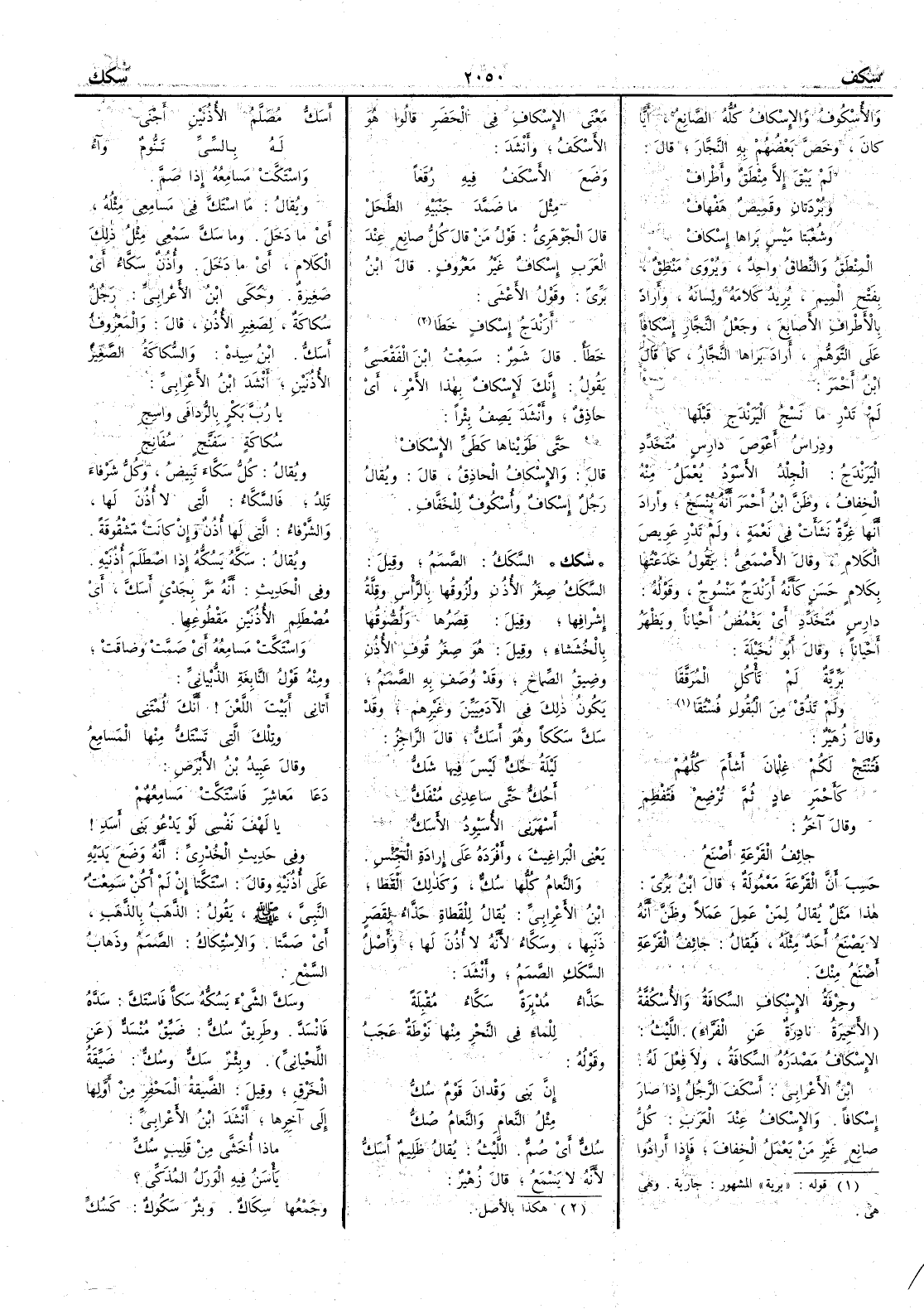 ( سكك ) السَّكَكُ الصَّمَمُ وقيل السَّكَك صِغَر الأُذن ولزوقها بالرأْس وقِلََّة إشرافها وقيل قِصَرها ولصوقها بالخُشَشاء وقيل هو صِغر فوق الأُذن وضيقُ الصِّماخ وقد وصف به الصَّمَمُ يكون ذلك في الآدميين وغيرهم وقد سَكَّ سَكَكاً وهو أَسَكُّ قال الراجز ليلةُ حَكٍّ ليس فيها شَكُّ أَحُكُ حتى ساعِدي مُنْفَكُّ أَسْهَرَنِي الأسَيْوِدُ الأسَكُّ يعني البراغيث وأَفرده على إرادة الجنس والنَّعامُ كلُّها سُكٌّ وكذلك القطا ابن الأَعرابي يقال للقطاة حَذَّاءُ لِقصَر ذنبها وسَكَّاءُ لأَنه لا أُذن لها وأَصل السَّكَك الصَّمَمُ وأَنشد حَذَّاءُ مُدْبِرَةً سَكَّاءُ مُقْبِلَةً للماء في النحر منها نَوْطَةٌ عَجَبُ وقوله إنَّ بَني وَقْدانَ قومٌ سُكُّ مثلُ النِّعامِ والنعامُ صُكُّ سُكٌّ أَي صُمُّ الليث يقال ظليم أَسَكُّ لأنه لا يسمع قال زهير أَسَكُّ مُصَلَّمُ الأُذُنينِ أَجْنَى له بالسِّيّ تَنُّومٌ وآءُ