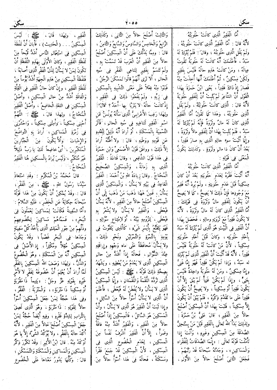 أَن الفقير في البيت هو الذي لم يُتركْ له سَبَدٌ بأَخذ حلوبته وكان قبل أَخذ حلوبته مسكيناً لأَن من كانت له حلوبة فليس فقيراً لأَنه قد أَثبت أَن الفقير الذي لم يُترَكْ له سَبَدٌ وإذا لم يكن فقيراً فهو إمّا غني وإما مسكين ومن له حلوبة واحدة فليس بغنيّ وإذا لم يكن غنيّاً لم يبق إلاّ أَن يكون فقيراً أَو مسكيناً ولا يصح أَن يكون فقيراً على ما تقدّم ذكره فلم يبقَ أَن يكون إلا مسكيناً فثبت بهذا أَن المسكين أَصلح حالاً من الفقير قال علي بن حمزة ولذلك بدأَ الله تعالى بالفقير قبل من تستحق الصّدقة من المسكين وغيره وأَنت إذا تأَملت قوله تعالى إنما الصدَقاتُ للفقراء والمساكين وجدته سبحانه قد رتبهم فجعل الثاني أَصلح حالاً من الأَول والثالث أَصلح حالاً من الثاني وكذلك الرابع والخامس والسادس والسابع والثامن قال ومما يدلك على أَن المسكين أَصلح حالاً من الفقير أَن العرب قد تسمت به ولم تتسمّ بفقيرلتناهي الفقر في سوء الحال أَلا ترى أَنهم قالوا تَمَسْكَن الرجل فَبَنَوْا منه فعلاً على معنى التشبيه بالمسكين في زِيِّه ولم يفعلوا ذلك في الفقير إذ كانت حاله لا يَتَزَيّا بها أَحدٌ ؟ قال ولهذا رَغِبَ الأَعرابيُّ الذي سأَله يونس عن اسم الفقير لتناهيه في سوء الحال فآثر التسمية بالمَسْكَنة أَو أَراد أَنه ذليل لبعده عن قومه ووطنه قال ولا أَظنه أَراد إلا ذلك ووافق قولُ الأَصمعي وابن حمزة في هذا قولَ الشافعي وقال قتادة الفقير الذي به زَمانة والمِسْكين الصحيح المحتاج وقال زيادة الله بن أَحمد الفقير القاعد في بيته لا يسأَل والمسكين الذي يسأَل فمن ههنا ذهب من ذهب إلى أَن المسكين أَصلح حالاً من الفقير لأَنه يسأَل فيُعْطَى والفقير لا يسأَل ولا يُشْعَرُ به فيُعْطَى للزومه بيته أَو لامتناع سؤاله فهو يَتَقَنَّع بأَيْسَرِ شيءِ كالذي يتقوَّت في يومه بالتمرة والتمرتين ونحو ذلك ولا يسأَل محافظة على ماء وجهه وإراقته عند السؤال فحاله إذاً أَشدَّ من حال المسكين الذي لا يَعْدَمُ من يعطيه ويشهد بصحة ذلك قوله صلى الله عليه وسلم ليس المسكينُ الذي تَرُدُّه اللُّقْمةُ واللُّقْمتانِ وإنما المسكين الذي لا يسأَل ولا يُفْطَنُ له فيُعْطَى فأَعْلَمَ أَن الذي لا يسأَل أَسوأُ حالاً من السائل وإذا ثبت أََن الفقير هو الذي لا يسأَل وأَن المسكين هو السائل فالمسكين إذاً أَصلح حالاً من الفقير والفقير أَشدّ منه فاقة وضرّاً إلاَّ أن الفقير أَشرف نفساً من المسكين لعدم الخضوع الذي في المسكين لأَن المسكين قد جمع فقراً ومسكنة فحاله في هذا أَسوأُ حالاً من الفقر ولهذا قال صلى الله عليه وسلم ليس المسكين ( الحديث ) فأَبانَ أَن لفظة المسكين في استعمال الناس أَشدّ قُبحاً من لفظة الفقير وكان الأَولى بهذه اللفظة أَن تكون لمن لا يسأَل لذل الفقر الذي أَصابه فلفظة المسكين من هذه الجهة أَشد بؤساً من لفظة الفقير وإن كان حال الفقير في القلة والفاقة أَشد من حال المسكين وأَصل المسكين في اللغة الخاضع وأَصل الفقير المحتاج ولهذا قال صلى الله عليه وسلم اللهم أَحْيِني مِسْكيناً وأَمِتْني مسكيناً واحْشُرْني في زُمْرةِ المساكين أَراد به التواضع والإِخْبات وأَن لا يكون من الجبارين المتكبرين أَي خاضعاً لك يا رب ذليلاً غير متكبر وليس يراد بالمسكين هنا الفقير المحتاج قال محمد بن المكرّم وقد استعاذ سيدنا رسول الله صلى الله عليه وسلم من الفقر قال وقد يمكن أَن يكون من هذا قوله سبحانه حكايةً عن الخِضْرِ عليه السلام أَما السفينة فكانت لمساكين يعملون في البحر فسماهم مساكين لخضوعهم وذلهم من جَوْرِ الملك الذي يأْخذ كل سفينة وجدها في البحر غَصْباً وقد يكون المسكين مُقِلاًّ ومُكْثِراً إذ الأَصل في المسكين أَنه من المَسْكَنة وهو الخضوع والذل ولهذا وصف الله المسكين بالفقر لما أَراد أَن يُعْلِمَ أَن خضوعه لفقر لا لأَمر غيره بقوله عز وجل يتيماً ذا مَقْرَبةٍ أَو مِسكيناً ذا مَتْرَبَةٍ والمَتْرَبةُ الفقر وفي هذا حجة لمن جعل المسكين أَسوأَ حالاً لقوله ذ