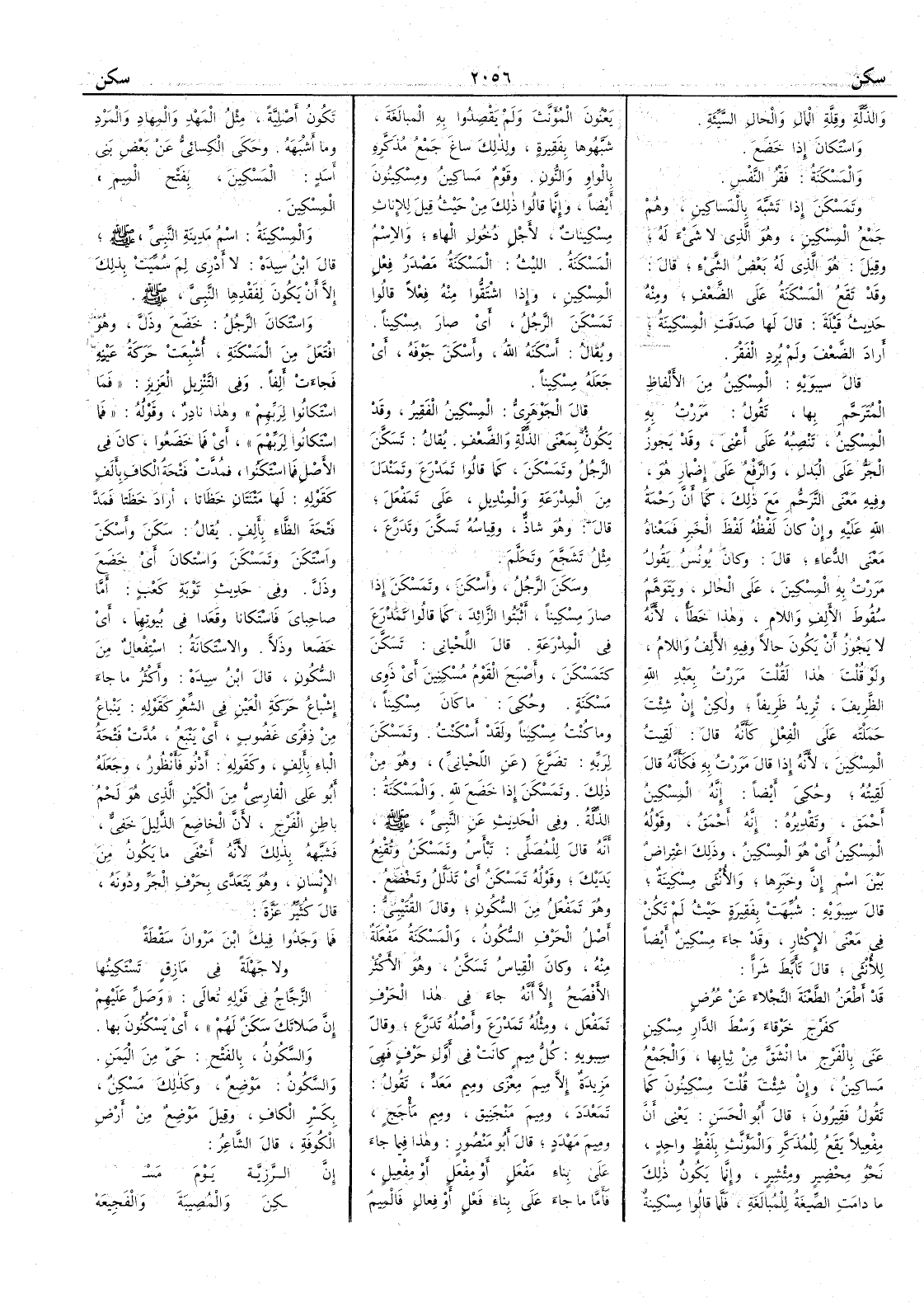والذِّلَّة وقلة المال والحال السيئة واسْتَكانَ إذا خضع والمَسْكَنة فَقْرُ النفس وتَمَسْكَنَ إذا تَشَبَّه بالمساكين وهم جمع المِسْكين وهو الذي لا شيء له وقيل هو الذي له بعض الشيء قال وقد تقع المَسْكَنة على الضَّعف ومنه حديث قَيْلة قال لها صَدَقَت المِسْكِينةُ أَراد الضِّعف ولم يرد الفقر قال سيبويه المِسْكين من الأَلفاظ المُتَرَحَّمِ بها تقول مررت به المِسْكين تنصبه على أَعني وقد يجوز الجرّ على البدل والرفع على إضمار هو وفيه معنى الترحم مع ذلك كما أَن رحمةُ الله عليه وإن كان لفظه لفظ الخبر فمعناه معنى الدعاء قال وكان يونس يقول مررت به المسكينَ على الحال ويتوهم سقوط الأَلف واللام وهذا خطأٌ لأَنه لا يجوز أَن يكون حالاً وفيه الأَلف واللام ولو قلت هذا لقلت مررت بعبد الله الظريفَ تريد ظريفاً ولكن إنْ شئت حملته على الفعل كأَنه قال لقيت المسكين لأَنه إذا قال مررت به فكأَنه قال لقيته وحكي أَيضاً إنه المسكينُ أَحْمَقُ وتقديرُه إنه أَحمق وقوله المسكينُ أَي هو المسكينُ وذلك اعتراضٌ بين اسم إن وخبرها والأُنثى مِسْكينة قال سيبويه شبهت بفقيرة حيث لم تكن في معنى الإِكْثار وقد جاء مِسْكين أَيضاً للأُنثى قال تأَبط شرّاً قد أَطْعَنُ الطَّعْنةَ النَّجْلاءَ عن عُرُضٍ كفَرْجِ خَرْقاءَ وَسْطَ الدارِ مِسْكينِ عنى بالفرج ما انشق من ثيابها والجمع مَساكين وإن شئت قلت مِسْكينون كما تقول فقيرون قال أَبو الحسن يعني أَن مِفْعيلاً يقع للمذكر والمؤنث بلفظ واحد نحو مِحْضِير ومِئْشير وإنما يكون ذلك ما دامت الصيغة للمبالغة فلما قالوا مِسْكينة يعنون المؤنث ولم يقصدوا به المبالغة شبهوها بفقيرة ولذلك ساغ جمع مذكره بالواو والنون وقوم مَساكينُ ومِسْكِينون أَيضاً وإنما قالوا ذلك من حيث قيل للإناث مِسْكينات لأَجل دخول الهاء والاسم المَسْكَنة الليث المَسْكَنة مصدر فِعْل المِسْكين وإذا اشتقوا منه فعلاً قالوا تَمَسْكَنَ الرجلُ أَي صار مِسكيناً ويقال أَسْكَنه الله وأَسْكَنَ جَوْفَه أَي جعله مِسْكيناً قال الجوهري المسكين الفقير وقد يكون بمعنى الذِّلَّة والضعف يقال تَسَكَّن الرجل وتَمَسْكَن كما قالوا تَمَدْرَعَ وتَمَنْدَلَ من المِدْرَعَة والمِنْديل على تَمَفْعَل قال وهو شاذ وقياسه تَسَكَّنَ وتَدرَّعَ مثل تشَجَّع وتحَلَّم وسَكَن الرجلُ وأَسْكَن وتمَسْكَنَ إذا صار مِسكيناً أَثبتوا الزائد كما قالوا تَمَدْرَع في المِدرعة قال اللحياني تَسَكَّن كتَمَسْكَن وأَصبح القومُ مُسْكِنين أَي ذوي مَسْكنة وحكي ما كان مسكيناً وما كنت مسكيناً ولقد أَسكَنْتُ وتمسكَنَ لربه تضَرَّع عن اللحياني وهو من ذلك وتمسكن إذا خضع لله والمَسْكَنة الذِّلَّة وفي الحديث عن النبي صلى الله عليه وسلم أَنه قال للمصلي تَبْأَسُ وتمسْكَنُ وتُقْنِع يديك وقوله تمسْكَنُ أَي تذَلَّل وتَخْضَع وهو تَمَفْعَل من السكون وقال القتيبي أَصل الحرف السُّكون والمَسْكَنة مَفْعلة منه وكان القياس تسَكَّن وهو الأَكثر الأَفصح إلا أَنه جاءَ في هذا الحرف تَمَفْعَل ومثله تمَدْرَع وأَصله تَدرَّع وقال سيبويه كل ميم كانت في أَول حرف فهي مزيدة إلا ميم مِعْزى وميم مَعَدٍّ تقول تمَعْدَد وميم مَنْجَنِيق وميم مَأْجَج وميم مَهْدَد قال أَبو منصور وهذا فيما جاء على بناء مَفْعَل أَو مِفْعَل أَو مِفْعيل فأَما ما جاء على بناء فَعْلٍ أَو فِعالٍ فالميم تكون أَصلية مثل المَهْدِ والمِهاد والمَرَد وما أَشبهه وحكى الكسائي عن بعض بني أَسد المَسْكين بفتح الميم المِسْكين والمِسْكينة اسم مدينة النبي صلى الله عليه وسلم قال ابن سيده لا أَدري لمَ سميت بذلك إلا أَن يكون لفقدها النبي صلى الله عليه وسلم واستَكان الرجل خَضَع وذلَّ وهو افتَعَل من المَسْكَنة أُشبعت حركة عينه فجاءت أَلفاً وفي التنزيل العزيز فما استَكانوا لربهم وهذا نادر وقوله فما استكانوا لربهم أَي فما خضعوا كان في الأَصل فما استَكَنُوا فمدّت فتحة الكاف بأَلف كقوله لها مَتْنتان خَظانا أَراد خ