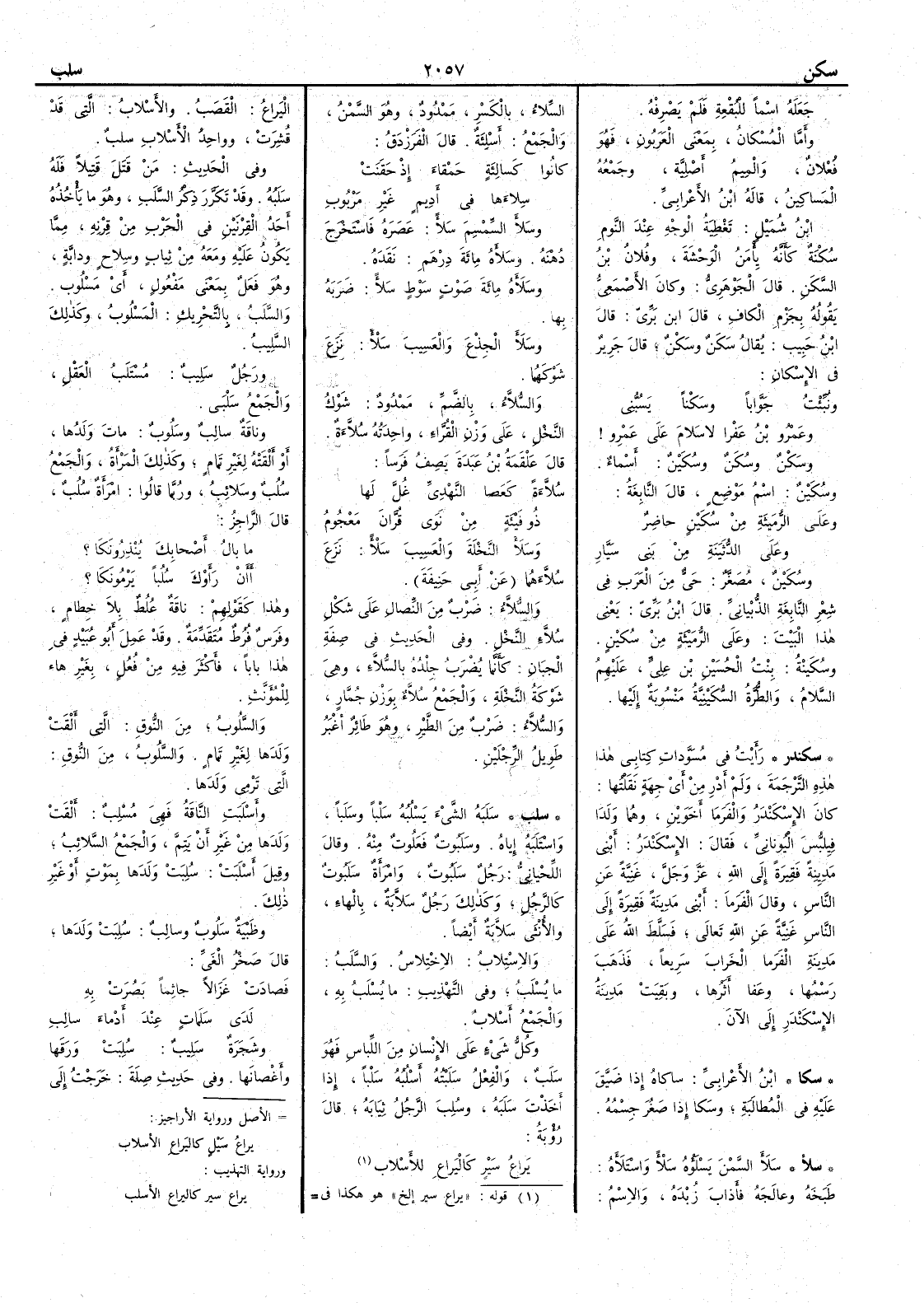 جعله اسماً للبقعة فلم يصرفه وأَما المُسْكان بمعنى العَرَبون فهو فُعْلال والميم أَصلية وجمعه المَساكين قاله ابن الأَعرابي ابن شميل تغطية الوجه عند النوم سُكْنة كأَنه يأْمن الوحشة وفلان بنُ السَّكَن قال الجوهري وكان الأَصمعي يقوله بجزم الكاف قال ابن بري قال ابن حبيب يقال سَكَنٌ وسَكْنٌ قال جرير في الإسكان ونُبِّئْتُ جَوَّاباً وسَكْناً يَسُبُّني وعَمْرو بنُ عَفْرا لا سلامَ على عمرو وسَكْنٌ وسُكَنٌ وسُكَينٌ أَسماء وسُكَينٌ اسم موضع قال النابغة وعلى الرُّمَيْثة من سُكَينٍ حاضرٌ وعلى الدُّثَيْنةِ من بني سَيَّارِ وسُكَينٌ مصغر حيّ من العرب في شعر النابغة الذُّبياني قال ابن بري يعني هذا البيت وعلى الرُّميثة من سُكين وسُكَيْنة بنت الحُسَين بن علي عليهم السلام والطُّرَّة السُّكَيْنِيَّة منسوبة إليها ( سكندر ) رأَيت في مسودّات كتابي هذا هذه الترجمة ولم أَدر من أَي جهة نقلتها كان الإِسْكَنْدَرُ والفَرَما أَخوين وهما ولدا فيلبس اليوناني فقال الإِسكندر أَبني مدينة فقيرة إِلى الله عز وجل غنية عن الناس وقال الفرما أَبني مدينة فقيرة إِلى الناس غنية عن الله تعالى فسلط الله على مدينة الفرما الخراب سريعاً فذهب رسمها وعفا أَثرها وبقيت مدينة الإِسكندر إِلى الآن ( سكا ) ابن الأَعرابي ساكاهُ إذا ضيَّق عليه في المطالبة وسكا إذا صغُر جسمه ( سلأ ) سَلأَ السَّمْنَ يَسْلَؤُه سَلأً واسْتَلأَه طَبَخَه وعالَجَه فأَذَابَ زُبْدَه والاسم السِّلاءُ بالكسر ممدود وهو السمن والجمع أَسْلِئةُ قال الفرزدق