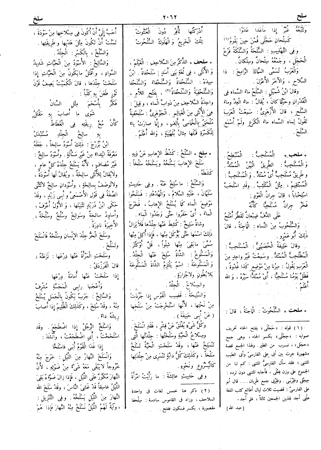 ( سلخ ) السَّلْخُ كُشْطُ الإِهابِ عنِ ذيهِ سَلَخَ الإِهابَ يَسْلُخه ويَسْلَخه سَلْخاً كَشَطه والسَّلْخُ ما سُلِخَ عنه وفي حديث سليمان عليه السلام والهُدْهُدِ فَسَلَخوا موضعَ الماءِ كما يُسْلَخُ الإِهابُ فخرج الماء أَي حفروا حتى وجدوا الماء وشاة سَلِيخٌ كَشِطَ عنها جلدُها فلا يزال ذلك اسمَها حتى يُوءكل منها فإِذا أُكل منها سمي ما بقيَ منها شِلْواً قلَّ أَو كثر والمَسْلوخ الشاة سُلِخَ عنها الجلد والمَسْلوخة اسم يَلْتَزِمُ الشاة المسلوخة بلا بُطونٍ ولا جُزارة والمِسْلاخُ الجِلْد والسَّلِيخة قضيب القوس إِذا جُرِّدَتْ من نَحْتِها لأَنها اسْتُخْرِجَتْ من سَلْخِها عن أَبي حنيفة وكل شيء يُفْلَقُ عن قِشْر فقد انْسَلَخَ ومِسْلاخ الحية وسَلْخَتها جِلْدَتها التي تَنْسَلِخُ عنها وقد سَلَخَتِ الحيةُ تسلَخُ سَلْخاً وكذلك كل دابة تَنْسَرِي من جِلْدَتها كاليُسْرُوعِ ونحوه وفي حديث عائشة ما رأَيت امرأَة أَحبُّ إِليَّ أَن أَكونَ في مِسْلاخها من سَوْدةَ تمنت أَن تكون مثل هَدْيها وطريقتها والسِّلْخُ بالكسر الجِلْد والسالخُ الأَسْوَدُ من الحيات شديدُ السواد وأَقْتَلُ ما يكون من الحيات إِذا سَلَخَت جِلْدَها قال الكميت يصف قَرْنَ ثور طعن به كلباً فَكَرَّ بأَسْحَمَ مثلِ السِّنانِ شَوَى ما أَصابَ به مَقْتَلُ كأَنْ مُخَّ رِيقَتِه في الغُطَاطْ به سالخُ الجِلْدِ مُسْتَبْدَلُ ابن بُزُرْج ذلك أَسودُ سالِخاً جعله معرفة ابتداء من غير مسأَلة وأَسْوَدُ سالخٌ غيرَ مضاف لأَنه يَسْلَخ جلده كلَّ عام ولا يقال للأُنثى سالخة ويقال لها أَسْوَدَةُ ولا توصف بسالخة وأَسْوَدانِ سالخٌ لا تثنى الصفة في قول الأصمعي وأَبي زيد وقد حكى ابن دريد تثنيتها والأَول أَعرف وأَساوِدُ سالخةٌ وسَوالخُ وسُلَّخٌ وسُلَّخةٌ الأَخيرة نادرة وسَلَخَ الحَرُّ جلدَ الإِنسان وسَلَّخه فانْسَلَخ وتَسَلَّخ وسَلَخَت المرأَة عنها دِرْعَها نزعته قال الفرزدق إِذا سَلَخَتْ عنها أُمامةُ دِرْعَها وأَعْجَبها رابي المَجَسَّةِ مُشْرِفُ والسالخُ جَرَبٌ يكون بالجمل يُسْلَخُ منه وقد سُلِخَ وكذلك الظليم إِذا أَصاب ريشَه داءٌ واسْلَخَّ الرجل إِذا اضطجع وقد اسْلَخَخْتُ أَي اضطجعت وأَنشد إِذا غَدا القومُ أَبى فاسْلَخَّا وانْسَلَخَ النهار من الليل خرج منه خروجاً لا يبقى معه شيء من ضوئه لأَن النهار مُكَوَّر على الليل فإِذا زال ضوؤه بقي الليل غاسقاً قد غَشِيَ الناسَ وقد سَلَخ اللهُ النهارَ من الليل يَسْلخُه وفي التنزيل وآية لهم الليل نَسْلَخُ منه النهار فإِذا هم