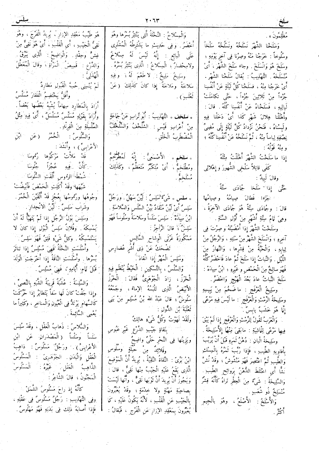 مظلمون وسَلَخْنا الشهرَ نَسْلَخُه ونَسْلُخُه سَلْخاً وسلوخاً خرجنا منه وصِرْنا في آخر يومه وسَلَخَ هو وانسَلخ وجاءَ سَلْخَ الشهر أَي مُنْسَلَخَه التهذيب يقال سَلَخْنا الشهر أَي خرجنا منه فسَلَخْنا كل ليلة عن أَنفسنا كلَّه قال وأَهْلَلْنا هِلالَ شهر كذا أَي دخلنا فيه ولبسناه فنحن نزداد كل ليلة إِلى مضيِّ نصفه لِباساً منه ثم نَسْلَخُه عن أَنفسنا جزءاً من ثلاثين جزءاً حتى تكاملت ليليه فسلَخناه عن أنفسنا كلَّه ومنه قوله إِذا ما سَلَخْتُ الشهرَ أَهْلَلْتُ مثلَه كَفَى قاتِلاً سَلْخِي الشُّهورَ وإِهْلالي وقال لبيد حتى إِذا سَلَخا جُمادَى ستَّةً جَزْءاً فطالَ صيامُه وصيامُها قال وجمادى ستة هو جمادى الآخرة وهي تمام ستة أَشهر من أَول السنة وسَلَخْتُ الشهر إِذا أَمضيته وصرت في آخره وانسلَخَ الشهرُ من سَنته والرجلُ من ثيابه والحيةُ من قشرها والنهارُ من الليل والنبات إِذا سَلَخ ثم عاد فاخْضَرَّ كلُّه فهو سالخٌ من الحَمْض وغيره ابن سيده سَلَخَ النباتُ عاد بعد الهَيْج واخْضَرَّ وسَلِيخ العَرْفَج ما ضَخُمَ من يَبِيسه وسَلِيخةُ الرِّمْثِ والعَرْفَج ما ليس فيه مَرْعىً إِنما هو خشب يابس والعرب تقول للرِِّمْث والعَرْفَج إِذا لم يبق فيهما مَرْعىً للماشية ما بقي منهما إِلا سَلِيخة وسَلِيخةُ البانِ دُهْنُ ثَمره قبل أَن يُربَّبَ بأفاويه الطِّيب فإِذا رُبِّبَ ثمره بالمسك والطيب ثم اعْتُصِر فهو مَنْشُوشٌ وقد نُشَّ نَشّاً أَي اختلط الدهنُ بروائح الطيب والسَّلِيخة شيء من العِطْر تراه كأَنه قِشْرٌ مُنْسَلخ ذو شُعَبٍ والأَسْلخُ الأَصْلَعُ وهو بالجيم أَكثر والمِسْلاخُ النخلة التي يَنْتَثِر بُسْرُها وهو أَخضر وفي حديث ما يَشْتَرِطُه المشتري على البائع إِنه ليس له مِسْلاخ ولا مِحْضار المِسْلاخ الذي ينتثر بُسْرُه وسَلِيخٌ مَلِيخٌ لا طعم له وفيه سَلاخَة ومَلاخة إِذا كان كذلك عن ثعلب ( سلخف ) التهذيب أَبو تراب عن جماعة من أَعراب قيس الشِّلَّخْفُ والسِّلَّخْفُ المُضْطرِبُ الخَلق ( سلخم ) الأَصمعي إِنه لَمُطْرَخِمٌّ ومُطْلَخِمّ أَي متكبِّر متعظم وكذلك مُسْلَخِمّ ( سلس ) شيء سَلِسٌ لَيّنٌ سهل ولرجلٌ سَلِسٌ أَي لَيِّنٌ منقاد بين السَّلَسِ والسَّلاسَةِ ابن سيده سَلِسَ سَلَساً وسَلاسَة وسُلُوساً فهو سَلِسٌ قال الراجز ممكورَةٌ غَرْثى الوِشاحِ السَّالِسِ تَضْحَكُ عن ذي أُشُرٍ عُضارِسِ وسَلِسَ المُهْرُ إِذا انقاد والسَّلْسُ بالتسكين الخيط ينظم فيه الخَرَزُ زاد الجوهري فقال الخَرَزٌ الأَبيضُ الذي تلبَسُه الإِماء وجمعه سُلُوسٌ قال عبد اللَّه بن مسلم من بني ثعلبة بن الدُّول ولقد لَهَوتُ وكلُّ شيء هالِكٌ بنَقاةِ جَيْبِ الدِّرْعِ غيرِ عَبُوسِ ويَزينُها في النَّحْرِ حَلْيٌ واضِحٌ وقَلائدٌ من حُبْلَةٍ وسُلُوسِ ابن بري النقاة النقية يريد أَن الموضع الذي يقع عليه الجيب منها نقيّ قال ويجوز أَن يريد أَن ثوبها نقي وأَنها ليست بصاحبة مَهْنَةٍ ولا خِدْمَة وقد يعبرون بالجيب عن القلب لأَنه يكون عليه كما يعبرون بمعْقِد الإِزار عن الفرج فيقال هو طيب معقد الإِزار يريد الفرج وهو نَقيُّ الجَيْب أَي القلب أَي هو نَقِيٌّ من غِشٍّ وحِقْد والواضح الذي يَبْرُق والدرع قميص المرأَة وقال المُعَطَّلُ الهذلي لم يُنْسِني حُبَّ القَبُولِ مَطارِدٌ وأَفَلُّ يَخْتَضِمُ الفَقارَ مُسَلَّسُ أَراد بالمَطارد سهاماً يشبه بعضها بعضاً وأَراد بقوله مُسَلَّسٌ مُسَلْسَلٌ أَي فيه مثل السَّلْسِلة من الفِرِنْدِ والسُّلُوس الخُمرُ عن ابن الأَعرابي وأَنشد قد مَلأَتْ مَرْكُوَّها رُؤُوسا كأَنَّ فيه عُجُزاً جُلُوسا شُمْطَ الرُّؤُوسِ أَلْقَتِ السُّلُوسا شبهها وقد أَكلت الحَمْض فابيضت وجوهها ورؤوسها بعُجُزٍ قد أَلقين الخُمُر وشراب سَلِسٌ لَيِّنُ الانحدار وسَلِسَ بولُ الرجل إِذا لم يتهيأْ له أَن يمسكه وفلان سَلِسُ البول إِذا كان لا يستمسكه وكل شيء قَلِق فهو سَلِسٌ وأَسْلَسَت النخلةُ فهي مُسْلِسٌ إِذا ت