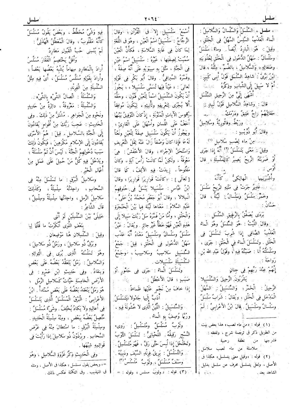 أَنه إِذا جَرى أَو ضَرَبَتْه الرِّيح يصير كالسِّلْسِلة قال أَوس وأَشْبَرَنِيها الهالِكِيُّ كأَنَّه غَديرٌ جَرَت في مَتنِه الرِّيحُ سَلْسَلُ وخَمْرٌ سَلْسَلٌ وسَلْسال لَيِّنَة قال حَسَّان بَرَدى يُصَفَّقُ بالرَّحِيق السَّلْسَل وقال الليث هو السَّلْسَل وهو الماء العَذْب الصافي إِذا شُرب تَسَلْسَل في الخَلْق وتَسَلْسَلَ الماءُ في الخلق جَرى وسَلْسَلْته أَنا صَبَبْته فيه وقول عبد الله بن رَواحَة إِنَّهُمْ عندَ رَبِّهِم في جِنانٍ يَشْرَبُون الرَّحِيقَ والسَّلْسَبيلا الرَّحِيق الخَمْر والسَّلْسَبيل السَّهْل المَدْخَل في الحَلْق ويقال شَرابٌ سَلْسَلٌ وسَلْسالٌ وسَلْسَبيلٌ قال ابن الأَعرابي لم أَسمع سَلْسَبيل إِلاَّ في القرآن وقال الزجاج سَلْسَبيل اسم العين وهو في اللغة لما كان في غاية السَّلاسة فكأَنَّ العين سُمِّيت لصِفتها غيره سَلْسَبيل اسم عين في الجنة مَثَّلَ به سيبويه على أَنه صفة وفسره السيرافي وقال أَبو بكر في قوله تعالى عَيْناً فيها تُسَمَّى سَلْسَبيلاً يجوز أَن يكون السَّلْسَبيل اسماً للعين فنُوِّن وحَقُّه أَن لا يُجْرى لتعريفه وتأْنيثه ليكون موافقاً رؤوس الآيات المُنوَّنة إِذ كان التوفيق بينهما أَخَفَّ على اللسان وأَسهل على القارئ ويجوز أَن يكون سَلْسَبيل صفة للعين ونعتاً له فإِذا كان وصفاً زال عنه ثِقَلُ التعريف واسْتَحَقَّ الإِجراء وقال الأَخفش هي مَعْرِفة ولكن لما كانت رأْس آية وكان مفتوحاً زيدت فيه الأَلف كما قال كانت قوارير قواريراً وقال ابن عباس سَلْسَبيلاً يَنْسَلُّ في حُلوقهم انْسِلالاً وقال أَبو جعفر محمد بن علي عليه السلام معناها لَيِّنة فيما بين الحَنْجَرَة والحلق وأَما من فسره سَلْ رَبَّك سَبيلاً إِلى هذه العين فهو خطأٌ غير جائز ويقال عين سَلْسَلٌ وسَلْسالٌ وسَلْسَبيلٌ معناه أَنه عَذْب سَهْل الدخول في الحلق قيل جمع السَّلْسَبيل سَلاسِبُ وسَلاسِيبُ وجمع السَّلْسَبيلة سَلْسَبيلات وتَسَلْسَل الماءُ جَرى في حَدُور أَو صَبَب قال الأَخطل إِذا خاف من نَجْمٍ عليها ظَماءَةً أَدَبَّ إِليها جَدْوَلاً يَتَسَلْسَلُ والسَّلْسَبيل اللَّيِّن الذي لا خشونة فيه وربما وُصف به الماء وثوب مُسَلْسَلٌ ومُتَسَلْسِلٌ رديء النَّسْج رَقِيقه اللحياني تَسَلْسَل الثوبُ وتَخَلْخَل إِذا لُبِس حتى رَقَّ فهو مُتَسَلْسِلٌ والتَّسَلْسُل بَريق فِرِنْد السيف ودَبيبُه وسَيْفٌ مُسَلْسَل وثوب مُلَسْلَسٌ