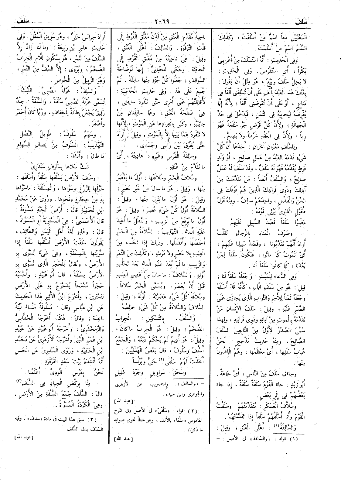 المعنيين معاً اسم من أَسلفت وكذلك السلَم اسم من أَسْلَمْتُ وفي الحديث أَنه اسْتَسْلَفَ من أَعرابي بَكراً أَي اسْتَقْرَضَ وفي الحديث لا يَحِلُّ سَلَفٌ وبَيْعٌ هو مثل أَن يقول بعتُك هذا العبد بأَلف على أَن تُسْلِفَني أَلفاً في مَتاع أَو على أَن تُقْرِضَني أَلفاً لأَنه إنما يُقْرِضُه لِيُحابيَه في الثمن فيدخل في حدّ الجهَالة ولأَنَّ كل قَرْض جَرَّ مَنْفعةً فهو رِباً ولأَنَّ في العقْد شرطاً ولا يَصِحُّ وللسَّلَف مَعْنيان آخران أَحدهما أَن كل شيء قدَّمه العبدُ من عمل صالح أَو ولد فَرَط يُقَدِّمه فهو له سَلَفٌ وقد سَلَفَ له عمل صالح والسلَفُ أَيضاً من تقدَّمَك من آبائك وذوي قَرابَتِك الذين هم فوقَك في السنِّ والفَضْل واحدهم سالِفٌ ومنه قول طُفيل الغَنَوي يَرْثي قومه مَضَوْا سَلَفاً قَصْدُ السبيلِ عليهمُ وصَرْفُ المَنايا بالرِّجال تَقَلَّبُ أَراد أَنهم تقدّمونا وقصدُ سَبيلِنا عليهم أَي نموت كما ماتوا فنكون سَلَفاً لمن بعدنا كما كانوا سلفاً لنا وفي الدعاء للميت واجعله سلَفاً لنا قيل هو من سَلَفِ المال كأَنه قد أَسْلَفَه وجعله ثمناً للأَجر والثواب الذي يُجازى على الصبر عليه وقيل سَلَفُ الإنسان مَن تقدَّمه بالموت من آبائه وذوي قَرابته ولهذا سمي الصدْر الأَول من التابعين السلَف الصالح ومنه حديث مَذْحِجٍ نحن عُبابُ سَلَفِها أَي مُعْظَمها وهم الماضون منها وجاءَني سَلَفٌ من الناس أَي جماعة أَبو زيد جاء القوم سُلْفةً سُلفةً إذا جاء بعضهم في إثر بعض وسُلاَّفُ العَسْكر مُتَقَدِّمتُهم وسَلَفْتُ القوم وأَنا أَسْلُفُهم سَلَفاً إذا تقدَّمْتهم والسالِفةُ أَعلى العُنُق وقيل ناحيةُ مُقدَّمِ العنق من لَدُنْ مُعَلَّقِ القُرْط على قَلْتِ التَّرْقُوَةِ والسالِفُ أَعلى العنق وقيل هي ناحيته من معلق القرط على الحاقنة وحكى اللحياني إنها لوَضّاحةُ السَّوالِفِ جعلوا كل جزء منها سالِفةً ثم جمع على هذا وفي حديث الحديبية لأُقاتِلَنَّهم على أَمْري حتى تَنْفَرد سالِفتي هي صَفْحة العنق وهما سالِفَتانِ من جانِبَيه وكَنى بانْفِرادِها عن الموت لأَنها لا تنفرد عما يليها إلا بالموت وقيل أَراد حتى يُفَرَّقَ بين رأْسي وجَسدي وسالِفةُ الفرَس وغيره هادِيتُه أَي ما تقدَّم من عُنقه وسُلافُ الخمر وسُلافَتُها أَوَّل ما يُعْصَر منها وقيل هو ما سال من غير عصر وقيل هو أَوَّلُ ما ينزل منها وقيل السُلافةُ أَوَّلُ كل شيء عُصِر وقيل هو أَوَّل ما يُرفع من الزبيب والنَّطْلُ ما أَعِيدَ عليه الماء التهذيب السُّلافةُ من الخمر أَخْلَصُها وأَفْضَلُها وذلك إذا تَحَلَّب من العنب بلا عَصْرٍ ولا مَرْثٍ وكذلك من التمر والزبيب ما لم يُعَدْ عليه الماء بعد تَحَلُّب أَوَّله والسلافُ ما سال من عصير العنب قبل أَن يعصر ويسمى الخمر سُلافاً وسُلافةُ كلِّ شيء عصرْتَه أَوَّلُه وقيل السلافُ والسلافةُ من كل شيء خالِصُه والسَّلْفُ بالتسكين الجِرابُ الضَخْمُ وقيل هو الجراب ما كان وقيل هو أَدِيمٌ لم يُحْكَمْ دَبْغُه والجمع أَسْلُفٌ وسُلُوفٌ قال بعض الهذليين أَخَذْتُ لهم سَلْفَيْ حَتِيٍّ وبُرْنُسا وسَحْقَ سَراويلٍ وجَرْدَ شَلِيلِ أَراد جِرابَيْ حَتِيٍّ وهو سَوِيقُ المُقْلِ وفي حديث عامر بن ربيعة وما لنا زاد إلا السَّلْفُ من التمر هو بسكون اللام الجِرابُ الضخْمُ ويروى إلا السّفُّ من التمر وهو الزَّبيلُ من الخوص والسَّلِفُ غُرْلةُ الصبيّ الليث تسمى غُرْلةُ الصبيّ سُلْفَةً والسُّلفةُ جلد رقيق يجعل بِطانةً للخِفافِ وربما كان أَحمرَ وأَصفر وسَهْم سَلُوفٌ طويلُ النصْلِ التهذيب السّلُوفُ من نِصالِ السِّهامُ ما طالَ وأَنشد شَكَّ سَلاها بِسَلُوفٍ سَنْدَرِيّ وسَلَفَ الأَرضَ يَسْلُفُها سَلْفاً وأَسْلَفَها حَوَّلها للزرْعِ وسَوَّاها والمِسْلَفَةُ ما سَوَّاها به من حجارة ونحوها وروي عن محمد بن الحنفية قال أَرض الجنة مَسْلُوفَةٌ قال الأَصمعي هي المستَوية أَو المُسَوَّاةُ قال وهذه لغة أَهل اليمن والطائف 