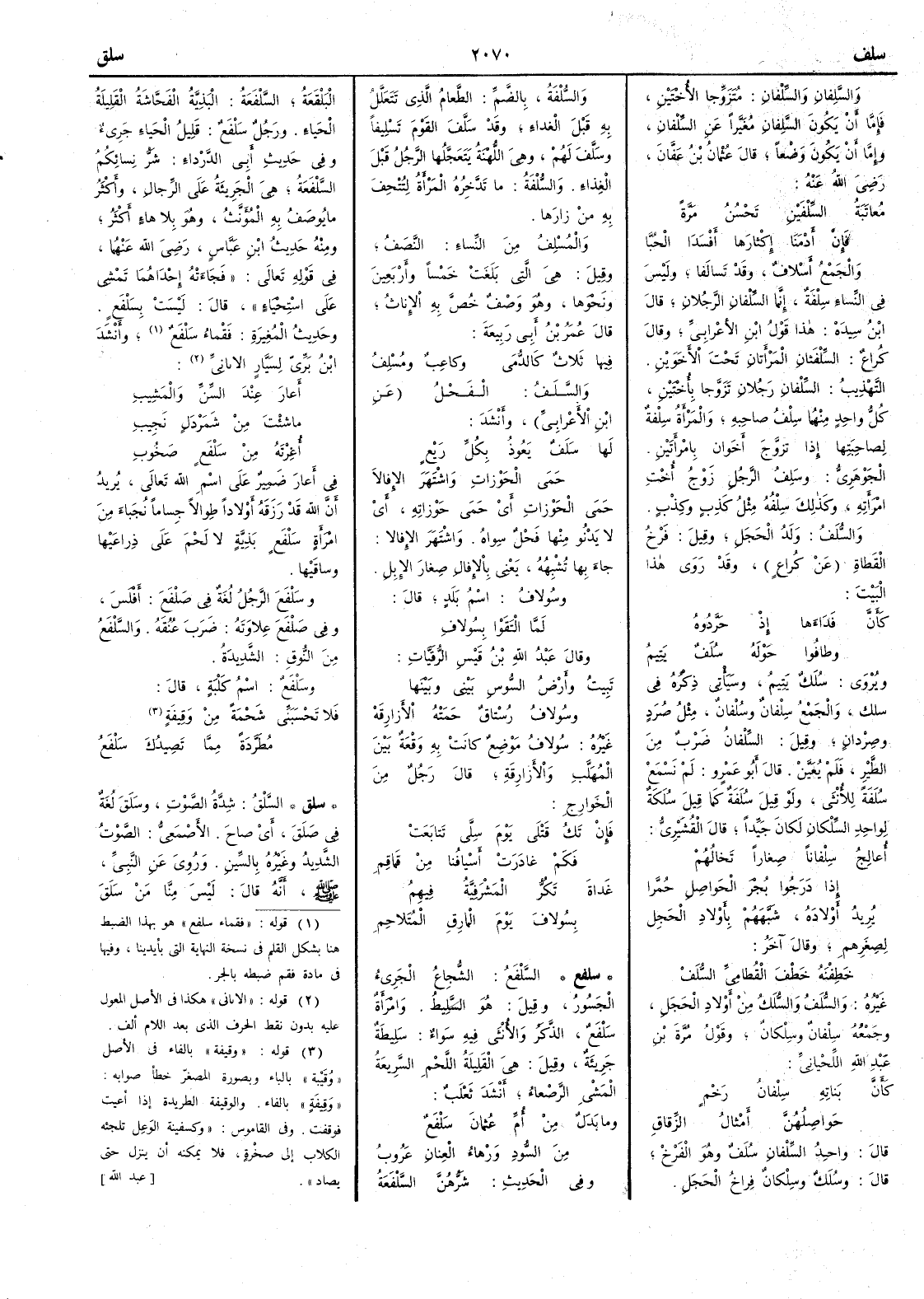 والسَّلِفانِ والسَّلْفان مُتَزَوِّجا الأَُختين فإما أَن يكون السَّلِفانِ مُغَيَّراً عن السِّلْفانِ وإما أَن يكون وضعاً قال عثمان بن عفان رضي اللّه عنه مُعاتَبةُ السِّلْفَيْنِ تَحْسُنُ مَرَّةً فإنْ أَدْمَنا إكْثارَها أَفْسَدَا الحُبَّا والجمع أسْلافٌ وقد تَسالَفا وليس في النساء سِلْفةٌ إنما السِّلْفانِ الرَّجلانِ قال ابن سيده هذا قول ابن الأَعرابي وقال كراع السِّلْفتان المرأَتان تحت الأَخَوين التهذيب السِّلْفانِ رجلان تزوَّجا بأُختين كلُّ واحدٍ منهما سِلْفُ صاحبه والمرأَة سِلْفةٌ لصاحِبتها إذا تزوَّج أَخَوان بامرأَتين الجوهري وسَلِفُ الرَّجل زوجُ أُخْتِ امرأَته وكذلك سِلْفه مثل كَذِبٍ وكِذْبٍ والسُّلَفُ ولد الحَجَلِ وقيل فَرْخُ القَطاةِ عن كراع وقد روى هذا البيت كأَنَّ فَدَاءَها إذْ حَرَّدُوه وطافوا حَوْلَهُ سُلَفٌ يَتِيمُ ويروى سُلَكٌ يَتِيمُ وسيأْتي ذكره في حرف الكاف والجمع سِلْفانٌ وسُلْفانٌ مثل صُرَدٍ وصِرْدانٍ وقيل السّلْفانُ ضرب من الطير فلم يُعَيَّن قال أَبو عمرو لم نسمع سُلَفةً للأُنثى ولو قيل سُلَفةٌ كما قيل سُلَكَةٌ لواحد السِّلْكانِ لكان جيِّداً قال القشيري أُعالِجُ سِلْفاناً صِغاراً تَخالُهُمْ إذا دَرَجُوا بُجْرَ الحَواصِل حُمَّرَا يريد أَولاده شبههم بأَولاد الحجل لِصِغَرِهم وقال آخر خَطِفْنَه خَطْفَ القُطامِيِّ السُّلَفْ غيره والسُّلَفُ والسُّلَكُ من أَولاد الحَجل وجمعه سِلْفانٌ وسِلْكانٌ وقول مُرَّةَ بن عبداللّه اللحياني كأَنَّ بَناتِه سِلْفانُ رَخْمٍ حَواصِلُهُنَّ أَمثالُ الزِّقاقِ قال واحد السِّلْفان سُلَف وهو الفَرْخُ قال وسُلَكٌ وسِلْكانٌ فِراخُ الحَجل والسلْفةُ بالضمّ الطعامُ الذي تَتَعَلَّلُ به قبل الغِذاء وقد سَلِّفَ القومَ تَسْلِيفاً وسَلَّفَ لهم وهي اللُّهنة يَتَعَجَّلُها الرجلُ قبيل الغذاء والسُّلفةُ ما تَدَّخِرُه المرأَةُ لِتُتْحِفَ به مَن زارَها والمُسْلِفُ من النساء النَّصَفُ وقيل هي التي بلغت خمساً وأَربعين ونحوها وهو وصْف خُصّ به الإناثُ قال عمر بنُ أَبي ربيعةَ فيها ثَلاثٌ كالدُّمَى وكاعِبٌ ومُسْلِفُ والسَّلَفُ الفَحْلُ عن ابن الأَعرابي وأَنشد لها سَلَفٌ يَعُوذُ بكُلِّ رَيْعٍ حَمَى الحَوْزاتِ واشْتَهَرَ الإفالا حَمَى الحَوْزاتِ أَي حَمَى حَوْزاتِه أَي لا يدنو منها فحل سواه واشْتَهَرَ الإفالا جاء بها تُشبهُه يعني بالإفالِ صِغارَ الإبل وسُولاف اسم بلد قال لما الْتَقَوْا بِسُولاف وقال عبداللّه بن قيْس الرُّقّيات تَبِيتُ وأَرْضُ السُّوسِ بيني وبينها وسُولافُ رُسْتاقٌ حَمَتْه الأَزارِقهْ غيره سُولافُ موضع كانت به وقعة بين المُهَلَّبِ والأَزارِقةِ قال رجل من الخوارج فإن تَكُ قَتْلَى يومَ سِلَّى تَتابعَتْ فَكَمْ غادَرَتْ أَسْيافُنا من قَماقِمِ غَداةَ تَكُرُّ المَشْرَفِيّةُ فِيهِمُ بِسُولافَ يومَ المارِقِ المُتَلاحِمِ