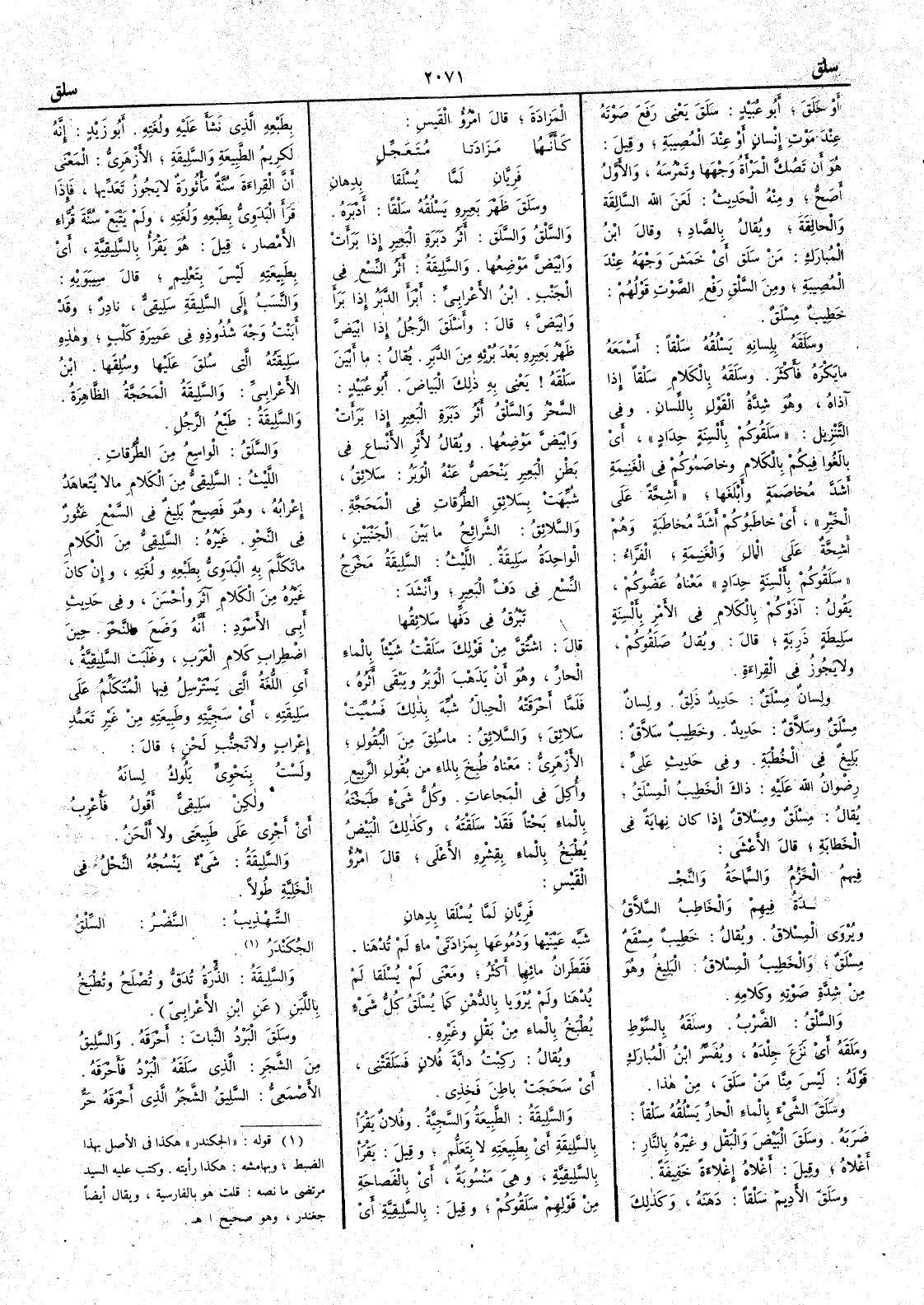 أَو حَلَق أَبو عبيد سَلَق يعني رَفَعَ صوته عند موت إِنسان أَو عند المصيبة وقيل هو أَن تَصُكِّ المرأَةُ وجْهها وتَمْرُسَه والأَول أَصح ومنه الحديث لَعَنَ اللَّهُ السالقةَ والحالِقةَ ويقال بالصاد وقال ابن المبارك مَنْ سَلَق أَي خَمَش وجهه عند المصيبة ومِنَ السَّلْقِ رَفْعِ الصوت قولُهم خَطِيب مِسْلَق سَلَقَه بلسانه يَسْلقه سَلْقاً أَسمعه ما يكره فأَكثر سَلَقه بالكلام سَلْقاً إِذا آذاه وهو شدة القول باللسان وفي التنزيل : { سَلَقُوكم بأَلْسِنة حِدادٍ } أَي بالَغُوا فيكم بالكلام وخاصَمُوكم في الغنيمة أَشَدَّ مخاصمةٍ وأَبْلَغَها أَشِحَّةً على الخير أَي خاطبوكم أَشَدَّ مُخاطبة وهم أَشحَّة على المال والغنيمة الفراء { سَلَقُوكم بأَلْسِنةٍ حِداد } معناه عَضُّوكم يقول آذَوكم بالكلام في الأَمر بأَلْسِنة سَلِيطة ذَرِبَة قال ويقال صَلَقوكم ولا يجوز في القراءة ولسان مِسْلَقٌ حديد ذَلِيقٌ ولسان مِسْلَق وسَلاَّق حديد وخَطِيب سَلاَّق بليغ في الخطبة وفي حديث عليّ رضوان اللَّه عليه ذاك الخَطِيب المِسْلَق يقال مِسْلَق مِسْلاق إِذا كان نهاية في الخَطابة قال الأَعشى فيهمُ الحَزْمُ والسَّماحةُ والنَّجْ فيهمْ والخَاطِبُ السَّلاّقُ ويروى المِسْلاق ويقال خطيب مِسْقَع مِسْلَق والخطيب المِسْلاق البليغ وهو من شدة صوته وكلامه والسَّلْق الضرب سَلَقَه بالسَّوْط ومَلَقه أَي نزع جلده ويفسر ابنُ المبارك قولَه ليس منا مَنْ سَلَق من هذا وسَلَقَ الشيءَ بالماءِ الحارْ يَسْلُقه سَلْقاً ضَرَبَه سَلَقَ البَيْضَ والبقل وغيرَه بالنار أَغلاه وقيل أَغلاه إِغْلاءَةً خفيفة وسَلَقَ الأَدِيمَ سَلْقاً دهنه وكذلك المَزادة قال امرؤُ القيس كأَنَّهما مَزادتا مُتَعَجَّلٍ فَرِيَّان لَمَّا يُسْلَقا بِدِهانٍ سَلَقَ ظهرَ بَعِيره يَسْلُقه سَلْقاً أَدْبَره السَّلْق السَّلَق أَثر دَبَرة البعير إِذا بَرَأَتْ وابيضِّ موضِعُها السَّلِيقة أَثر النِّسْع في الجنب ابن الأَعرابي أَبْرأَ الدبَرُ إِذا بَرَأَ وابيض قال أَسْلَقَ الرجلُ إِذ ابيض ظهْرُ بَعِيره بعد برئه من الدبر يقال ما أَبْيَنَ سَلْقَه يعني به ذلك البياض أَبو عبيد السَّحْر السَّلْق أَثر دبرة البعير إذ برأَت وابيض موضعها ويقال لأَثر الانْساع في بطن البعير يَنْحَصُّ عنه الوبر سَلائِق شبِّهت بِسلائِق الطُّرُقات في المحجَّة السَّلائِقُ الشرائح ما بين الجنبين الواحدة سَلِيقة الليث السَّلِيقةُ مَخْرَج النِّسْع في دَفِّ البعير وأَنشد تَبْرُقُ في دَفِّها سَلائُقُهاقال اشتقَّ من قولك سَلَقْت شيئاً بالماءِ الحارّ وهو أَن يذهب الوبر ويبقى أَثره فلما أَحرقته الحبال شبه بذلك فسُمِّيَت سَلائِقَ السَّلائق ما سُلِقَ من البقول الأَزهري معناه طُبخ بالماء من بقول الربيع وأُكِل في المجاعات وكلُّ شيءٍ طبخته بالماء بَحْتاً فقد سَلَقْته وكذلك البَيض يطبخ بالماء بقشره الأَعلى قال امرؤُ القيس فَرِيَّانِ لمَّا يُسْلَقا بدِهانشبه عينيها ودموعها بمزادتي ماءٍ لم تُدْهَنا فقَطْرانُ مائهما أَكثر ومعنى لم يُسْلَقا لم يُدْهَنا ولم يُرْوَيا بالدهن كما يُسْلَق كلُّ شيء يطبخ بالماء من بقل وغيره ويقال ركبت دابة فلان فسَلَقَتْنِي أَي سَحَجَتْ باطنَ فخذي السَّلِيقة الطبيعة والسجيَّة وفلان يقرأُ بالسَّلِيقة أَي بطبيعته لا بتعلُّم وقيل يقرأُ بالسَّلِيقِيَّة وهي منسوبة أَي بالفصاحة من قولهم سَلَقُوكم وقيل بالسَّلِيقِيَّة أَي بطَبْعِه الذي نشأَ عليه ولغته أَبو زيد إِنه لكريم الطبيعة السَّلِيقة الأَزهري المعنى أَن القراءة سُنَّة مأَثورة لا يجوز تعدِّيها فإِذا قرأَ البَدَوِيّ بطبعه ولغته ولم يتبع سُنَّة قُرَّاءِ الأَمصار قيل هو يقرأُ بالسَّلِيقِيَّة أَي بطبيعتِه ليس بتعليم قال سيبويه : والنسب إِلى السَّلِيقة سَلِيقيُّ نادر وقد أَبَنْتُ وجه شذوذه في عميرة كلب وهذه سَلِيقتُه التي سُلِقَ عليها وسُلِقَها ابن الأَعرابي السَّلِيقةُ المحَجَّة الظاهر