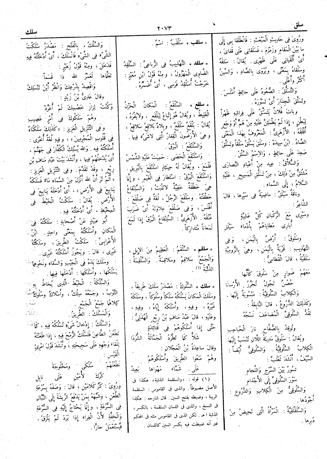 وروي في حديث المبعث فانطَلَقا بي إِلى ما بين المقام وزمزم فسَلَقاني على قفايَ أَي أَلْقياني على ظهري يقال سَلَقَه سَلْقاه بمعني ويروى بالصاد والسين أَكثر وأَعلى التَّسَلُّق الصعودُ على حائط أَملس تَسَلَّق الجدار أَي تَسوّرَه وبات فلان يَتَسَلَّق على فِراشِه ظهراً لِبَطْنٍ إِذا لم يطمئن عليه من همِّ أَو وجع أَقلقه الأَزهري المعروف بهذا المعنى الصاد ابن سيده سَلَقَ يَسْلُق سَلْقاً تَسَلَّقَ صَعِد على حائط والاسم السَّلْق السُّلاَّقُ عِيدٌ من أَعياد النصارى مشتق من ذلك مِنْ تَسَلُّقِ المسيح عليه السلام إِلى السماء وناقة سَيْلَقٌ ماضية في سيرها قال الشاعر وسَيْري مع الرُّكْبانِ كلَّ عَشِيّةٍ أُباري مَطاياهم بأَدْماءَ سَيْلَقِ سَلُوق أَرض باليمن وفي التهذيب قرية باليمن وهي بالرومية سَلَقْيَةُ قال القطامي معهم ضَوارٍ من سَلُوقَ كأَنَّها حُصُنٌ تَجُولُ تُجَرِّرُ الأَرْسانا والكلاب السلوقية منسوبة إِليها وكذلك الدروع قال النابغة تقُدُّ السُّلُوقِيَّ المُضاعَفَ نَسْجُه وتوقِد بالصُّفَّاحِ نارَ الحُباحِبِ ويقال سلوق مدينة اللاّنِ تنسب إِليها الكلاب السَّلُوقِيَّة السَّلُوقِيُّ أَيضاً السيف أَنشد ثعلب تَسُورُ بين السَّرْج واللِّجامِ سَوْرَ السَّلُوقِيِّ إِلى الأَجْذامِ السَّلُوقِيّ من الكلاب والدُّروع أَجودُها السَّلَقْلَقِيّة المرأَة التي تحيض من دُبُرِها