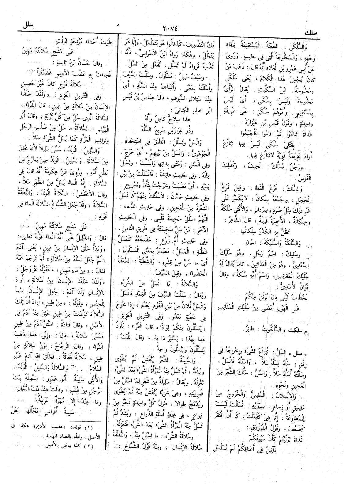 والسُّلْكى الطعنةُ المستقيمة تلقاءَ وجهه والمَخْلوجَةُ التي في جانب وروي عن أَبي عمرو بن العلاء أَنه قال ذهب من كان يُحْسِنُ هذا الكلام يعني سُلْكى ومَخْلُوجَةً ابن السكيت يقال الرأيُ مَخْلُوجةٌ وليس بسُلْكى أَي ليس بمستقيم وأَمْرُهُمْ سُلْكى على طريقة واحدة وقولُ قيس بن عَيْزارَةَ غَداةَ تَنادَوْا ثم قامُوا فأَجْمَعُوا بقَتْلِيَ سُلْكى ليس فيها تنَازُعُ أَراد عزيمة قوية لا تنازع فيها ورجل مُسَلَّكٌ نحيف وكذلك الفرس والسُّلَكُ فرخُ القَطا وقيل فَرْخُ الحَجَلِ وجمعهِ سِلْكانٌ لا يكسر على غير ذلك مثل صُرَدٍ وصِرْدانٍ والأُنثى سُلَكَةٌ وسِلْكانةٌ الأَخيرة قليلة قال الشاعر تَظَلُّ به الكُدْرُسِلْكانُها والسُّلَكَةُ والسُّلَيْكَةُ اسمان وسُليْكٌ اسم رجل وهو سُلَيْكٌ السَّعْدِيّ وهو من العَدَّائين كان يقال لهُ سلَيْك المقانِبِ واسم أمه سُلَكَةُ وقال قرّان الأَسدي لَخُطَّابُ ليْلى يالَ بُرْثُنَ مِنْكُمُ على الهَوْلِ أَمْضى من سُلَيْك المَقانِبِ ( سلكت ) السُّلْكُوتُ طائر ( سلل ) السَّلُّ انتزاعُ الشيء وإِخراجُه في رِفْق سَلَّه يَسُلُّه سَلاًّ واسْتَلَّه فانْسَلَّ وسَلَلْتُه أَسُلُّه سَلاًّ والسَّلُّ سَلُّك الشعرَ من العجين ونحوه والانْسِلالُ المُضِيُّ والخروج من مَضِيق أَو زِحامٍ سيبويه انْسَلَلْت ليست للمطاوعة إِنما هي كفَعَلْت كما أَن افْتَقَرَ كضَعُف وقول الفرزدق غَدَاةَ تَوَلَّيْتُم كأَنَّ سُيُوُفَكُم ذَآنِينُ في أَعناقِكُمْ لم تُسَلْسَل فَكَّ التضعيفَ كما قالوا هو يَتَمَلْمَلُ وإِنما هو يَتَمَلَّل وهكذا رواه ابن الأَعرابي فأَما ثعلب فرواه لم تُسَلَّل تُفَعَّل من السَّلِّ وسَيْف سَلِيلٌ مَسْلُول وسَللْت السيف وأَسْلَلْته بمعنىً وأَتيناهم عِنْدَ السَّلَّة أَي عند اسْتِلال السيوف قال حِمَاس بن قيس بن خالد الكناني هذا سِلاحٌ كامِلٌ وأَلَّهْ وذو غِرَارَيْنِ سَرِيعُ السَّلَّهْ وانْسَلَّ وتَسَلَّل انْطَلَق في استخفاء الجوهري وانْسَلَّ من بينهم أَي خرج وفي المثل رَمَتْني بِدائها وانْسَلَّتْ وتَسَلَّل مثلُه وفي حديث عائشة فانْسَلَلْتُ من بين يديه أَي مَضَيْتُ وخرجت بتَأَنٍّ وتدريج وفي حديث حَسَّان لأَسُلَّنَّك منهم كما تُسَلُّ الشَّعَرة من العجين وفي حديث الدعاء اللهم اسْلُل سَخِيمةَ قلبي وفي الحديث الآخر مَنْ سَلَّ سَخِيمَتَه في طريق الناس وفي حديث أُمِّ زَرْعٍ مَضْجَعُه كمَسَلِّ شَطْبَةٍ المَسَلُّ مصدر بمعنى المَسْلُول أَي ما سُلَّ من قشره والشَّطْبة السَّعَفة الخضراء وقيل السَّيْف والسُّلالةُ ما انْسَلَّ من الشيء ويقال سَلَلْت السيفَ من الغِمْد فانْسَلَّ وانْسَلَّ فلان من بين القوم يَعْدو إِذا خرج في خُفْية يَعْدُو وفي التنزيل العزيز يَتَسَلَّلون منكم لِوَاذاً قال الفراء يَلُوذُ هذا بهذا يَسْتَتِر ذا بذا وقال الليث يَتَسَلَّلون ويَنْسَلُّون واحدٌ والسَّلِيلةُ الشَّعَر يُنْفَش ثم يُطْوَى ويشد ثم تَسُلُّ منه المرأَة الشيءَ بعد الشيء تَغْزِله ويقال سَلِيلةٌ من شَعَر لما اسْتُلَّ من ضَريبته وهي شيء يُنْفَش منه ثم يُطْوى ويُدْمَج طِوالاً طول كل واحدة نحو من ذراع في غِلَظ أَسَلة الذراع ويُشَدُّ ثم تَسُلُّ منه المرأَةُ الشيءَ بعد الشيء فتَغْزِله وسُلالةُ الشيء ما اسْتُلَّ منه والنُّطْفة سُلالة الإِنسان ومنه قول الشماخ طَوَتْ أَحْشاءَ مُرْتِجَةٍ لوَقْتٍ على مَشَجٍ سُلالتُه مَهِينُ وقال حسان بن ثابت فجاءت به عَضْبَ الأَدِيم غَضَنْفَراً سُلالةَ فَرْجٍ كان غَيْر حَصِين وفي التنزيل العزيز ولقد خلقنا الإِنسان من سُلالةٍ من طين قال الفراء السُّلالة الذي سُلَّ من كل تُرْبة وقال أَبو الهيثم السُّلالة ما سُلَّ من صُلْب الرجل وتَرائب المرأَة كما يُسَلُّ الشيءُ سَلاًّ والسَّليل الولد سُمِّي سَليلاً لأَنه خُلق من السُّلالة والسَّلِيلُ الولد حين يخرج من بطن أُمه وروي عن عكرمة أَنه قال في السُّلالة إِنه الماء يُسَلُّ 