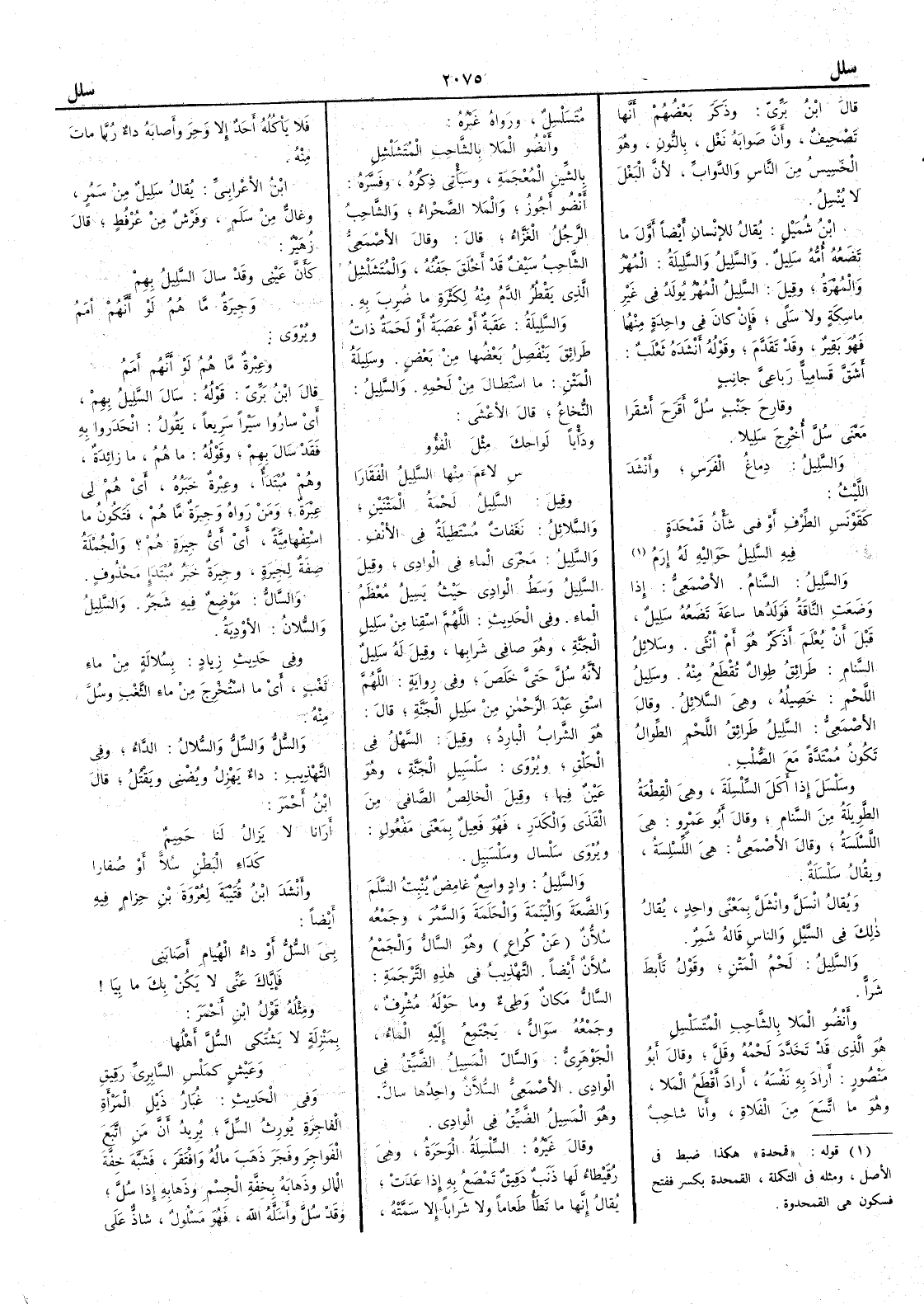 والسَّلِيلُ السَّنام الأَصمعي إِذا وَضَعَت الناقةُ فولدها ساعةَ تَضَعه سَلِيلٌ قبل أَن يُعلم أَذكر هو أَم أُنثى وسَلائِلُ السَّنام طَرائق طِوالٌ تُقْطَع منه وسَلِيلُ السَّنام طَرائق طِوالٌ تُقَطَع منه وسَلِيل اللحم خَصِيله وهي السَّلائل وقال الأَصمعي السَّلِيل طرائق اللحم الطِّوال تكون ممتدَّة مع الصُّلْب وسَلْسَلَ إِذا أَكل السِّلْسِلَة وهي القِطْعة الطويلة من السَّنام وقال أَبو عمرو هي اللَّسْلَسة وقال الأَصمعي هي اللِّسْلِسَة ويقال سَلْسَلة ويقال انْسَلَّ وانْشَلَّ بمعنى واحد يقال ذلك في السَّيل والناس قاله شمر والسَّلِيلُ لحم المَتْنِ وقول تَأَبَّطَ شَرًّا وأَنْضُو المَلا بالشَّاحِب المُتَسَلْسِل هو الذي قد تَخَدَّد لحمُه وقَلَّ وقال أَبو منصور أَراد به نفسه أَراد أَقْطَعُ المَلا وهو ما اتَّسَعَ من الفَلاة وأَنا شاحبٌ مُتَسَلْسِلٌ ورواه غيره وأَنْضُو الملا بالشاحب المُتَشَلْشِل بالشين المعجمة وسيأْتي ذكره وفَسَّره أَنْضو أَجُوزُ والمَلا الصَّحْراء والشاحب الرجل الغَزَّاء قال وقال الأَصمعي الشاحبُ سيف قد أَخْلَق جَفْنُه والمُتشَلْشِلُ الذي يَقْطُر الدمُ منه لكثرة ما ضُرِب به والسَّلِيلة عَقَبة أَو عَصَبة أَو لحمة ذات طرائق ينفصل بعضها من بعض وسَلِيلة المَتْن ما استطال من لحمه والسَّلِيل النُّخاع قال الأَعشى ودَأْياً لَواحِكَ مِثْل الفُؤو سِ لاءم منها السَّلِيلُ الفَقَارا وقيل السَّليل لحمة المَتْنَين والسَّلائل نَغَفات مستطيلة في الأَنف والسَّلِيل مَجْرَى الماء في الوادي وقيل السَّلِيل وَسَطُ الوادي حيث يَسِيل مُعْظَمُ الماء وفي الحديث اللَّهم اسْقِنا من سَلِيل الجَنَّة وهو صافي شرابها قيل له سَلِيلٌ لأَنه سُلَّ حتى خَلَص وفي رواية اللهم اسْقِ عبدَ الرَّحْمن من سَلِيل الجنَّة قال هو الشراب البارد وقيل السَّهْل في الحَلْق ويروى سَلْسَبيل الجنَّة وهو عين فيها وقيل الخالص الصافي من القَذَى والكدَر فهو فَعِيلٌ بمعنى مفعول ويروى سَلْسال وسَلْسَبيل والسَّلِيل وادٍ واسع غامض يُنْبِت السَّلَم والضَّعَة واليَنَمة والحَلَمة والسَّمُر وجمعه سُلاَّنٌ عن كراع وهو السَّالُّ والجمع سُلاَّنٌ أَيضاً التهذيب في هذه الترجمة السَّالُّ مكانٌ وَطِيءٌ وما حَوْلَه مُشْرِف وجمعه سَوالُّ يجتمع إِليه الماء الجوهري والسَّالُّ المَسِيل الضَّيِّق في الوادي الأَصمعي السُّلاّن واحدها سالٌّ وهو المَسِيل الضيّق في الوادي وقال غيره السِّلْسِلة الوَحَرةُ وهي رُقَيْطاءُ لها ذَنَبٌ دقيق تَمْصَع به إِذا عَدَتْ يقال إِنها ما تَطَأُ طعاماً ولا شَراباً إِلاَّ سَمَّتْه فلا يأْكله أَحَدٌ إِلاَّ وَحِرَ وأَصابه داءٌ رُبَّما مات منه ابن الأَعرابي يقال سَلِيلٌ من سَمُرٍ وغالٌّ من سَلَم وفَرْشٌ من عُرْفُطٍ قال زهير كأَنَّ عَيْني وقد سال السَّليلُ بِهِم وجِيرَةٌ مَّا هُمُ لو أَنَّهم أمَمُ ويروى وعِبْرةٌ مَّا هُمُ لو أَنَّهُم أمَمُ قال ابن بري قوله سَالَ السَّلِيلُ بهم أَي ساروا سيراً سريعاً يقول انْحَدَروا به فقد سَالَ بهم وقوله ما هم ما زائدة وهُمْ مبتدأ وعِبْرةٌ خبره أَي هُمْ لي عِبْرةٌ ومن رواه وجِيرَة مَّا هُم فتكون ما استفهامية أَي أَيُّ جِيرَةٍ هُم والجملة صفة لجِيرة وجِيرة خبر مبتدإِ محذوف والسَّالُّ موضع فيه شجر والسَّلِيل والسُّلاّن الأَودية وفي حديث زياد بسُلالةٍ من ماءِ ثَغْبٍ أَي ما اسْتُخْرج من ماء الثَّغْب وسُلَّ منه والسُّلُّ والسِّلُّ والسُّلال الداء وفي التهذيب داء يَهْزِل ويُضْني ويَقْتُل قال ابن أَحمر أَرَانا لا يَزال لنا حَمِيمٌ كَدَاء البَطْن سُلاًّ أَو صُفَارا وأَنشد ابن قتيبة لِعُرْوة بن حزام فيه أَيضاً بِيَ السُّلُّ أَو داءُ الهُيام أَصَابني فإِيَّاكَ عَنِّي لا يَكُن بِكَ ما بِيا ومثله قول ابن أَحمر بِمَنْزِلةٍ لا يَشْتَكِي السُّلَّ أَهْلُها وعَيْش كمَلْسِ السَّابِرِيِّ رقيق وفي الحديث غُبَارُ ذَيْل المرأَة الفا