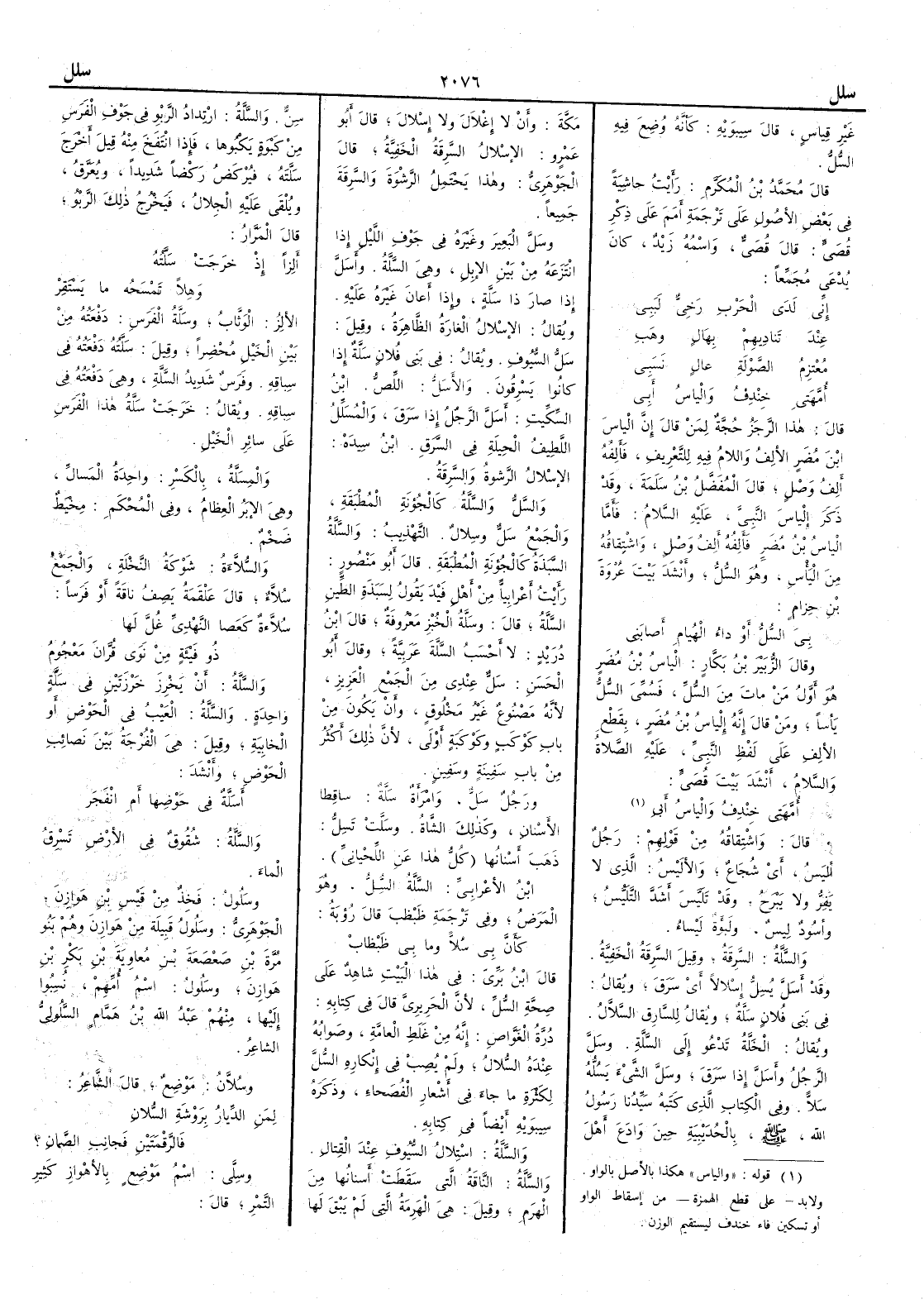 قال واشتقاقه من قولهم رجل أَليْسَ أَي شُجَاع والأَلْيَسُ الذي لا يَفِرُّ ولا يَبْرَحُ وقد تَلَيَّس أَشدَّ التلَيُّس وأُسودٌ لِيسٌ ولَبُوءَةٌ لَيْساءُ والسَّلَّةُ السَّرِقة وقيل السَّرِقة الخَفِيَّةُ وقد أَسَلَّ يُسِلُّ إِسْلالاً أَي سَرَق ويقال في بَني فلان سَلَّةٌ ويقال للسارق السَّلاَّل ويقال الخَلَّة تدعو إِلى السَّلَّة وسَلَّ الرجلُ وأَسَلَّ إِذا سَرَق وسَلَّ الشيءَ يَسُلُّه سَلاًّ وفي الكتاب الذي كَتَبه سَيِّدنا رسول الله صلى الله عليه وسلم بالحُدَيبية حين وادع أَهل مكة وأَن لا إِغلالَ ولا إِسْلال قال أَبو عمرو الإِسْلال السَّرِقة الخَفِيَّة قال الجوهري وهذا يحتمل الرَّشْوة والسرقة جميعاً وسَلَّ البعيرَ وغيرَه في جوف الليل إِذا انتزعه من بين الإِبل وهي السَّلَّة وأَسَلَّ إِذا صار ذا سَلَّة وإِذا أَعان غيره عليه ويقال الإِسْلال الغارَةُ الظاهرة وقيل سَلُّ السيوف ويقال في بني فلان سَلَّة إِذا كانوا يَسْرِقون والأَسَلُّ اللِّصُّ ابن السكيت أَسَلَّ الرجلُ إِذا سَرَق والمُسَلِّل اللطيف الحيلة في السَّرَق ابن سيده الإِسلال الرَّشوة والسرقة والسَّلُّ والسَّلَّة كالجُؤْنَة المُطْبَقَة والجمع سَلٌّ وسِلالٌ التهذيب والسَّلَّة السَّبَذَة كالجُؤْنة المُطْبقة قال أَبو منصور رأَيت أَعرابياً من أَهل فَيْد يقول لِسَبَذة الطِّين السَّلَّة قال وسَلَّةُ الخُبْز معروفة قال ابن دريد لا أَحْسَب السَّلَّة عربية وقال أَبو الحسن سَلٌّ عندي من الجمع العزيز لأَنه مصنوع غير مخلوق وأَن يكون من باب كَوْكَبٍ وكَوْكَبةٍ أَولى لأَن ذلك أَكثر من باب سَفِينةٍ وسَفِين ورجل سَلٌّ وامرأَة سَلَّة ساقطا الأَسنان وكذلك الشاة وسَلَّتْ تَسِلُّ ذهب أَسنانُها كل هذا عن اللحياني ابن الأَعرابي السَّلَّة السُّلُّ وهو المرض وفي ترجمة ظبظب قال رؤبة كأَنَّ بي سُلاًّ وما بي ظَبْظاب قال ابن بري في هذا البيت شاهد على صحة السُّلِّ لأَن الحريري قال في كتابه دُرَّة الغَوَّاص إِنه من غَلَط العامَّة وصوابه عنده السُّلال ولم يُصِبْ في إِنكاره السُّلَّ لكثرة ما جاء في أَشعار الفصحاء وذكره سيبويه أَيضاً في كتابه والسَّلَّة استلالُ السيوف عند القتال والسَّلَّة الناقة التي سَقَطَت أَسنانُها من الهَرَم وقيل هي الهَرِمة التي لم يَبْقَ لها سِنٌّ والسَّلَّة ارتداد الرَّبْو في جوف الفرس من كَبْوة يَكْبُوها فإِذا انتفخ منه قيل أَخْرَجَ سَلَّته فيُرْكَض رَكْضاً شديداً ويُعَرَّق ويُلْقَى عليه الجِلال فيخرج ذلك الرَّبْو قال المَرَّار أَلِزاً إِذ خَرَجَتْ سَلَّتُه وَهِلاً تَمْسَحُه ما يَسْتَقِر الأَلِزُ الوَثَّاب وسَلَّة الفَرَس دَفْعتُه من بين الخيل مُحْضِراً وقيل سَلَّته دَفْعته في سِباقه وفرس شديد السَّلَّة وهي دَفْعته في سِباقه ويقال خَرَجَتْ سَلَّةُ هذا الفرس على سائر الخيل والمِسَلَّة بالكسر واحدة المَسالِّ وهي الإِبَرُ العظام وفي المحكم مِخْيَطٌ ضَخْم والسُّلاَّءة شَوْكة النخلة والجمع سُلاَّءٌ قال علقمة يصف ناقة أَو فرساً سُلاَّءةٌ كعَصا النَّهْديِّ غُلَّ لها ذو فَيْئة من نَوى قُرَّان مَعْجومُ والسَّلَّة أَن يَخْرِزَ خَرْزَتَيْن في سَلَّةٍ واحدة والسَّلَّة العَيْب في الحَوْض أَو الخابية وقيل هي الفُرْجة بين نَصائب الحوض وأَنشد أَسَلَّةٌ في حَوْضِها أَم انْفَجَر والسَّلَّة شُقوق في الأَرض تَسْرِق الماء وسَلُولُ فَخِذٌ من قَيْس بن هَوازِن الجوهري وسَلُولُ قبيلة من هَوازِن وهم بنو مُرَّة بن صَعْصَعة ابن معاوية بن بكر بن هَوازن وسَلُول اسم أُمهم نُسِبوا إِليها منهم عبد الله بن هَمَّام السَّلُوليُّ الشاعر وسُلاَّن موضع قال الشاعر لِمَنِ الدِّيارُ برَوْضَةِ السُّلاَّنِ فالرَّقْمَتَيْنِ فجانِبِ الصَّمَّانِ ؟ وسِلَّى اسم موضع بالأَهواز كثير التمر قال