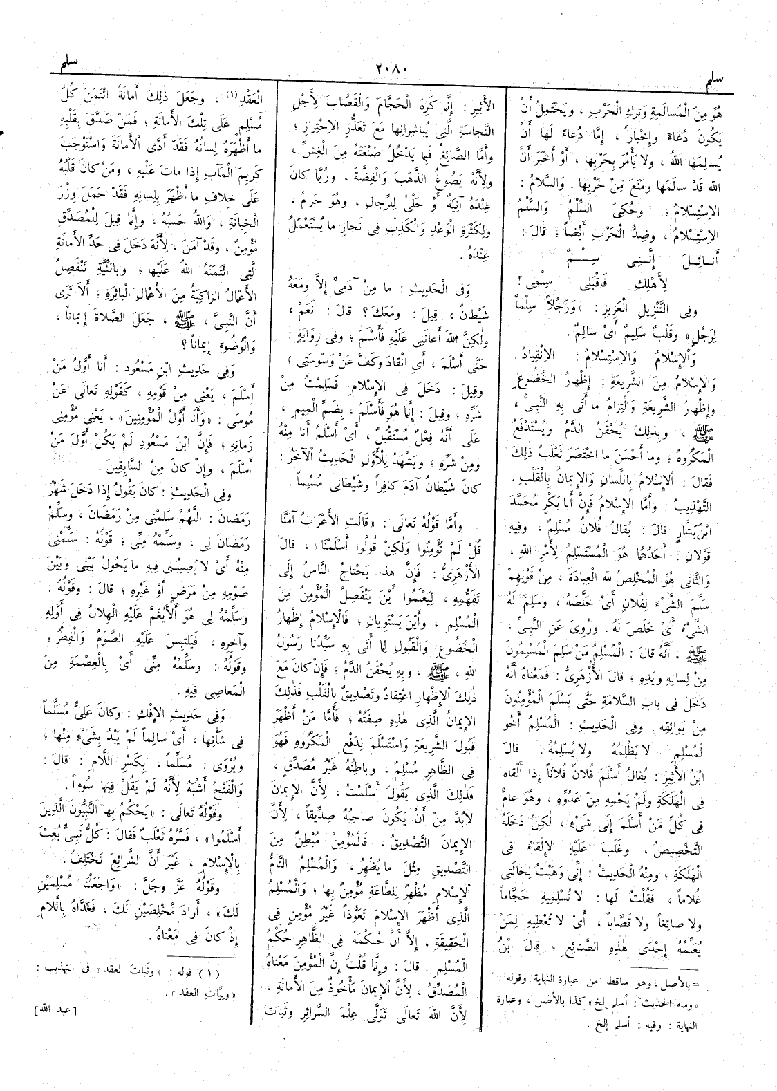 هو من المُسالَمَة ِ وترك الحرب ويحتمل أَن يكون دعاءً وإِخباراً إِما دعاءً لها أَن يُسالِمَها اللَّه ولا يأْمر بحربها أَو أَخبر أَن اللَّه قد سالَمَها ومنع من حربها السَّلامُ الاسْتِسْلامُ وحكي السِّلْمُ السَّلْمُ الاسْتِسْلامُ وضد الحرب أَيضاً ; قال أَنائِل إِنَّني سِلْمٌ لأَهْلِكِ فاقْبَلي سِلْمي وفي التنزيل العزيز { ورجلاً سِلْماً لرجل } ِ وقلب سَلِيمٌ أَي سالم الإِسْلامُ والاسْتِسْلامُ الانقياد الإِسْلامُ من الشريعة أَظهار الخضوع وإِظهار الشريعة والتزام ما أَتى به النبي وبذلك يُحْقَنُ الدم ويُسْتَدْفَعُ المكروه وما أَحسن ما اختصر ثعلب ذلك فقال الإِسْلامُ باللسان والإِيمان بالقلب التهذيب وأَما الإِسلام فإِن أَبا بكر محمد بن بشار قال يقال فلان مُسْلِمٌ وفيه قولان أَحدهما هو المُسْتَسْلِمُ لأَمر اللَّه والثاني هو المُخْلِصُ للَّه العبادة َ من قولهم سَلَّمَ الشيء َ لفلان أَي خلصه سَلِمَ له الشيء ُ أَي خَلَصَ له وروي عن النبي صلّى اللَّه عليه وسلّم أَنه قال المُسْلِمُ مَنْ سَلِمَ المُسِلمون من لسانه ويده ; قال الأَزهري فمعناه أَنه دخل في باب السَّلامَة ِ حتى يَسْلَمَ المؤمنون من بَوائقه وفي الحديث المُسْلِمُ أَخو المُسْلِمِ لا يظلمه ولا يُسْلِمُهُ قال ابن الأَثير يقال أَسْلَمَ فلانٌ فلاناً إِذا أَلقاه في الهَلَكَة ولم يَحْمِهِ من عدوِّه وهو عامٌّ في كل مَنْ أَسْلَمَ إِلى شيء لكن دخله التخصيص وغلب عليه الإِلقاء في الهَلَكَة ِ ; ومنه الحديث إِني وهبت لخالتي غلاماً فقلت لها لا تُسْلِميه حَجَّاماً ولا صائغاً ولا قَصَّاباً أَي لا تعطيه لمن يعلِّمه إِحدى هذه الصنائع ; قال ابن الأَثير إِنما كره الحَجَّامَ والقَصَّاب لأَجل النجاسة التي يباشرانها مع تعذر الاحتراز وأَما الصائغ فيما يدخل صنعته من الغش ولأَنه يصوغ الذهب والفضة وربما كان عنده آنية ٌ أَو حَلْيٌ للرجال وهو حرام ولكثرة الوعد والكذب في نجاز ما يُسْتَعْمَلُ عنده وفي الحديث ما من آدمي إِلاَّ ومعه شيطان قيل ومعك قال نعم ولكن اللَّه أَعانني عليه فأَسْلَمَ وفي رواية حتى أَسْلَمَ أَي انقاد وكَفَّ عن وَسْوَسَتي وقيل دخل في الإِسْلام فسَلِمْتُ من شره وقيل إِنما هو فأَسْلَمُ بضم الميم على أَنه فعل مستقبل أَي أَسْلَمُ أَنا منه ومن شره ويشهد للأَول الحديث الآخر كان شيطانُ آدَمَ كافراً وشيطاني مُسْلِماً وأَما قوله تعالى { قالت الأَعْرابُ آمَنَّا قل لم تؤمنوا ولكن قولوا أَسْلَمْنا } ; قال الأَزهري فإِن هذا يحتاج الناس إِلى تَفَهُّمِهِ ليعلموا أَين يَنْفَصِلُ المؤمن من المُسْلِمِ وأَين يستويان فالإِسْلامُ إِظهار الخُضُوعِ والقَبُول لما أَتى به سيدنا رسول اللَّه وبه يُحْقَنُ الدمُ فإِن كان مع ذلك الإِظهار اعتقاد وتصديق بالقلب فذلك الإِيمان الذي هذه صفته فأَما مَنْ أَظْهَرَ قَبُولَ الشَّريعة اسْتَسْلَمَ لدفع المكروه فهو في الظاهر مُسْلِمٌ وباطنه غير مُصَدِّقٍ فذلك الذي يقول أَسلمت لأَن الإِيمان لا بُدَّ من أَن يكون صاحبه صِدِّيقاً لأَن الإِيمان التَّصْديقُ فالمؤمن مُبْطِنٌ من التصديق مثل ما يُظْهِرُ المُسْلِمُ التامّ الإِسْلامِ مُظْهِرٌ للطاعة مؤمن بها المُسْلِمُ الذي أَظهرالإِسلام تَعَوّذاً غير مؤمن في الحقيقة إِلا أَن حكمه في الظاهر حكم المُسْلِمِ قال وإِنما قلت إِن المؤمن معناه المُصَدِّقُ لأَن الإِيمان مأْخوذ من الأَمانَة لأَن اللَّه تعالى تَوَلَّى عِلْم السَّرائر وثَبات العَقْدِ وجعل ذلك أَمانة ائتمن كلَّ مُسْلِمٍ على تلك الأَمانة فمن صَدَّقَ بقلبه ما أَظهره لسانُه فقد أَدَّى الأَمانة واستوجب كريم المآب إِذا مات عليه ومن كان قلبه على خلاف ما أَظهر بلسانه فقد حمل وِزْرَ الخيانة واللَّه حسبه وإِنما قيل للمُصَدِّق مؤمن وقد آمن لأَنه دخل في حد الأَمانة التي ائتمنه اللَّه عليها وبالنية تنفصل الأَعمال الزاكية من الأَعمال البائرة أَلا ترى أَن النبي جَعَلَ الصلاة َ إِيماناً والوضوءَ 