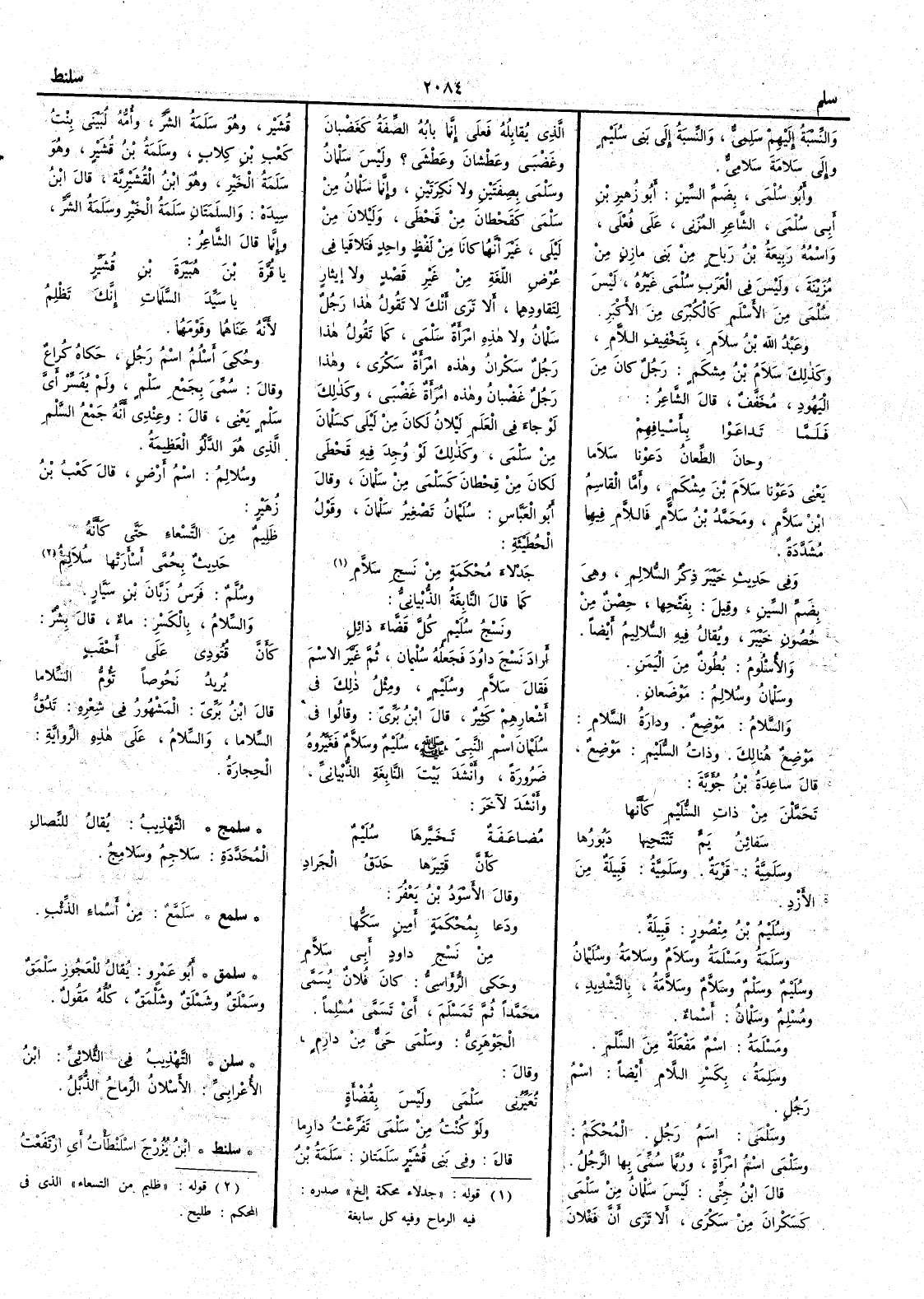 والنسبة إِليهم سَلِمِيٌّ والنسبة إِلى بني سُلَيْمٍ وإِلى سَلامَة َ سَلامِيٌّ أَبو سُلْمى بضم السين أَبو زُهَيْر بن أَبي سُلْمى الشاعر المُزَنيّ على فُعْلى واسمه رَبيعَة ُ بن رَباحٍ من بني مازِنٍ من مُزَيْنَة َ وليس في العرب سُلْمى غيره ليس سُلْمى من الأَسْلَمِ كالكُبْرى من الأَكْبَرِ عبد اللَّه بن سَلامٍ بتخفيف اللام وكذلك سَلامُ بن مِشْكَم رجل كان من اليهود مخفف ; قال الشاعر فلما تَداعَوْا بأَسْيافِهِمْ وحانَ الطِّعانُ دَعَوْنا سَلاما يعني دَعَوْنا سَلامَ بن مِشْكَمٍ وأَما القاسم بن سَلاّمٍ محمد ابن سَلاَّمٍ فاللام فيهما مشددة وفي حديث خَيْبَر ذكر السُّلالِم ; هي بضم السين وقيل بفتحها حِصْنٌ من حصُون خَيْبَرَ ويقال فيه السُّلالِيمُ أَيضاً والأُسْلُومُ بطون من اليمن سَلْمانُ سُلالِمُ موضعان السَّلامُ موضع ودارة السَّلامِ موضع هنالك وذات السُّلَيْمِ موضع ; قال ساعدة ُ بن جُؤَيَّة َ تَحَمَّلْنَ من ذاتِ السُّلَيْمِ كأَنها سَفائِنُ يَمَ تَنْتَحِيها دَبُورُها سَلَمِيَّة ُ قرية سَلَمِيَّة ُ قبيلة من الأَزْدِ سُلَيْمُ بن منصور قبيلة سَلَمَة ُ مَسْلَمَة ُ سَلامٌ سَلامَة ُ سُلَيْمانُ سُلَيْمٌ سَلْمٌ سَلاَّمٌ سَلاَّمَة ُ بالتشديد ومُسْلِمٌ سَلْمانُ أَسماء مَسْلَمَة ُ اسمٌ مَفْعَلَة ٌ من السَّلْمِ سَلِمَة ُ بكسر اللام أَيضاً اسم رجل سَلْمى اسم رجل المحكم سَلْمى اسم امرأَة وربما سمي بها الرجل قال ابن جني ليس سَلْمانُ من سَلْمى كسَكْرانَ من سَكْرى أَلا ترى أَن فَعْلان الذي يقابله فَعْلى إِنما بابه الصفة كغَضْبان وعَضْبى وعَطْشان وعَطْشى وليس سَلْمان سَلْمى بصفتين ولا نكرتين وإِنما سَلْمان من سَلْمى كقَحْطان من قَحْطى ولَيْلان من لَيْلى غير أَنهما كانا من لفظ واحد فتلاقيا في عُرْضِ اللغة من غير قصد ولا إِيثار لتقاوُدِهما أَلا ترى أَنك لا تقول هذا رجل سَلْمان ولا هذه امرأَة سَلْمى كما تقول هذا رجل سَكْران وهذه امرأَة سَكْرى وهذا رجل غَضْبان وهذه امرأَة غَضْبى وكذلك لو جاء في العَلَمِ لَيْلان لكان من لَيْلى كسَلْمان من سَلْمى وكذلك لو وجد فيه قَحْطى لكان من قَحْطان كسَلْمى من سَلْمان وقال أَبو العباس سُلَيْمان تصغير سَلْمان ; وقول الحُطَيْئة ِ جَدْلاءَ مُحْكَمَة ٍ من نَسجِ سَلاَّمِ كما قال النابغة الذُّبْيانيّ ونَسْج سُلَيْمٍ كلّ قَضّاء ذائِلأَراد نَسْجَ داود فجعله سُلَيْمانَ ثم غَيَّرَ الاسم فقال سَلاَّم سُلَيْم ومثل ذلك في أَشعارهم كثير ; قال ابن بري وقالوا في سُلَيْمانَ اسم النبي سُلَيْمٌ سَلاّمٌ فغيروه ضرورة ; وأَنشد بيت النابغة الذُّبْياني وأَنشد لآخر مُضاعَفَة تَخَيَّرَها سُلَيْمٌ كأَنَّ قَتِيرَها حَدَقُ الجَرادِ وقال الأَسود بن يَعْفُرَ ودَعا بمُحْكَمَة ٍ أَمينٍ سَكُّها من نَسْجِ داودٍ أَبي سلاَّمِ وحكى الرُّؤاسي كان فلان يُسَمّى محمداً ثم تَمَسْلَم أَي تَسَمَّى مُسْلِماً الجوهري سَلْمَى حَيٌّ من دارِم ; وقال تُعَيِّرُني سَلْمى وليس بقُضأَة ٍ ولو كنتُ من سَلْمَى تَفَرَّعْتُ دارِما قال وفي بني قُشَيْرٍ سَلَمَتان سَلَمَة ُ بن قُشَير وهو سَلَمَة ُ الشَّرِّ وأُمُّه لُبَيْنَى بنت كعب بن كلابٍ وسَلَمَة ُ بن قُشَيْرٍ وهو سَلَمَة الخير وهو ابن القُشَيْرِيَّة ; قال ابن سيده السَّلَمَتانِ سَلَمَة ُالخير وسَلَمَة ُ الشرّ وإِنما قال الشاعر يا قُرَّة َ بنَ هُبَيْرَة َ بنِ قُشَيْرٍ يا سَيِّدَ السَّلَماتِ إِنك تَظْلمُ لأَنه عناهما وقوَمهما وحكي أَسْلُم اسم رجل ; حكاه كراع وقال سمي بجمع سَلْمٍ ولم يفسر أَيّ سَلْمٍ يعني قال وعندي أَنه جمع السَّلْمِ الذي هو الدلو العظيمة سِلاَلِمُ اسم أَرض ; قال كعبُ بن زُهيرٍ ظَلِيمٌ من التَّسْعاء حتى كأَنه حَدِيث بِحُمَّى أَسْأَرَتْها سُلالِمُ سُلَّمٌ فرس زَبَّانَ بن سَيَّارٍ السَّلامُ بالكسر ماء ; قال بشر كأَنَّ قُتُودِي على أَحْقَبٍ يُريدُ نَحُوصاً تَؤُمُّ السِّلاما قال ابن بري المشهور في شعره تَدُقُّ 