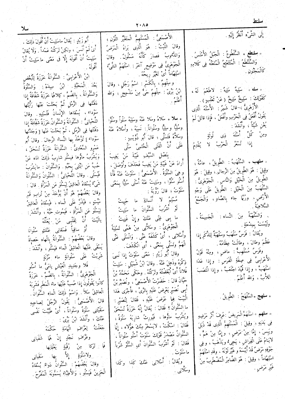 إِلى الشيء أَنظر إِليه ( سلنطع ) السُّلْطُوعُ الجَبل الأَملس والسَّلَنْطَعُ المُتَتَعْتِعُ المُتَعَتِّه في كلامه كالمجنون ( سله ) سَليهٌ مَليهٌ لا طعم له كقولك سَلِيخٌ مَليخٌ عن ثعلب الأَزهري قال شمر الأَسْلَهُ الذي يقول أَفعل في الحرب وأَفعل فإذا قاتل لم يُغْنِ شيئاً وأَنشد ومن كلِّ أَسْلَهَ ذي لُوثَةٍ إذا تُسْعَرُ الحَرْبُ لا يُقْدِمُ ( سلهب ) السَّلْهَبُ الطويلُ عامَّةً وقيل هو الطويلُ من الرجال وقيل هو الطويلُ من الخيلِ والناس الجوهري السَّلْهَبُ من الخيلِ الطويلُ على وجهِ الأَرض وربما جاءَ بالصادِ والجمع السَّلاهِبَةُ والسَّلْهَبةُ من النساءِ الجَسِيمةُ وليست بِمدْحَةٍ ويقال فَرَسٌ سَلْهَبٌ وسَلْهَبةٌ للذَّكَر إِذا عَظُم وطالَ وطالَتْ عِظَامُه وفَرَسٌ مُسْلَهِبٌّ ماضٍ ومنه قولُ الأَعرابيِّ في صِفَةِ الفَرَس وإِذا عَدَا اسْلَهَبَّ وإِذا قُيِّدَ اجْلَعَبَّ وإِذا انْتَصَبَ اتْلأَبَّ واللّه أَعلم ( سلهج ) السَّلْهَجُ الطويل ( سلهم ) اسلَهَمَّ المريضُ عُرِف أَثَرُ مَرَضِه في بدَنهِ وقيل المُسْلَهِمُّ الذي قد ذَبَلَ ويَبِس إِمَّا من مَرَض وإِمَّا من همّ لا يَنام على الفراش يجيء ويذهَب وفي جوفه مرض قد أَيْبَسَه وغَيَّر لَوْنه وقد اسْلَهَمَّ اسْلِهْماماً وقيل هو الضامر المضطرب من غير مرض الأَصمعي المُسْلَهِمُّ المتغيِّر اللَّوْن وقال الليث هو الذي براه المرض والدُّؤوب فصار كأَنه مَسْلول وقال الجوهري في موضع آخر اسْلَهَمَّ الشيء اسْلِهْماماً أَي تَغَيَّرَ رِيحُه وسِلْهِمٌ بالكسر اسم رجل وقال ابن بري سِلْهِم حيّ من مَذْحجٍ والله أَعلم ( سلا ) سَلاهُ وسَلا عنه وسَلِيَه سَلْواً وسُلُوّاً وسُلِيّاً وسِلِيّاً وسُلْواناً نَسِيَه وأَسْلاهُ عنه وسَلاَّه فتَسَلَّى قال أَبو ذؤيب على أَن الفتى الخُثَمِيَّ سَلَّى بنَصْل السيفِ غَيْبة من يَغِيب أَراد عن غَيْبة من يَغِيب فحذف وأَوْصل وهي السَّلْوة الأَصمعي سَلَوْتُ عنه فأَنا أَسْلُو سُلُوّاً وسَلِىتُ عنه أَسْلى سُلِيّاً بمعنى سَلَوْت قال رؤبة مسْلم لا أَنْساك ما حَييتُ لو أَشرَبُ السُّلْوان ما سَلِيتُ ما بي غِنىً عنك وإن غَنِيتُ الجوهري وسَلاَّني من همِّي تَسلِيةً وأَسْلاني أَي كشَفَه عني وانْسَلَى عن الهَمُّ وتَسَلَّى يمعنًى أَي انكشَف وقال أَبو زيد معنى سَلَوْت إذا نَسِيَ ذكْره وذَهِلَ عنه وقال ابن شميل سَلِيت فلاناً أَي أَبْغَضْته وتركْته وحكى محمد بن حيان قال حضرْت الأَصمعي ونُصَيْرُ بنُ أَبي نُصَيرٍ يَعْرِض عليه بالرَّيِّ فأَجرى هذا البيت فيما عرض عليه فقال لنُصَير ما السُّلْوانُ ؟ فقال يقال إنه خَرَزةٌ تُسْحَق ويُشرَب ماؤُها فيورِث شارِبَه سَلْوةً فقال اسكُتْ لا يَسخَرْ منك هؤلاء إنما السُّلْوانُ مصدر قولك سَلَوْت أَسْلُو سُلْواناً فقال لو أَشْرب السُلْوان أَي السُّلُوَّ شُرْباً ما سَلَوْتُ ويقال أَسْلاني عنك كذا وكذا وسَلاَّني أَبو زيد يقال ما سَلِيتُ أَن أَقولَ ذلك أَي لم أَنْسَ ولكن ترَكْتهُ عَمْداً ولا يقال سَلِيتُ أَن أَقوله إلاَّ في معنى ما سَلِيت أَن أَقوله ابن الأَعرابي السُّلْوانَة خََرزَةٌ للبُغْضِ بعد المَحبَّة ابن سيده والسَّلْوَة والسُّلْوانة بالضم كلاهما خَرَزة شَفَّافَة إذا دَفَنُتها في الرمل ثم بَحَثْت عنها رأَيْتها سوداء يُسْقاها الإنسانُ فتُسْلِىه وقال اللحياني السُّلْوانةُ والسُّلْوانُ خَرَزة شفَّافة إذا دفَنْتها في الرمل ثم بَحَثْت عنها تُؤَخِّذُ بها النِّساءُ الرجالَ وقال أَبو عمرو السَّعْدي السُّلْوانة خَرَزة تُسْحَق ويُشْرَبُ ماؤُها فيَسْلُو شارِبُ ذلك الماءِ عن حُبِّ من ابْتُلِيَ بحُبِّه والسُّلْوانُ مايُشْرَبُ فيُسَلِّي وقال اللحياني السُّلْوانُ والسُّلْوانةُ شيءٌ يُسْقاهُ العاشِقُ ليَسْلُوَ عن المرأَة قال وقال بعضهم هو أَن يُؤْخَذَ من ترابِ قَبرِ مَيِّتٍ فيُذَرَّ على الماء فيُسْقاهُ العاشِقُ ليَسْلوَ عن المرأَة فيَموتَ حُبُّه وأَنش