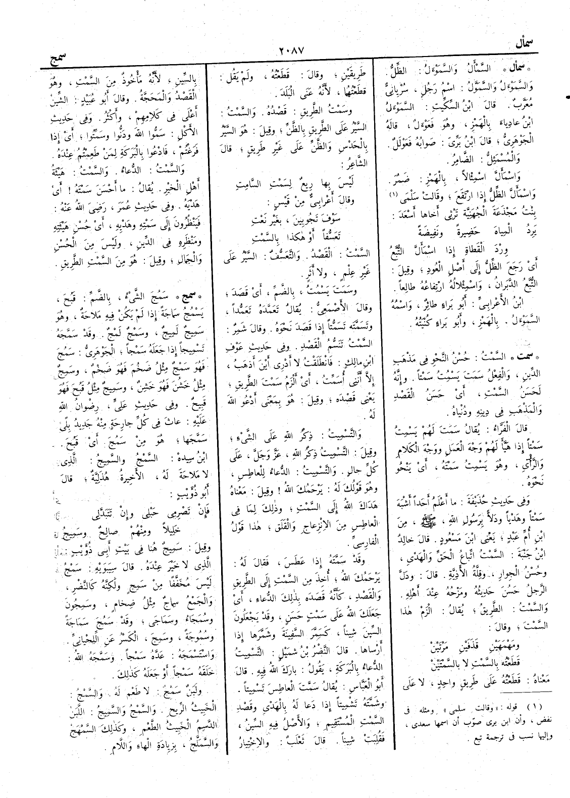 ( سمت ) السَّمْتُ حُسْنُ النَّحْو في مَذْهَبِ الدِّينِ والفعلُ سَمَتَ يَسْمُِتُ سَمْتاً وإِنه لحَسَنُ السَّمْت أَي حَسَنُ القَصْدِ والمَذْهَب في دينه ودنْياه قال الفراء يقال سَمَتَ لهم يَسْمِتُ سَمْتاً إِذا هَيَّأَ لهم وَجْهَ العَمَل ووَجْهَ الكلام والرأْي وهو يَسْمِتُ سَمْتَه أَي يَنْحُو نَحْوَه وفي حديث حذيفة ما أَعْلَم أَحداً أَشْبَهَ سَمْتاً وهَدْياً ودلأً برسول الله صلى الله عليه وسلم من ابن أُمِّ عَبْدٍ يعني ابن مسعود قال خالد بنُ جَنْبةَ السَّمْتُ اتِّباعُ الحَقِّ والهَدْيِ وحُسْنُ الجِوارِ وقِلةُ الأَذِيَّةِ قال ودَلَّ الرَّجلُ حَسُنَ حديثُه ومَزْحُه عند أَهله والسَّمْتُ الطريقُ يقال الْزَمْ هذا السَّمْتَ وقال ومَهْمَهَيْنِ قَذَفَيْنِ مَرَّتَيْن قَطَعْتُه بالسَّمْتِ لا بالسَّمْتَيْن معناه قَطَعْتُه على طريق واحدٍ لا على طَريقَين وقال قَطَعْتُه ولم يقل قطَعْتُهما لأَِنه عنى البلَد وسَمْتُ الطريقِ قَصْدُه والسَّمْتُ السَّيْرُ على الطَّريق بالظَّنّ وقيل هو السَّيْرُ بالحَدْس والظن على غير طريق قال الشاعر ليس بها رِيعٌ لِسَمْتِ السَّامِتِ وقال أَعرابيّ من قَيْسٍ سوف تَجوبِين بغَير نَعْتِ تَعَسُّفاً أَو هكذا بالسَّمْتِ السَّمْتُ القَصْدُ والتَّعَسُّفُ السَّير على غير عِلْم ولا أَثَرٍ وسَمَتَ يَسْمُتُ بالضم أَي قَصَدَ وقال الأَصمعي يقال تعمَّده تعمُّداً وتَسَمَّتَه تَسَمُّتاً إِذا قَصَدَ نَحْوَه وقال شمر السَّمْتُ تَنَسُّمُ القَصْدِ وفي حديث عوف بن مالك فانطلقت لا أَدري أَين أَذهَبُ إِلاّ أَنني أُسَمِّتُ أَي أَلْزَمُ سَمْتَ الطريق يعني قَصْدَه وقيل هو بمعنى أَدْعُو اللهَ له والتَّسْمِيتُ ذِكْرُ الله على الشيءِ وقيل التَسْمِيتُ ذكر الله عز وجل على كل حال والتَّسْمِيتُ الدُّعاء للعاطِس وهو قولك له يَرْحَمُكَ الله وقيل معناه هَدَاك اللهُ إِلى السَّمْت وذلك لما في العاطس من الانزِعاج والقَلَق هذا قول الفارسي وقد سَمَّتَه إِذا عَطَسَ فقال له يَرْحَمُك اللهُ أُخِذَ من السَّمْتِ إِلى الطريقِ والقَصْدِ كأَنه قَصَدَه بذلك الدعاء أَي جَعَلَكَ اللهُ على سَمْتٍ حَسَنٍ وقد يجعلون السين شيناً كسَمَّر السفينة وشَمَّرها إِذا أَرْساها قال النَّضْرُ بن شُمَيْل التَّسْميتُ الدعاء بالبَركة يقول بارك الله فيه قال أَبو العباس يقال سَمَّتَ العاطِسَ تَسْميتاً وشَمَّتَه تَشْميتاً إِذا دعا له بالهَدْيِ وقَصْدِ السَّمْتِ المستقيم والأَصل فيه السين فقُلِبَتْ شيناً قال ثعلب والاختيار بالسين لأَنه مأْخوذ من السَّمْتِ وهو القَّسْدُ والمَحَجَّة وقال أَبو عبيد الشين أَعلة في كلامهم وأَكثر وفي حديث الأَكل سَمُّوا اللهَ ودَنُّوا وسَمِّتُوا أَي إِذا فَرَغْتم فادْعُوا بالبركة لِمَن طَعِمْتُم عنده والسَّمْتُ الدُّعاء والسَّمْتُ هيئة أَهل الخير يقال ما أَحْسَنَ سَمْتَه أَي هَدْيه وفي حديث عمر رضي الله عنه فينظرون إِلى سَمْتِه وهَدْيه أَي حُسْنِ هيئته ومَنْظَرِه في الدين وليس من الحُسْنِ والجمال وقيل هو من السَّمْتِ الطريق