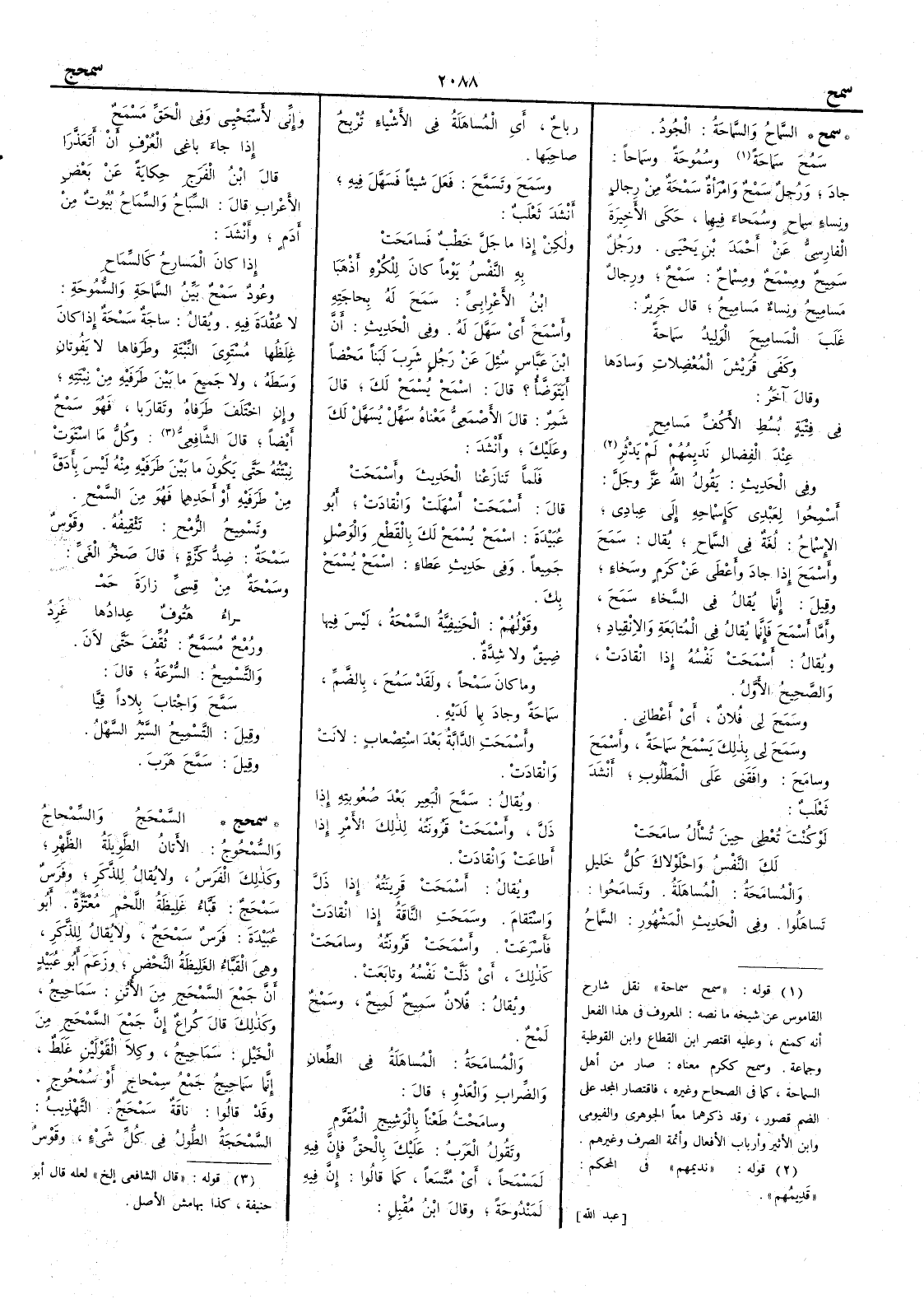 ( * قوله « سمح سماحة » نقل شارح القاموس عن شيخه ما نصه المعروف في هذا الفعل أنه كمنع وعليه اقتصر ابن القطاع وابن القوطية وجماعة وسمح ككرم معناه صار من أهل السماحة كما في الصحاح وغيره فاقتصار المجد على الضم قصور وقد ذكرهما معاً الجوهري والفيومي وابن الأثير وأرباب الأفعال وأئمة الصرف وغيرهم ) وسُمُوحة وسَماحاً جاد ورجلٌ سَمْحٌ وامرأشة سَمْحة من رجال ونساء سِماح وسُمَحاء فيهما حكى الأَخيرة الفارسي عن أَحمد بن يحيى ورجل سَمِيحٌ ومِسْمَح ومِسْماحٌ سَمْح ورجال مَسامِيحُ ونساء مَسامِيحُ قال جرير غَلَبَ المَسامِيحَ الوَلِيدُ سَماحةً وكَفى قُريشَ المُعضِلاتِ وَسادَها وقال آخر في فِتْيَةٍ بُسُطِ الأَكُفِّ مَسامِحٍ عندَ الفِضالِ نَدِيمُهم لم يَدْثُرِ وفي الحديث يقول الله عز وجل أَسْمِحُوا لعبدي كإِسماحه إِلى عبادي الإِسماح لغة في السَّماحِ يقال سَمَحَ وأَسْمَحَ إِذا جاد وأَعطى عن كَرَمٍ وسَخاءٍ وقيل إِنما يقال في السَّخاء سَمَح وأَما أَسْمَح فإِنما يقال في المتابعة والانقياد ويقال أَسْمَحَتْ نَفْسُه إِذا انقادت والصحيح الأَول وسَمَح لي فلان أَي أَعطاني وسَمَح لي بذلك يَسْمَحُ سَماحة وأَسْمَح وسامَحَ وافَقَني على المطلوب أَنشد ثعلب لو كنتَ تُعْطِي حين تُسْأَلُ سامَحَتْ لك النَّفسُ واحْلَولاكَ كلُّ خَليلِ والمُسامَحة المُساهَلة وتَسامحوا تَساهَلوا وفي الحديث المشهور السَّماحُ رَباحٌ أَي المُساهلة في الأَشياء تُرْبِحُ صاحبَها وسَمَحَ وتَسَمَّحَ فَعَلَ شيئاً فَسَهَّل فيه أَنشد ثعلب ولكنْ إِذا ما جَلَّ خَطْبٌ فسامَحَتْ به النفسُ يوماً كان للكُرْه أَذْهَبا ابن الأَعرابي سَمَح له بحاجته وأَسْمَح أَي سَهَّل له وفي الحديث أَن ابن عباس سئل عن رجل شرب لبناً مَحْضاً أَيَتَوَضَّأُ ؟ قال اسْمَحْ يُسْمَحْ لك قال شمر قال الأَصمعي معناه سَهِّلْ يُسَهَّلْ لك وعليك وأَنشد فلما تنازعْنا الحديثَ وأَسْمَحتْ قال أَسْمَحتْ أَسهلت وانقادت أَبو عبيدة اسْمَحْ يُسْمَحْ لك بالقَطْع والوصل جميعاً وفي حديث عطاء اسْمَحْ يُسْمَحْ بك وقولهم الحَنِيفِيَّة السَّمْحة ليس فيها ضيق ولا شدة وما كان سَمْحاً ولقد سَمُحَ بالضم سَماحة وجاد بما لديه وأَسْمَحَتِ الدابة بعد استصعاب لانت وانقادت ويقال سَمَّحَ اللبعير بعد صُعوبته إِذا ذلَّ وأَسْمَحتْ قَرُونَتُه لذلك الأَمر إِذا أَطاعت وانقادت ويقال أَسْمَحَتْ قَرِينتُه إِذا ذلَّ واستقام وسَمَحَتِ الناقة إِذا انقادت فأَسرعت وأَسْمَحَتْ قَرُونَتُه وسامحت كذلك أَي ذلت نفسه وتابعت ويقال فلانٌ سَمِيحٌ لَمِيحٌ وسَمْحٌ لَمْحٌ والمُسامحة المُساهَلة في الطِّعان والضِّراب والعَدْو قال وسامَحْتُ طَعْناً بالوَشِيجِ المُقَوَّم وتقول العرب عليك بالحق فإِن فيه لَمَسْمَحاً أَي مُتَّسَعاً كما قالوا إِن فيه لَمَندُوحةً وقال ابن مُقْبل وإِن لأَسْتَحْيِي وفي الحَقِّ مَسْمَحٌ إِذا جاءَ باغِي العُرْفِ أَن أَتَعَذَّرا قال ابن الفرج حكايةً عن بعض الأَعراب قال السِّباحُ والسِّماحُ بيوت من أَدَمٍ وأَنشد إِذا كان المَسارِحُ كالسِّماحِ وعُودٌ سَمْح بَيِّنُ السَّماحةِ والسُّموحةِ لا عُقْدَة فيه ويقال ساجةٌ سَمْحة إِذا كان غِلَظُها مُسْتَويَ النَّبْتَةِ وطرفاها لا يفوتان وَسَطَه ولا جميعَ ما بين طرفيه من نِبْتته وإِن اختلف طرفاه وتقاربا فهو سَمْحٌ أَيضاً قال الشافعي